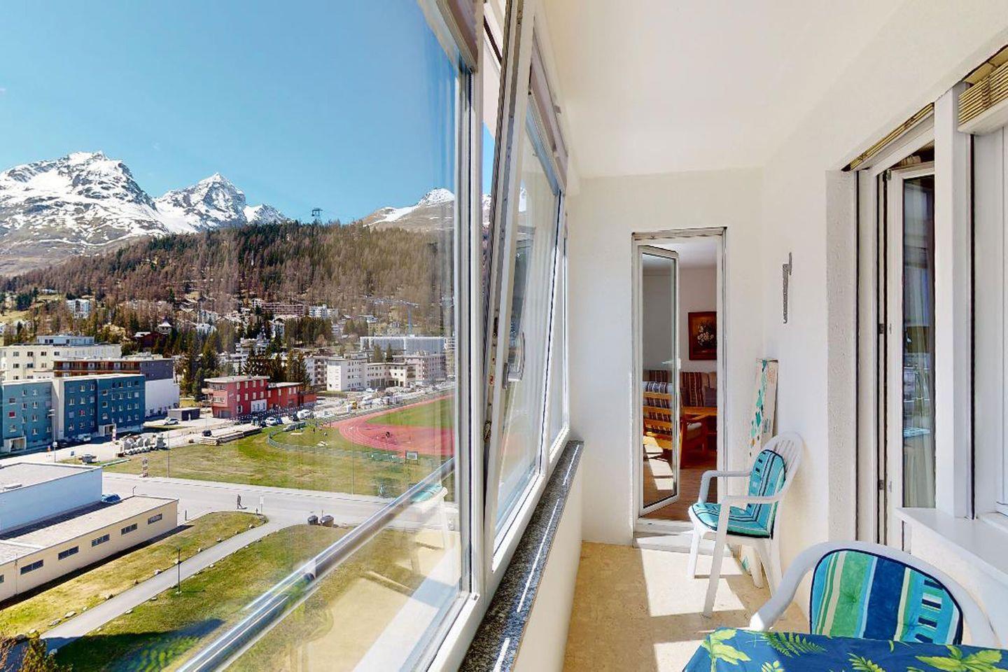 3.5-Zimmerwohnung im 7. Stock in St. Moritz-Bad mit renovierter Küche (2023). Zwei Schlafzimmer, großzügiges Wohnzimmer, Wintergarten, schöne Aussicht. Gemeinschaftswaschküche, Velo- und Skiraum, Garagenplatz optional.