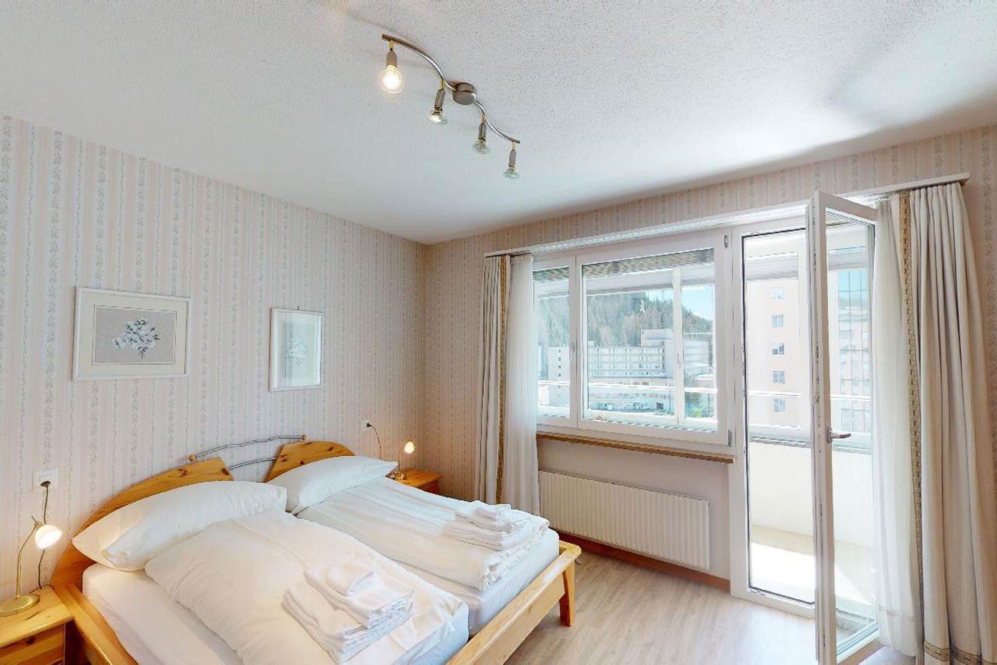 Die Wohnung verfügt über ein grosszügiges Wohnzimmer mit Sitzecke, Fernseher, Internet sowie Esstisch. Die Küche ist komplett ausgestattet. Es gibt zwei Schlafzimmer mit jeweils einem Doppelbett und Schrank. Das Badezimmer hat eine Badewanne. Zudem steht ein weiteres Gäste-WC zur Verfügung. Vom Wohnzimmer sowie von einem Schlafzimmer gelangt man auf den gemütlichen Wintergarten. Trotz dem "Stadt-Feeling" in St. Moritz-Bad, bietet die Wohnung aufgrund der Lage im 7. Stock eine schöne Aussicht auf die Engadiner Bergwelt.