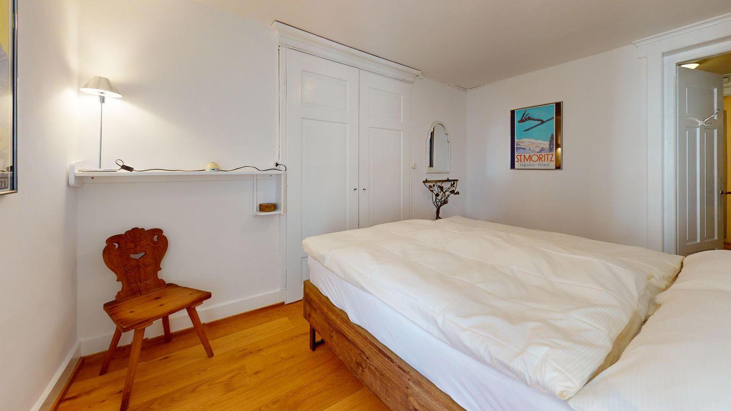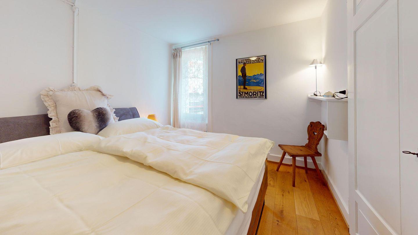 Geschmackvolle 3.5-Zimmer-Wohnung in St. Moritz, teilrenoviert mit Holzparkett, modernen und rustikalen Möbeln. Zwei Schlafzimmer mit neuen Betten, funktionale Küche und Abstellraum. Aussenparkplatz und gemeinschaftliche Waschmöglichkeit.