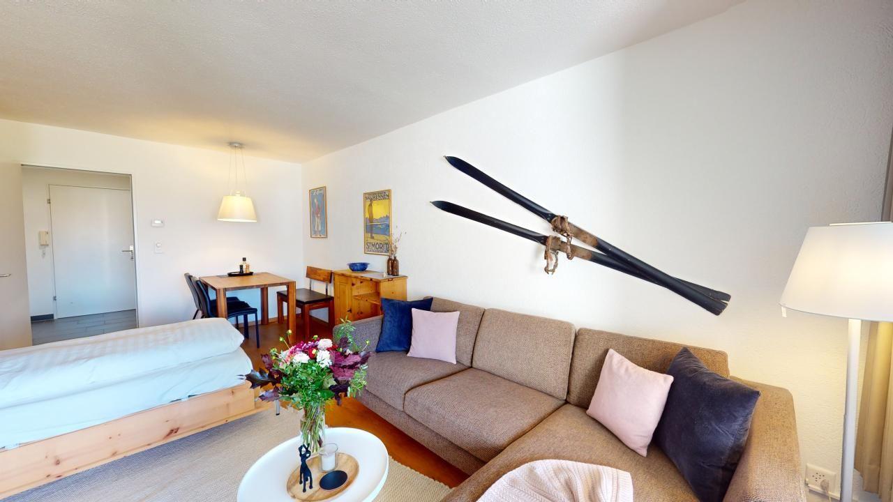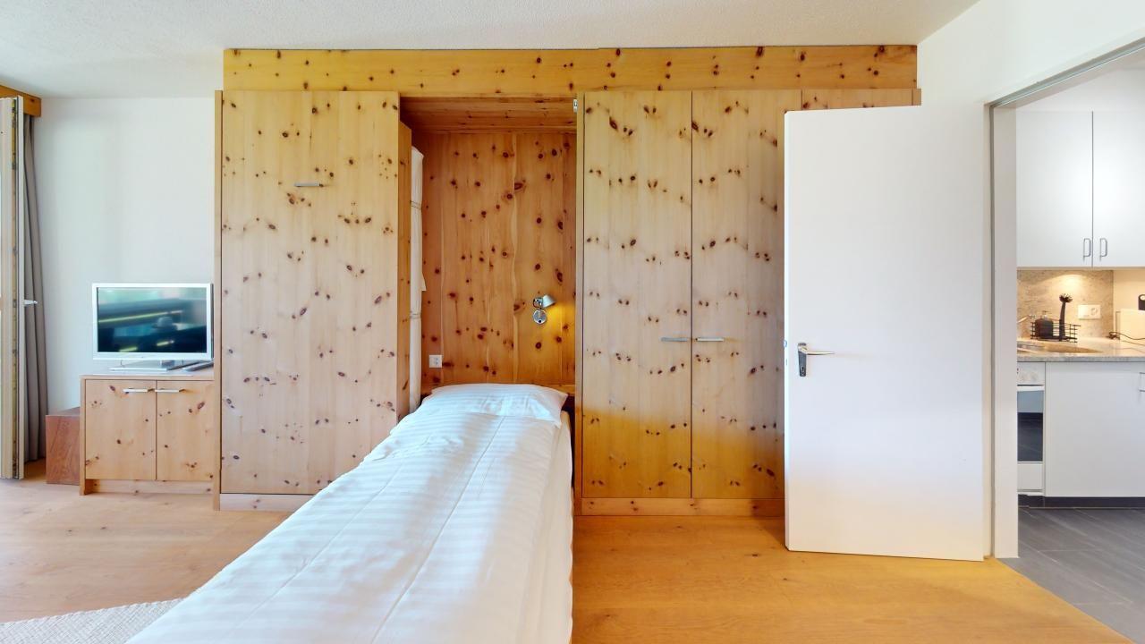 Gemütliche 1- Zimmer-Ferienwohnung im 3. Stock. Liebevoll renoviertes Wohn- /Esszimmer mit wohlriechendem Arvenholz. Überdachter Balkon mit Verglasung die je nach Witterung geöffnet/geschlossen werden kann. Kleine Küche, Bad mit Dusche, Wohn- /Esszimmer mit 2 integrierte Schrankbett 80/200cm. Im Ferienhaus befindet sich ein Lift. Beschränkte Anzahl Aussenparkplätze (max. 1 Auto/Wohnung, nicht reserviert). Fitnessraum zur öffentlichen Nutzung befindet sich im Ferien-Wohnhaus.