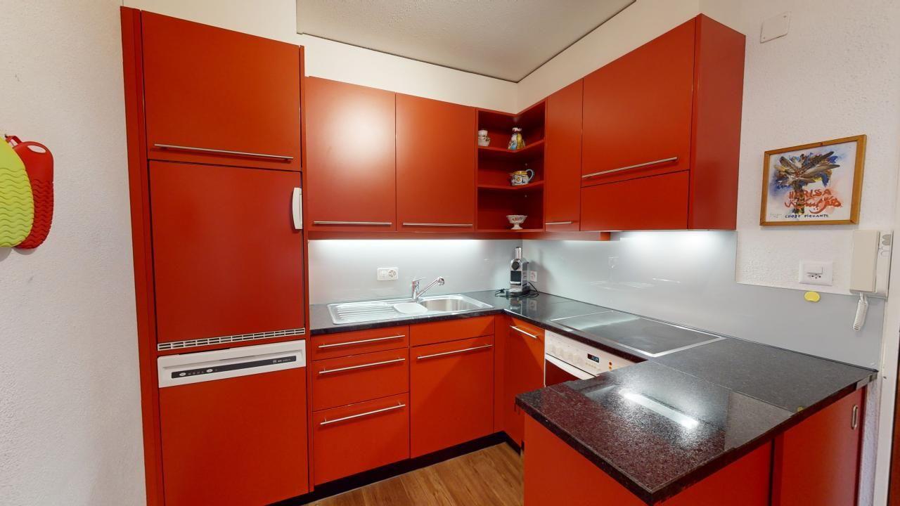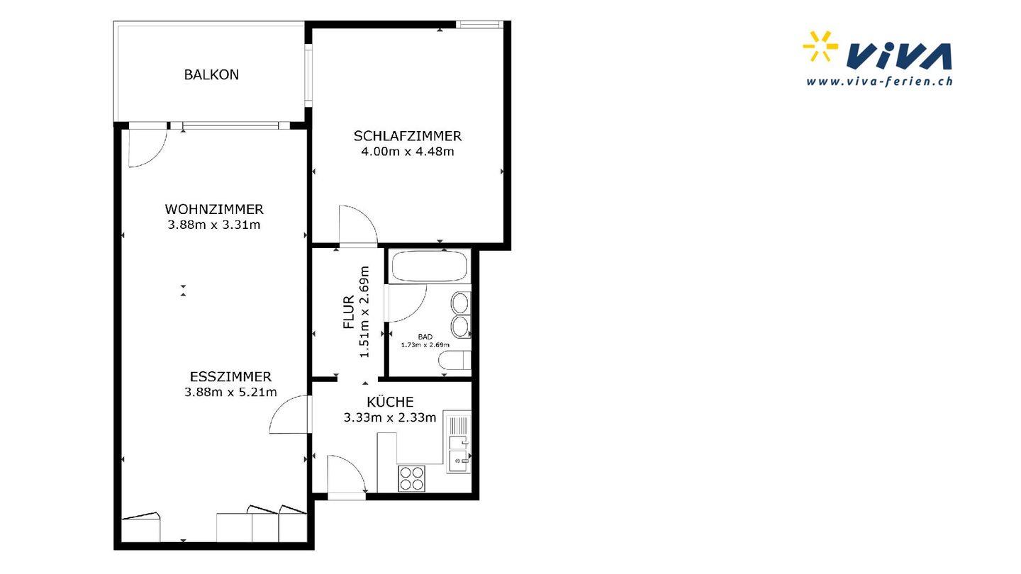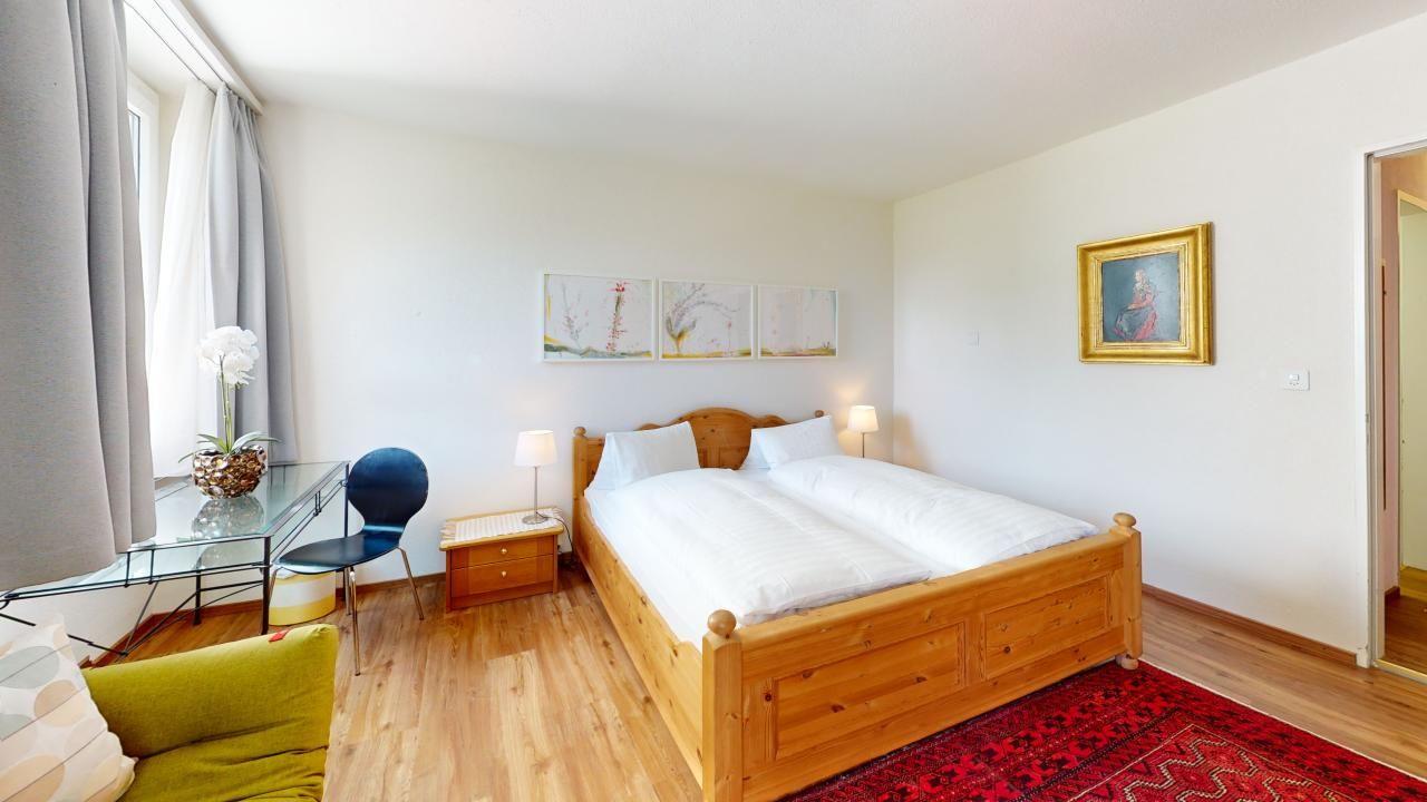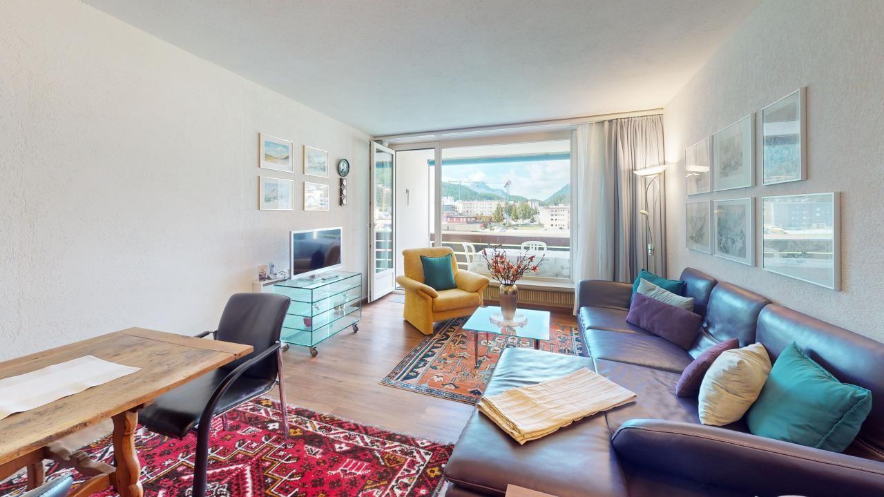 Zweckmässige 2 - Zimmer-Ferienwohnung im 3. Obergeschoss. Wohn- /Esszimmer mit integriertem Schrankbett. Überdachter Balkon mit Aussicht auf die Engadinerbergwelt. Renovierte Kochnische, Bad mit Dusche und Badewanne, separates Doppelschlafzimmer. Im Ferienhaus befindet sich ein Lift. Beschränkte Anzahl Aussenparkplätze (für 1 Auto, nicht reserviert). Fitnessraum zur öffentlichen Nutzung befindet sich im Ferien-Apartmenthaus.