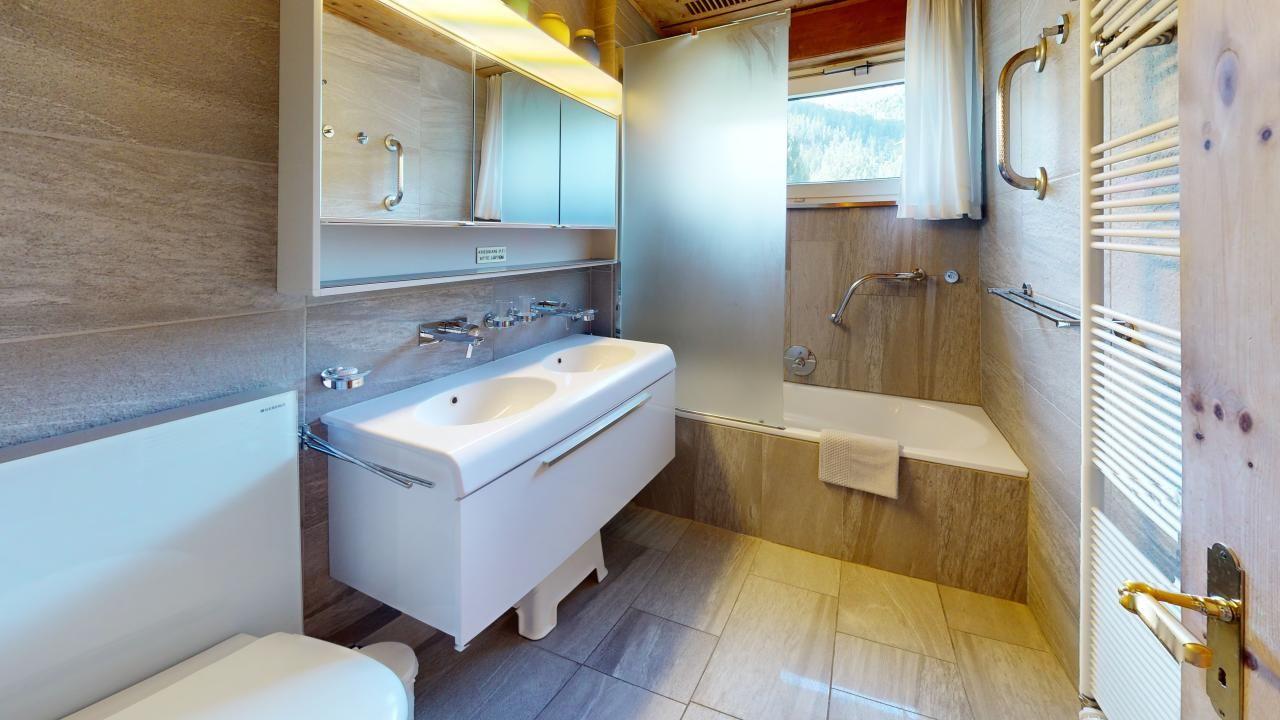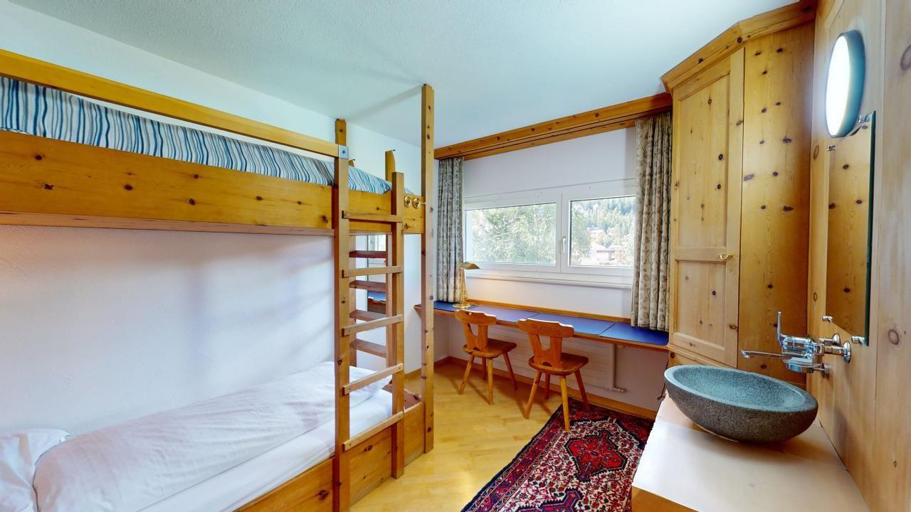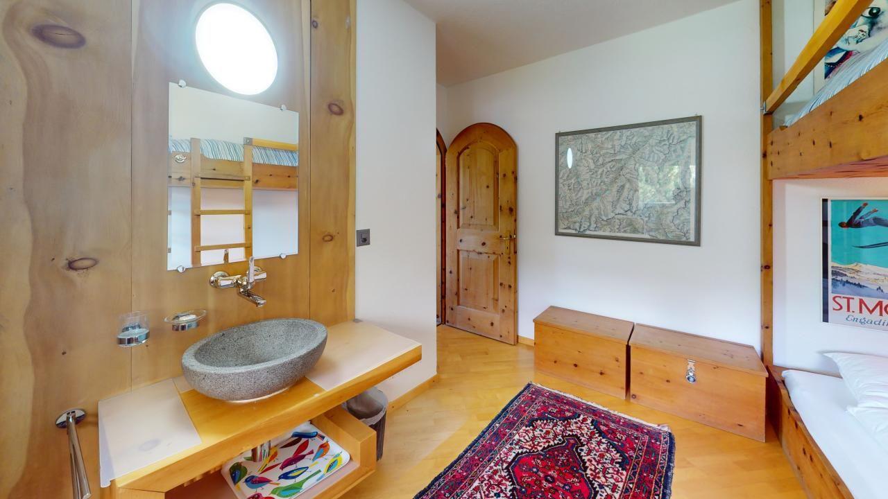 Reizvolle, gemütlich und authentische 4.5-Zimmer-Ferienwohnung im 1. Obergeschoss. Eingang mit Küche und Blick auf St. Moritz Dorf. Separate Toilette. Wohn- /Esszimmer mit überdachtem Balkon. Ein schönes Doppelschlafzimmer. Ein renoviertes Bad mit Dusche/WC/Badewanne. Ein Schlafzimmer mit Etagenbett für zwei Personen mit eigenem Lavabo. Ein weiteres Schlafzimmer mit zwei Etagenbetten. Im Ferienhaus befindet sich ein Lift. Beschränkte Anzahl Aussenparkplätze (max. 1 Auto/Wohnung, nicht reserviert). Fitnessraum zur öffentlichen Nutzung befindet sich im Ferien-Wohnhaus.