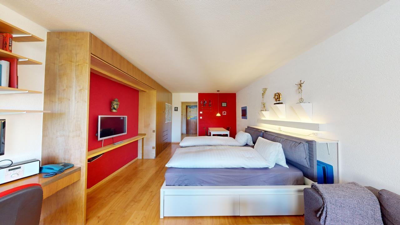 Diese praktische 1 - Zimmerwohnung im Hochparterre vereint die Annehmlichkeiten eines Hotelzimmers mit der Privatsphäre einer eigenen Ferienwohnung. Die ideale Wahl für einen unabhängigen Aufenthalt in St. Moritz. Eingang mit kleiner Küche. Dusche/WC. Wohn- /Esszimmer mit fixem Doppelbett. Überdachter Balkon mit Aussicht. Beschränkte Anzahl Aussenparkplätze (max. 1 Auto/Wohnung, nicht reserviert). Fitnessraum zur öffentlichen Nutzung befindet sich im Ferien-Wohnhaus.