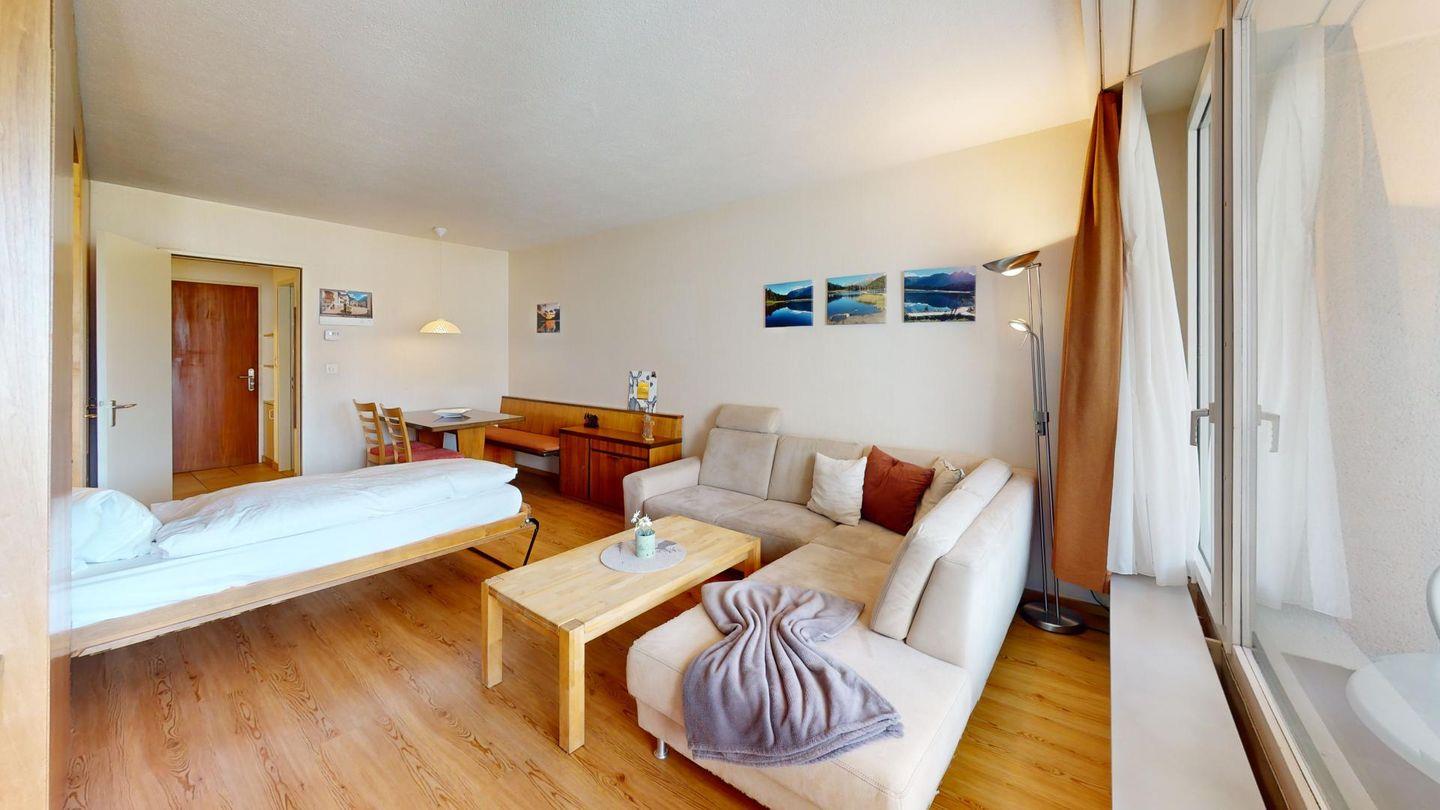 Praktisch eingerichtete 1-Zimmer-Ferienwohnung im 2. Obergeschoss. Wohn- /Esszimmer mit 2 integrierten Schrankbetten. Überdachter Balkon mit Aussicht. Kleine Küche. Bad mit Dusche. Ein Lift im Ferienhaus erleichtert den Zugang. Beschränkte Anzahl Aussenparkplätze (max. 1 Auto/Wohnung, nicht reserviert). Fitnessraum zur öffentlichen Nutzung befindet sich im Ferien-Wohnhaus.