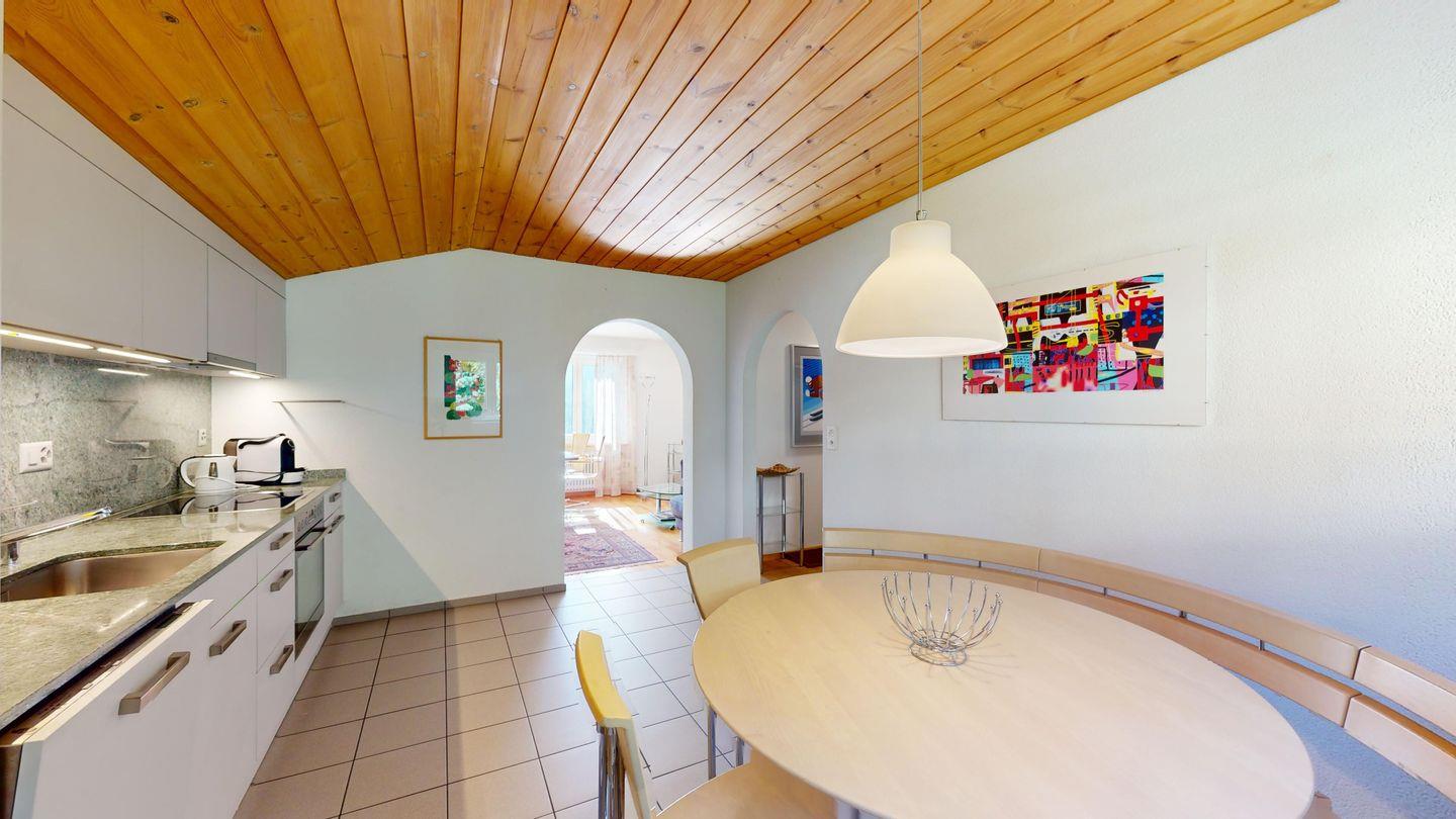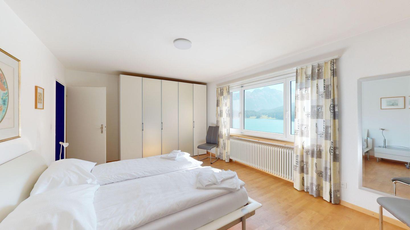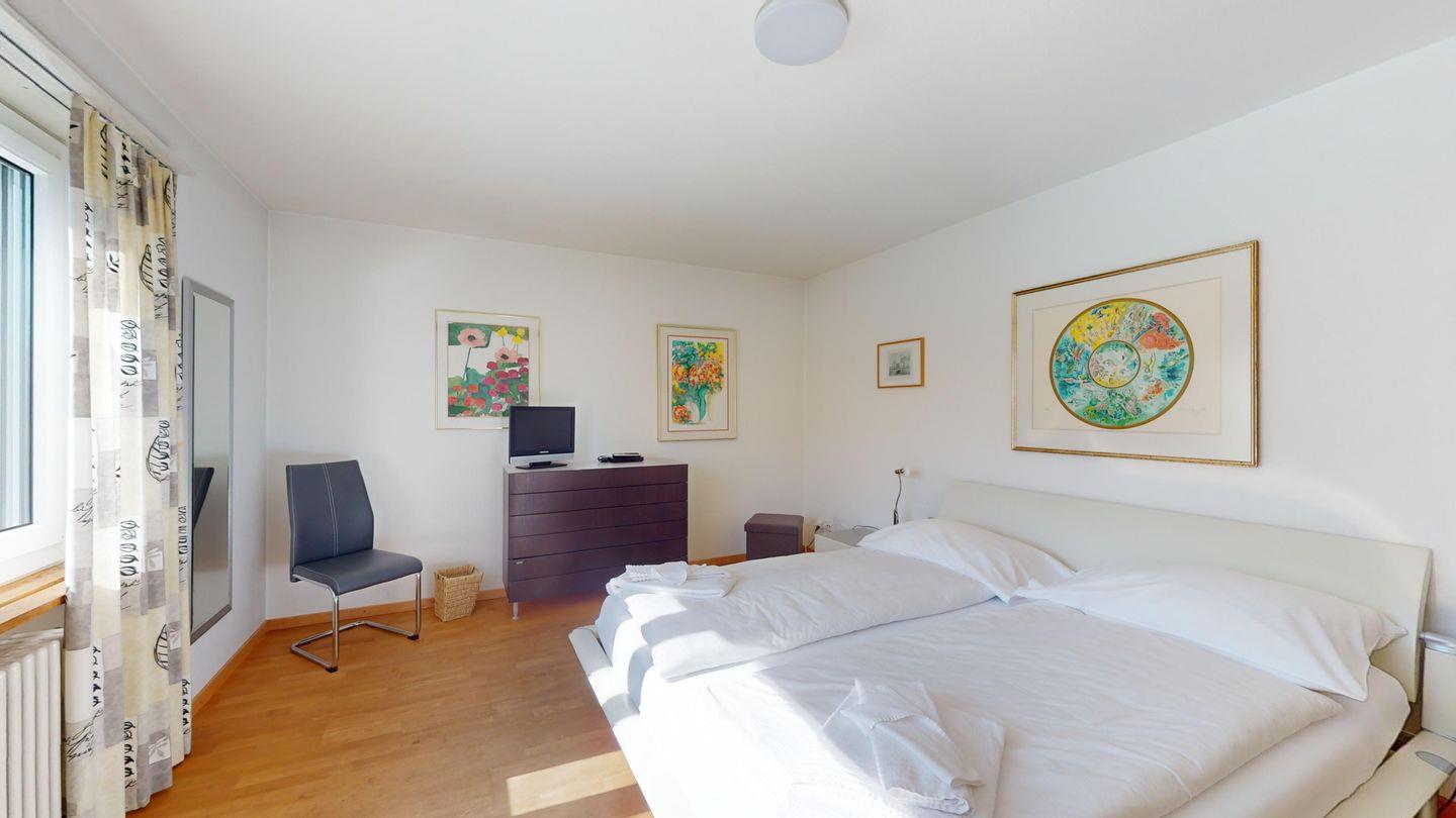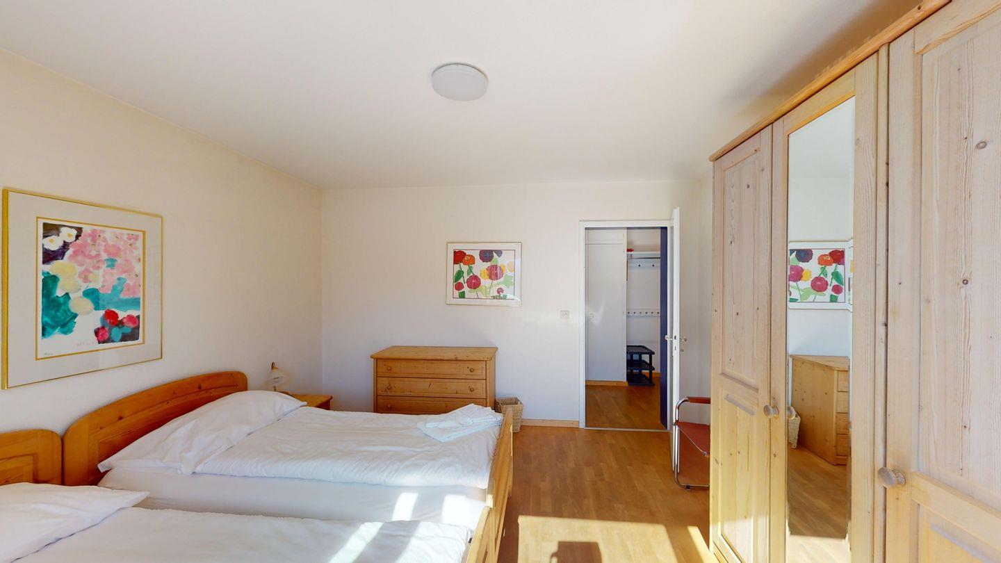3-Zimmerwohnung im 3. Stock, ca. 97 m2. Entree mit Garderobe. Wohn-/Esszimmer mit herrlichem Seeblick, neue Küche mit Ofen, Kühlschrank, Kaffeemaschine Chicco d'Oro und Abwaschmaschine. Ein grosses Doppelzimmer und ein sehr grosses Doppelzimmer, beide mit Seeblick. Bad/WC/Lavabo. Dusche/WC/Lavabo. Internet, Radio, TV, DVD und Telefon. Neue, komfortable Einrichtung. Gedeckter Aussenparkplatz im Nebenhaus. Skiraum und Waschküche zur gemeinsamen Benützung. Haustiere sind nicht erlaubt.