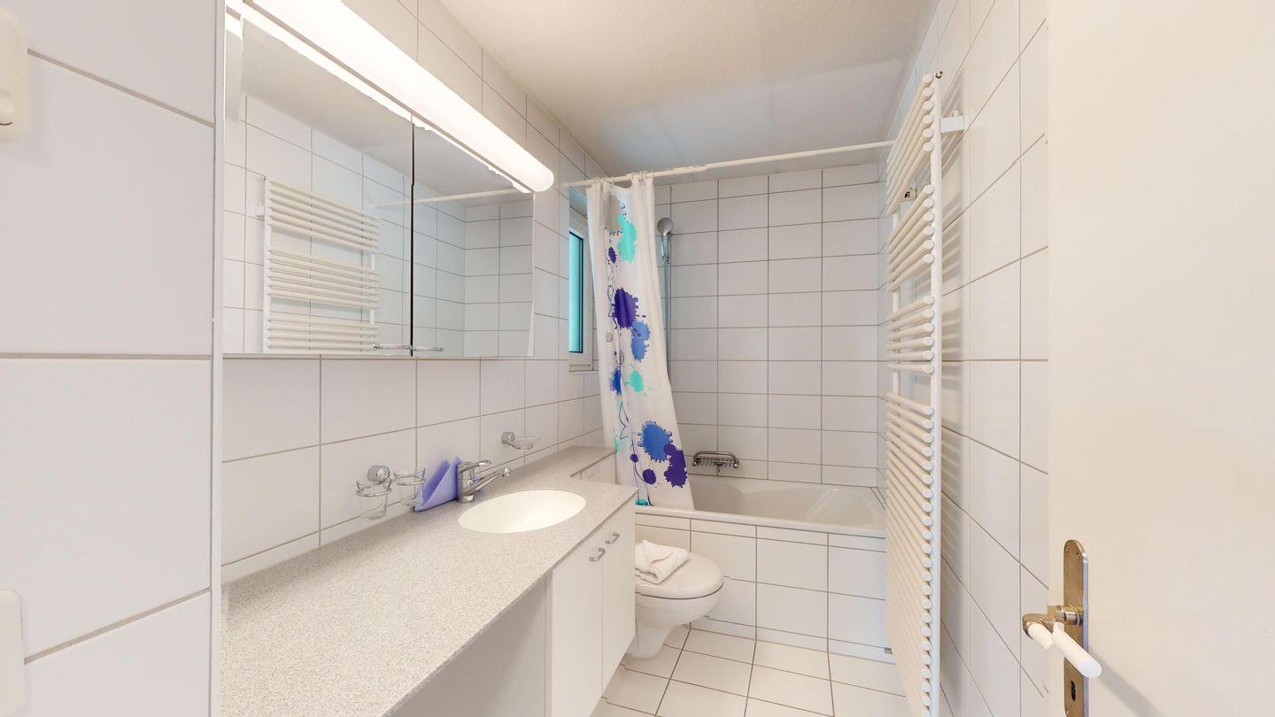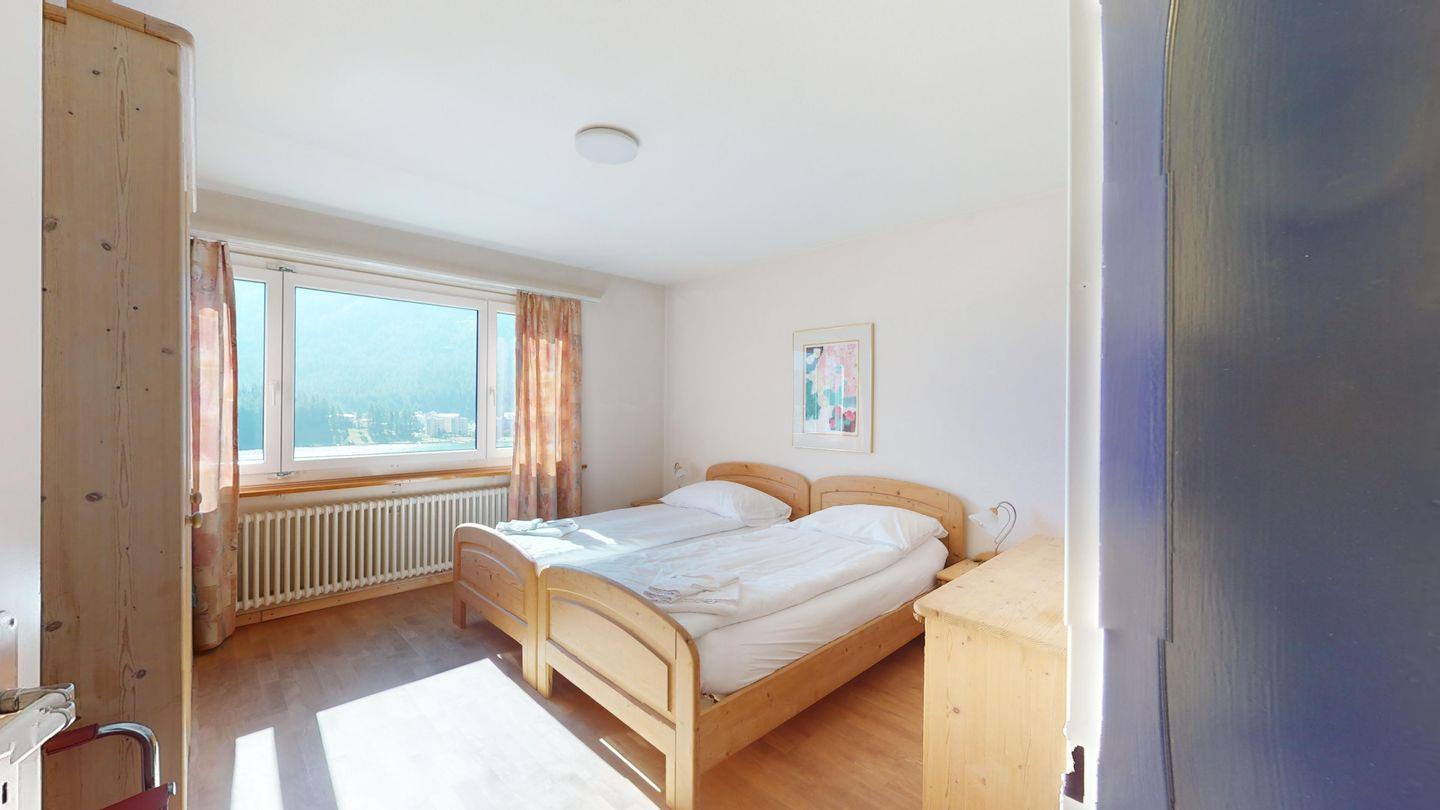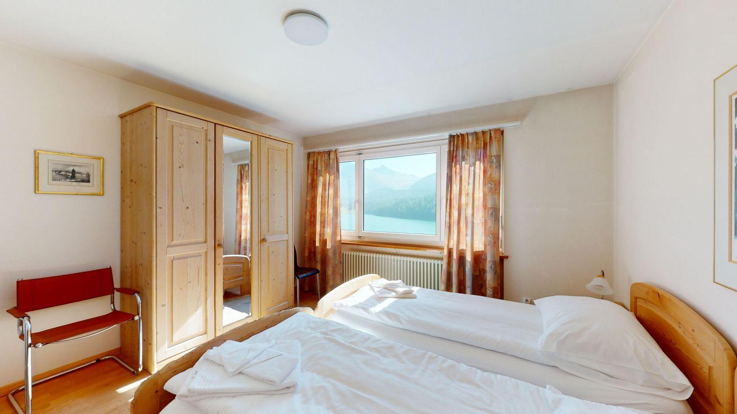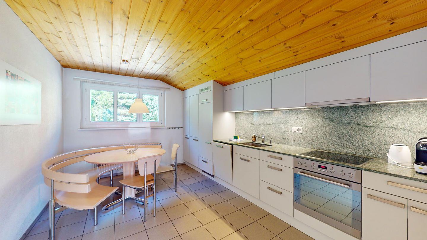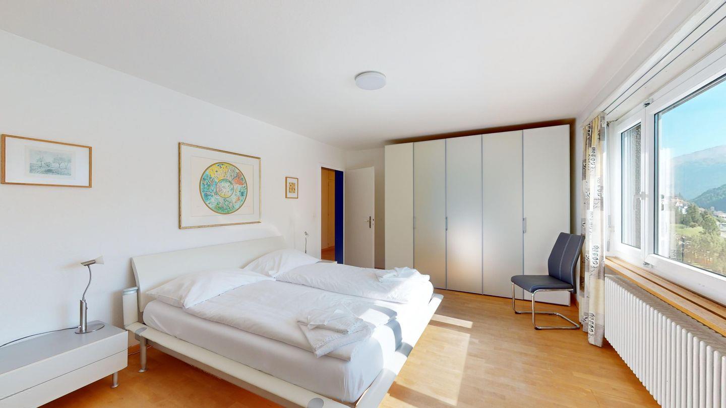 3-Zimmerwohnung im 3. Stock, ca. 97 m2. Entree mit Garderobe. Wohn-/Esszimmer mit herrlichem Seeblick, neue Küche mit Ofen, Kühlschrank, Kaffeemaschine Chicco d'Oro und Abwaschmaschine. Ein grosses Doppelzimmer und ein sehr grosses Doppelzimmer, beide mit Seeblick. Bad/WC/Lavabo. Dusche/WC/Lavabo. Internet, Radio, TV, DVD und Telefon. Neue, komfortable Einrichtung. Gedeckter Aussenparkplatz im Nebenhaus. Skiraum und Waschküche zur gemeinsamen Benützung. Haustiere sind nicht erlaubt.