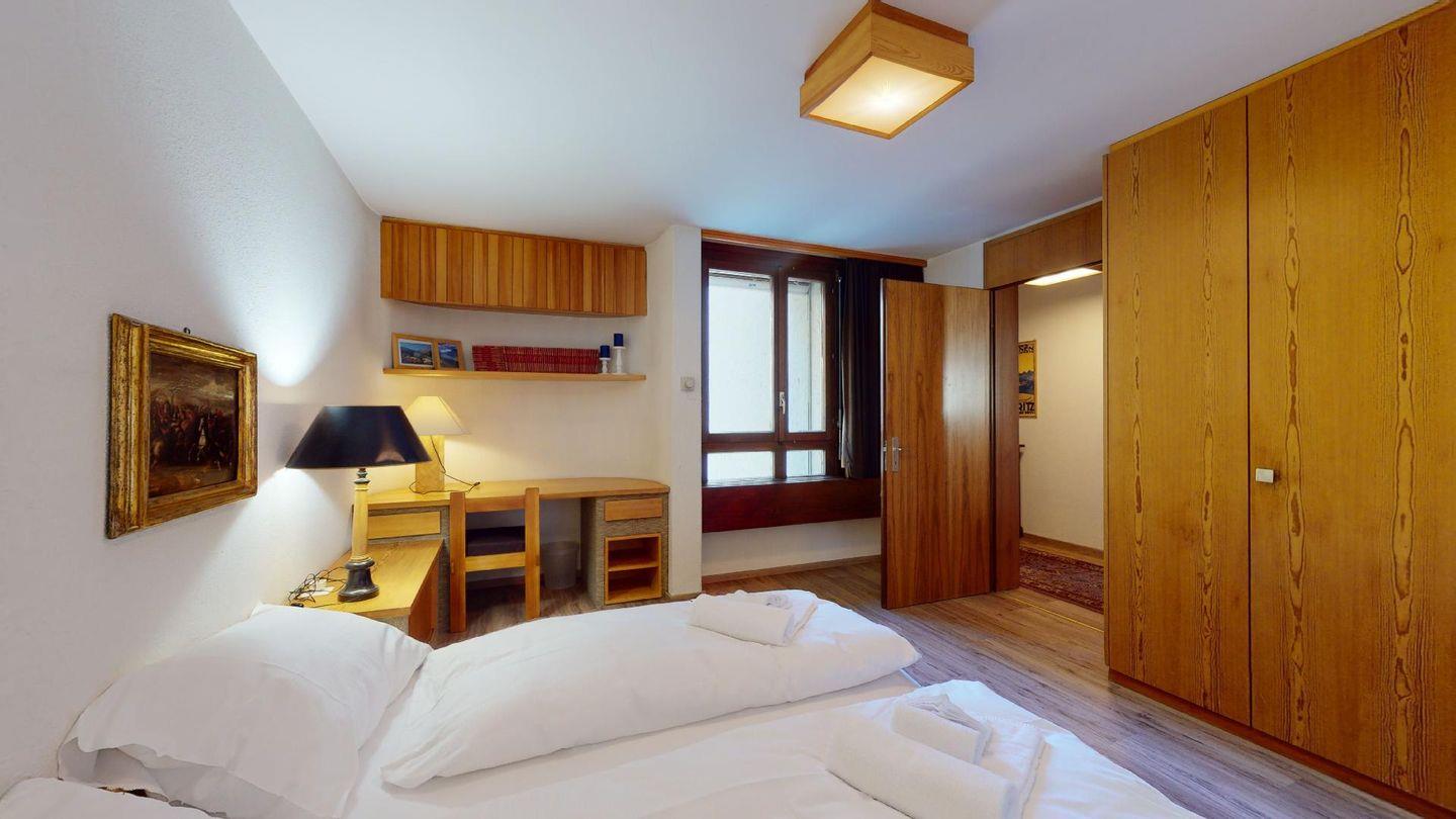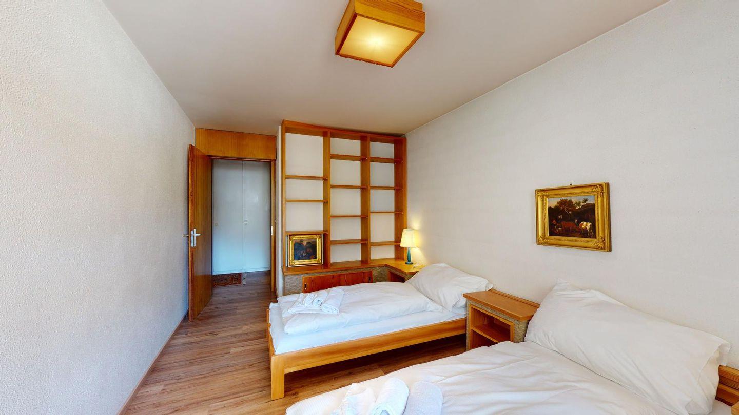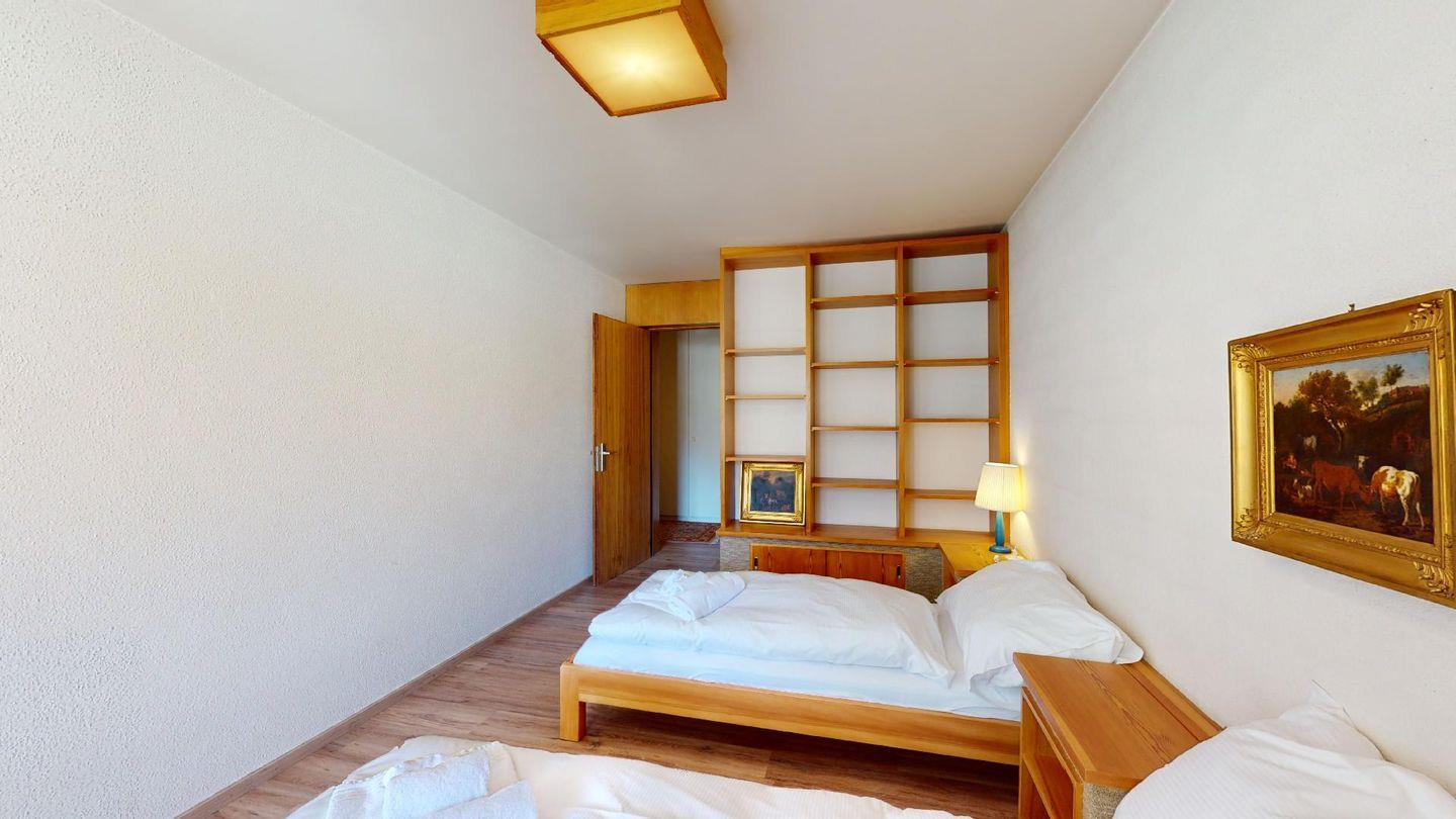 - 1 Zimmer mit 2 Betten (90 cm, Länge 190 cm), Regalen, Schreibtisch und Bücherregal. Terrasse mit grossem Panoramablick, möbliert.