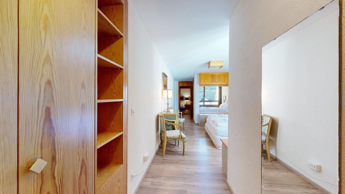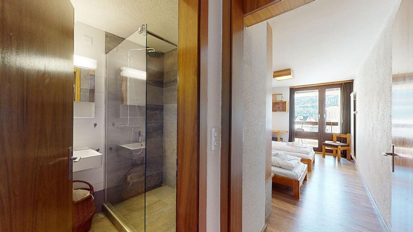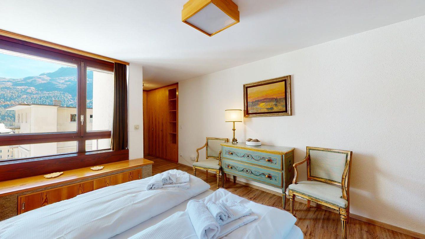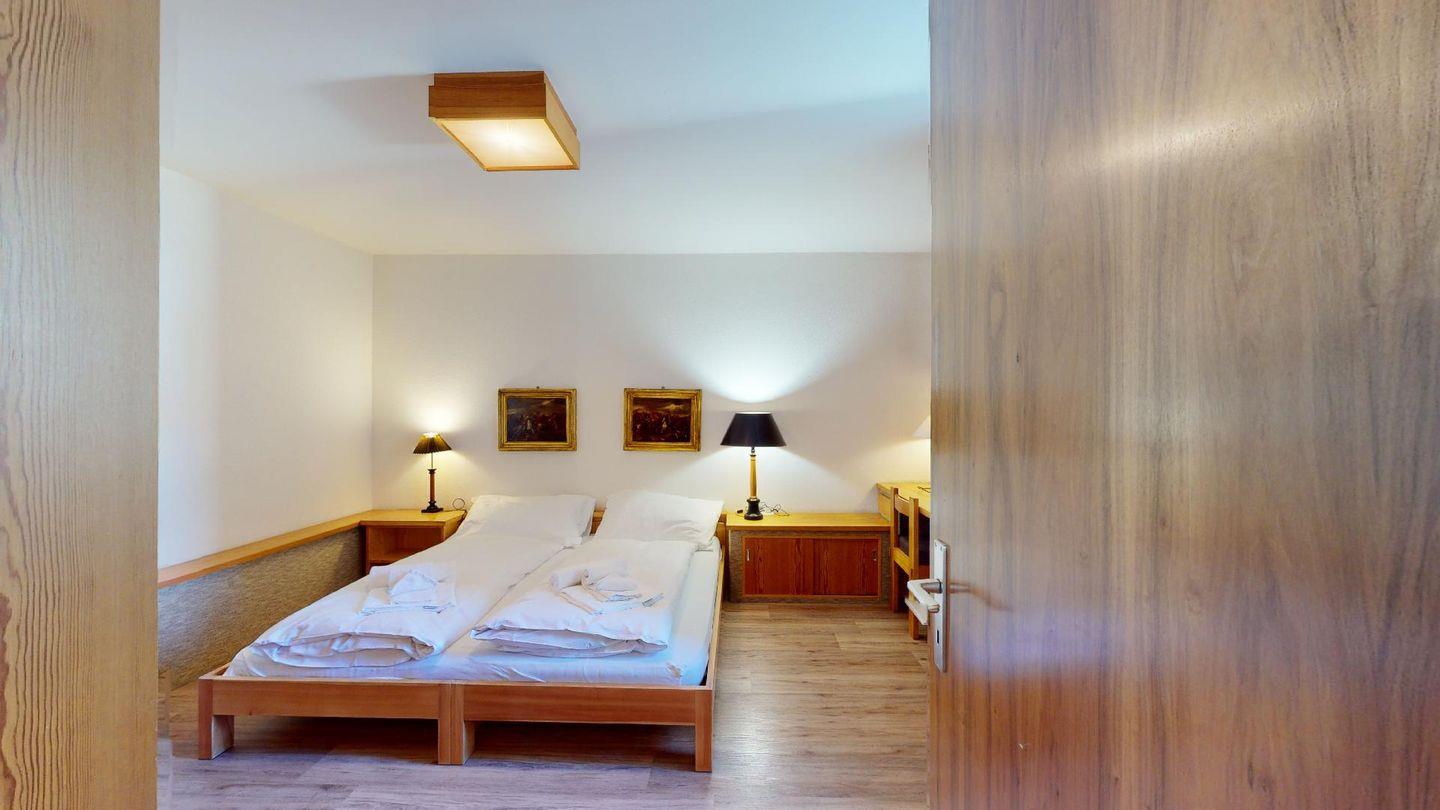 - 1 Zimmer mit 2 Betten (90 cm, Länge 190 cm), Regalen, Schreibtisch und Bücherregal. Terrasse mit grossem Panoramablick, möbliert.