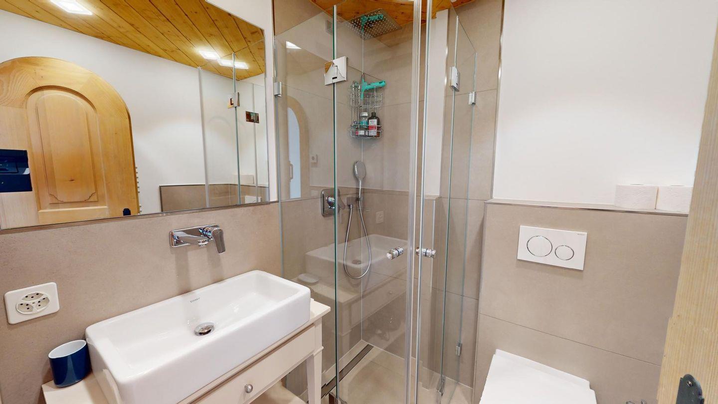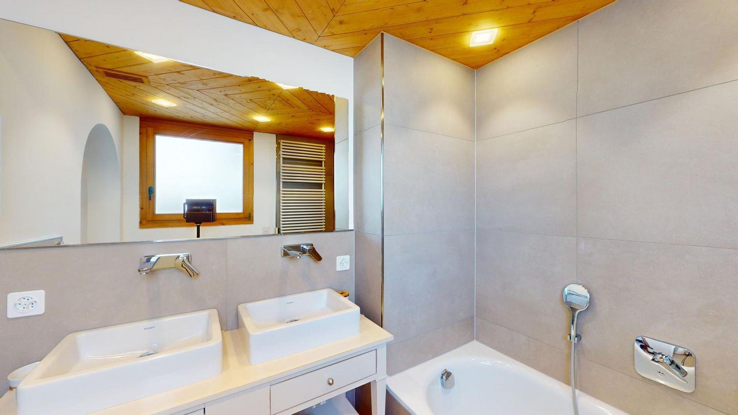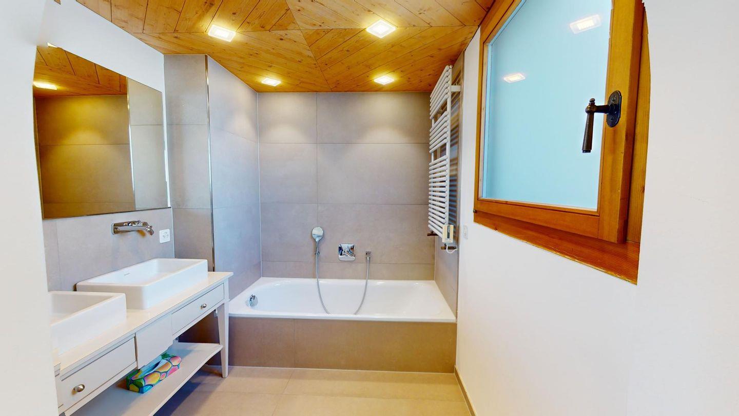 Grosszügige 4.5-Zimmerwohnung mit modernem Wohnkomfort. Der helle Wohn- und Essbereich mit Kamin überzeugt durch seine elegante Einrichtung und bietet direkten Zugang zur Terrasse mit herrlichem Blick über das Tal. Geschlossene, gut ausgestattete Küche. 1 Schlafzimmer mit Doppelbett, eigenem Bad (Dusche/ WC), 1 Schlafzimmer mit Doppelbett, grosszügiges Badezimmer (Badewanne/ Dusche/ WC), 1 Schlafzimmer mit Doppelbett, separates Badezimmer (Dusche/WC). Lift und 1 Doppelgarage (1 Ladestation für Elektroautos steht zur Verfügung).