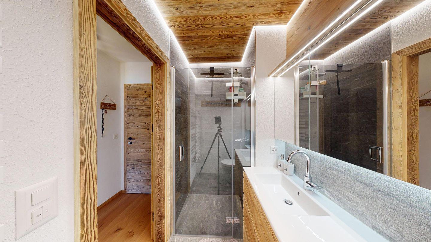 Die Loggia mit Sitzplatz und Zugang zu einer kleinen Wiese bietet einen freien Blick auf die Berge über dem See. Ein Lift führt im Keller zum PKW-Stellplatz und einem kollektiv genutzten Ski-Raum.