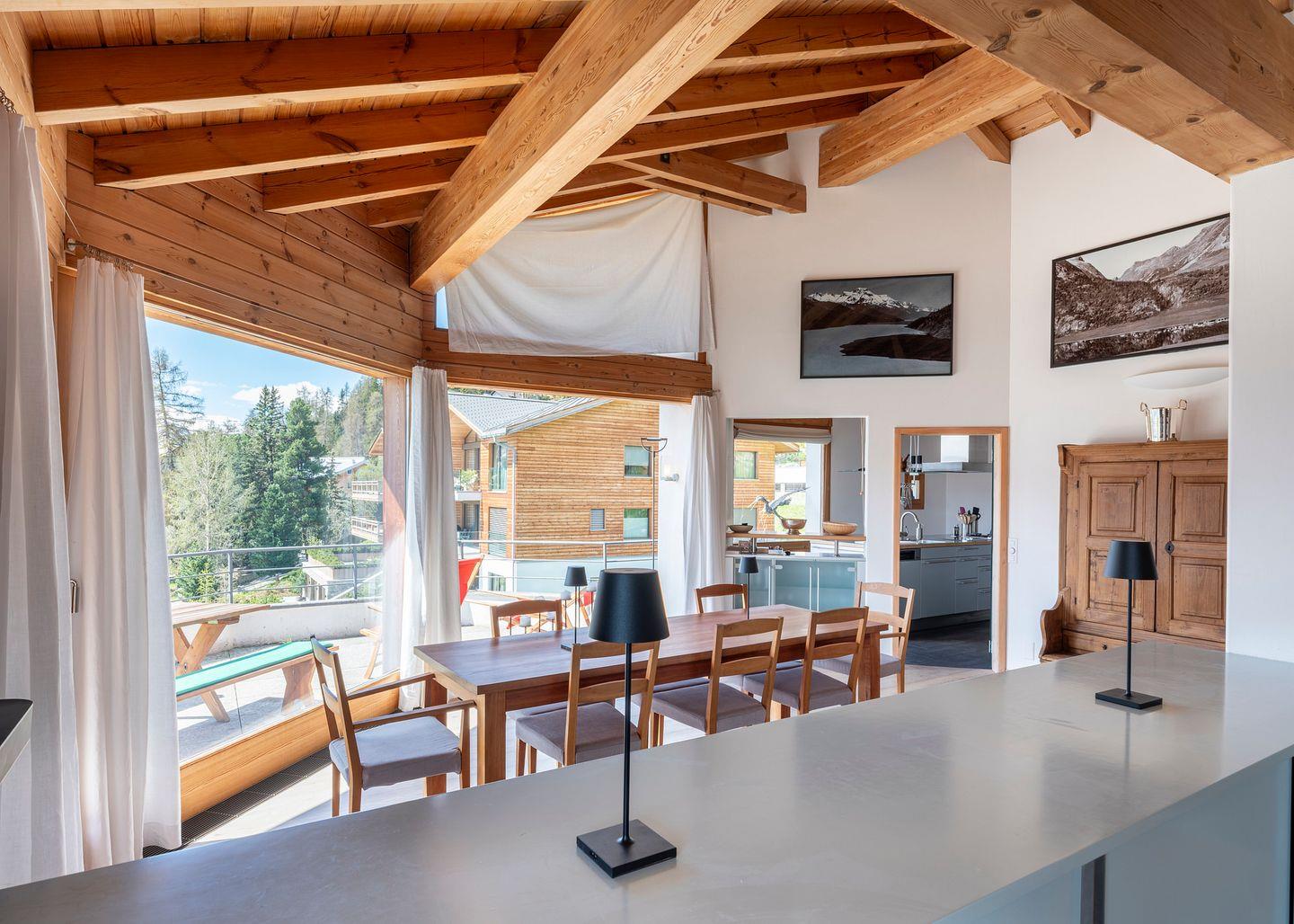 Das grosszügige, lichtdurchflutete Wohn- und Esszimmer bietet einen atemberaubenden Ausblick auf die Engadiner Bergwelt und öffnet sich zu einem sonnigen Balkon – der perfekte Ort, um entspannte Stunden zu geniessen. Die geschlossene, modern ausgestattete Küche lädt zu kulinarischen Momenten ein und ist bestens ausgestattet.