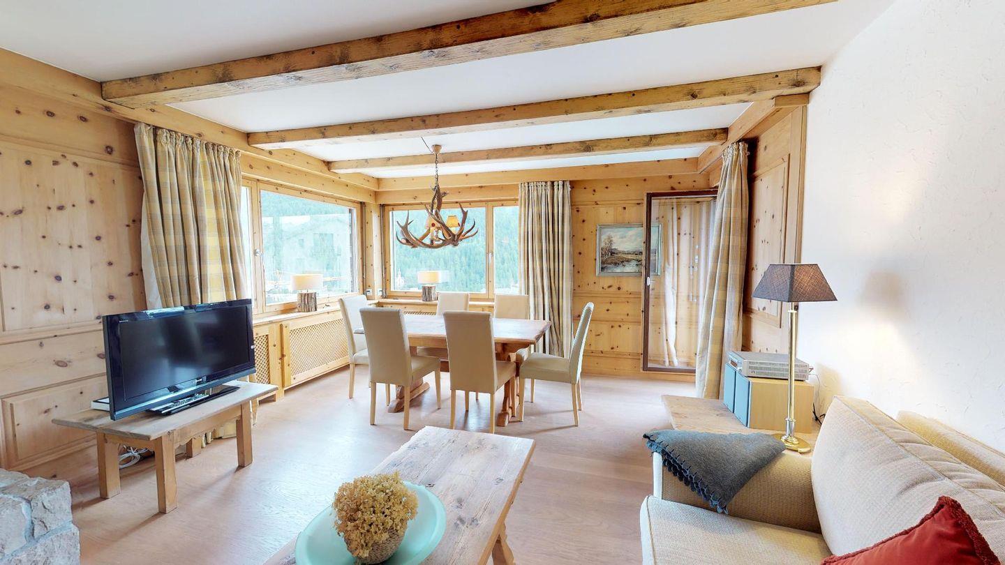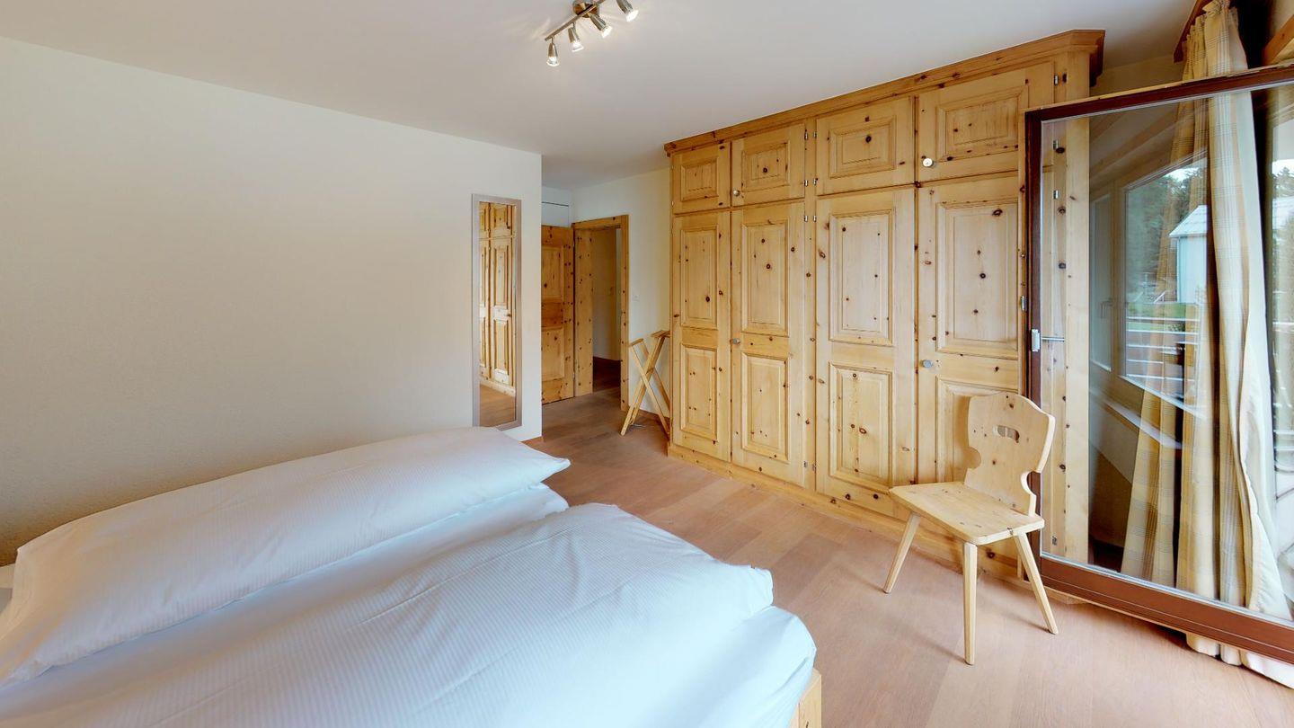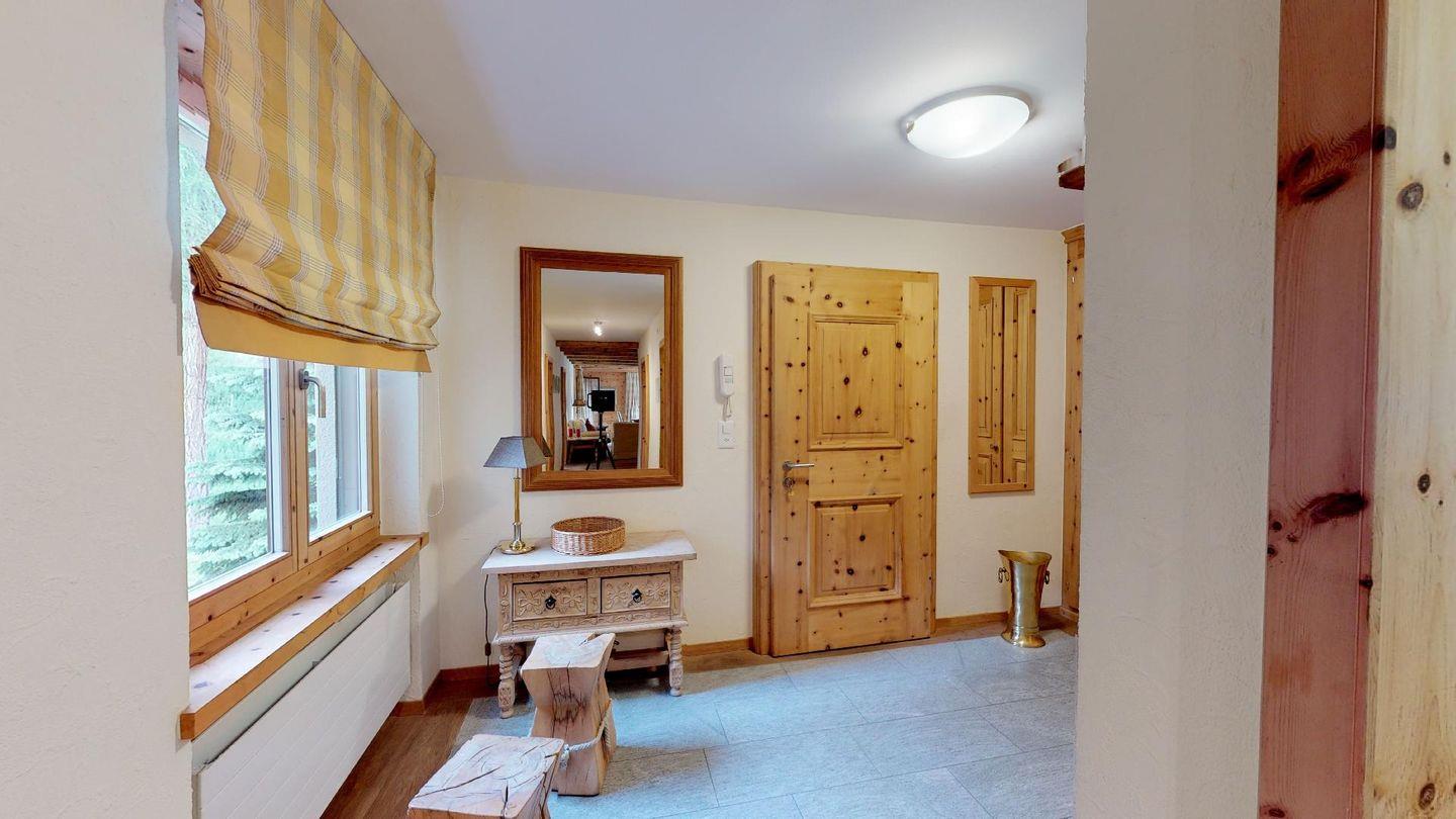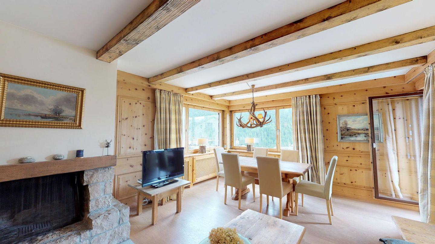 Die 4- Zimmer Ferienwohnung ist sehr stilvoll und hochwertig mit einheimischem Arvenholz und Naturstein eingerichtet. Grosszügiges Wohn- /Esszimmer mit Kamin, Südbalkon. Moderne, gut ausgestattete Küche mit Backofen, 1 Doppelschlafzimmer mit Bad/DU. 2 Schlafzimmer mit je 2 separaten Betten. 1 DU/WC. Waschmaschine, Tumbler zur Mitbenützung. Parkplatz.
