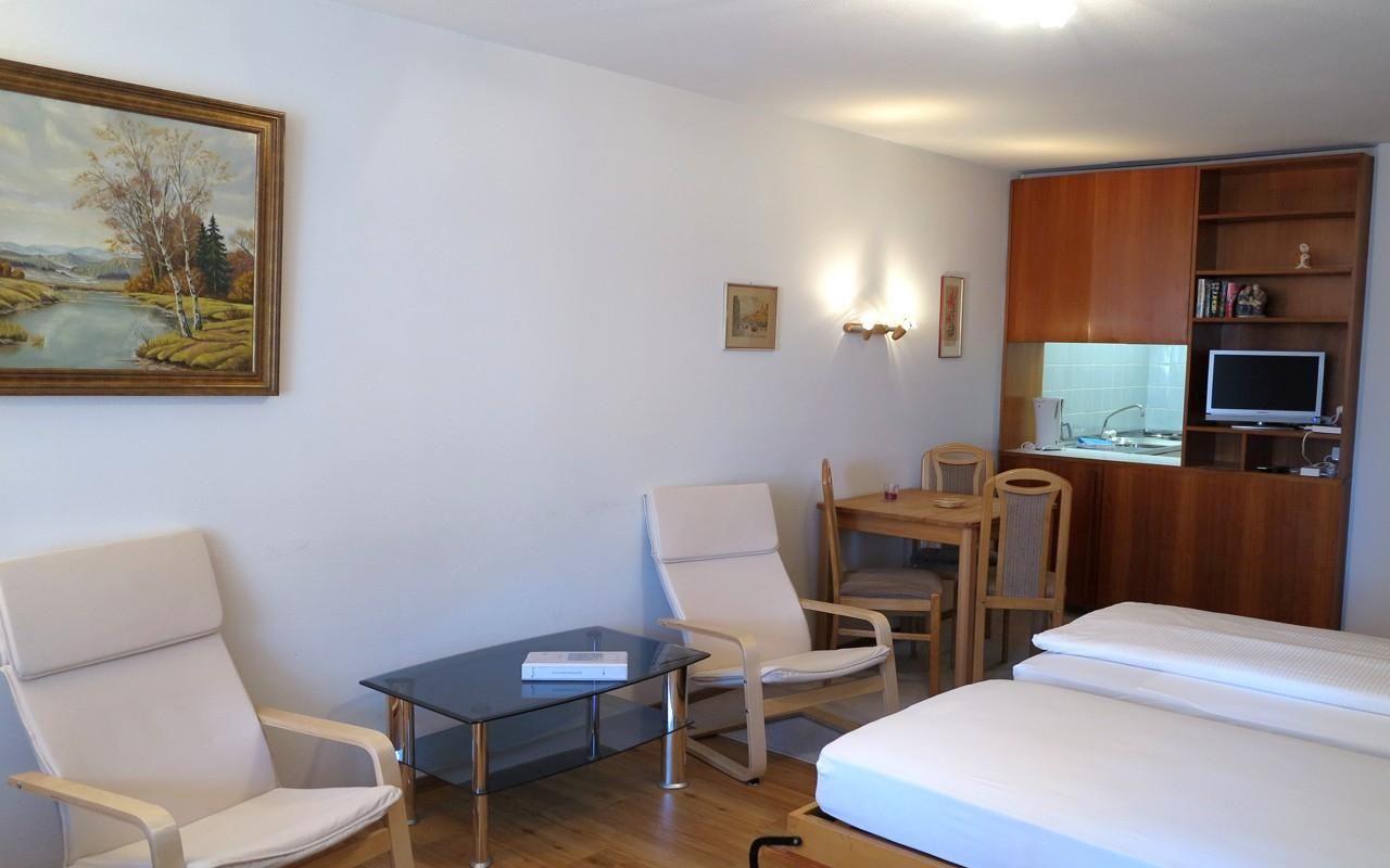 Nette Ferienwohnung im 1. Stock. Zirka 40m2. Wohn-/ Esszimmer mit Schrankbetten, kleine separate Küche ohne Geschirrspüler, Balkon nach Osten. Bad/Dusche, WC. Lift.
