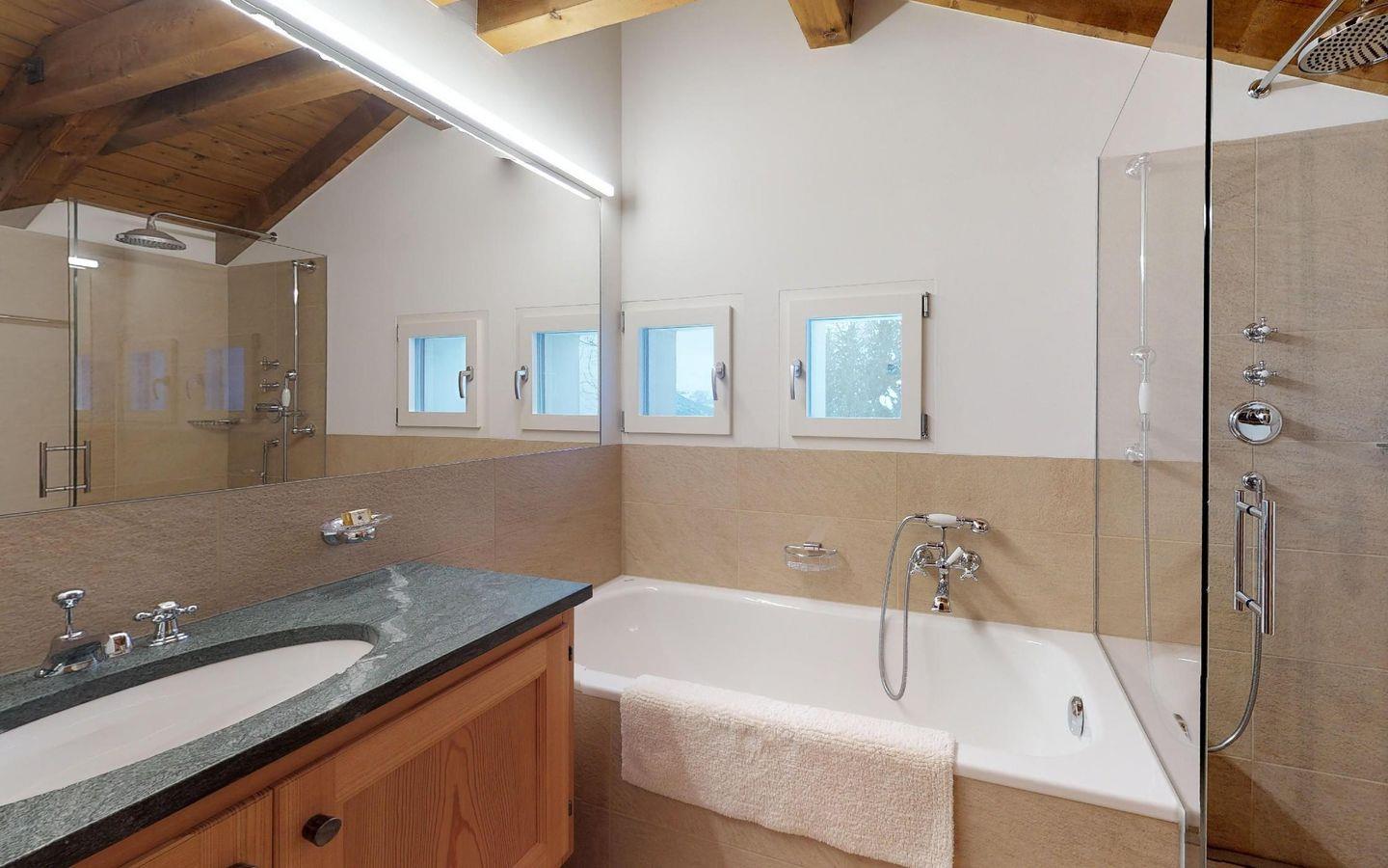 Ebene 0: Eingang mit Garderobe. Gemütliches, grosszügiges Wohnzimmer mit Kamin. Leicht nach unten versetzt, Esszimmer mit separater Küche und Gäste-WC. Ebene -1: 2 Schlafzimmer mit je 1 DU/WC. 1 Sauna. 1 Personal-Doppelschlafzimmer mit Dusche. Ebene +1: Elternschlafzimmer mit Bad/Dusche. Doppel-Schlafzimmer mit DU/WC. Doppelgarage. Gratis WLAN.