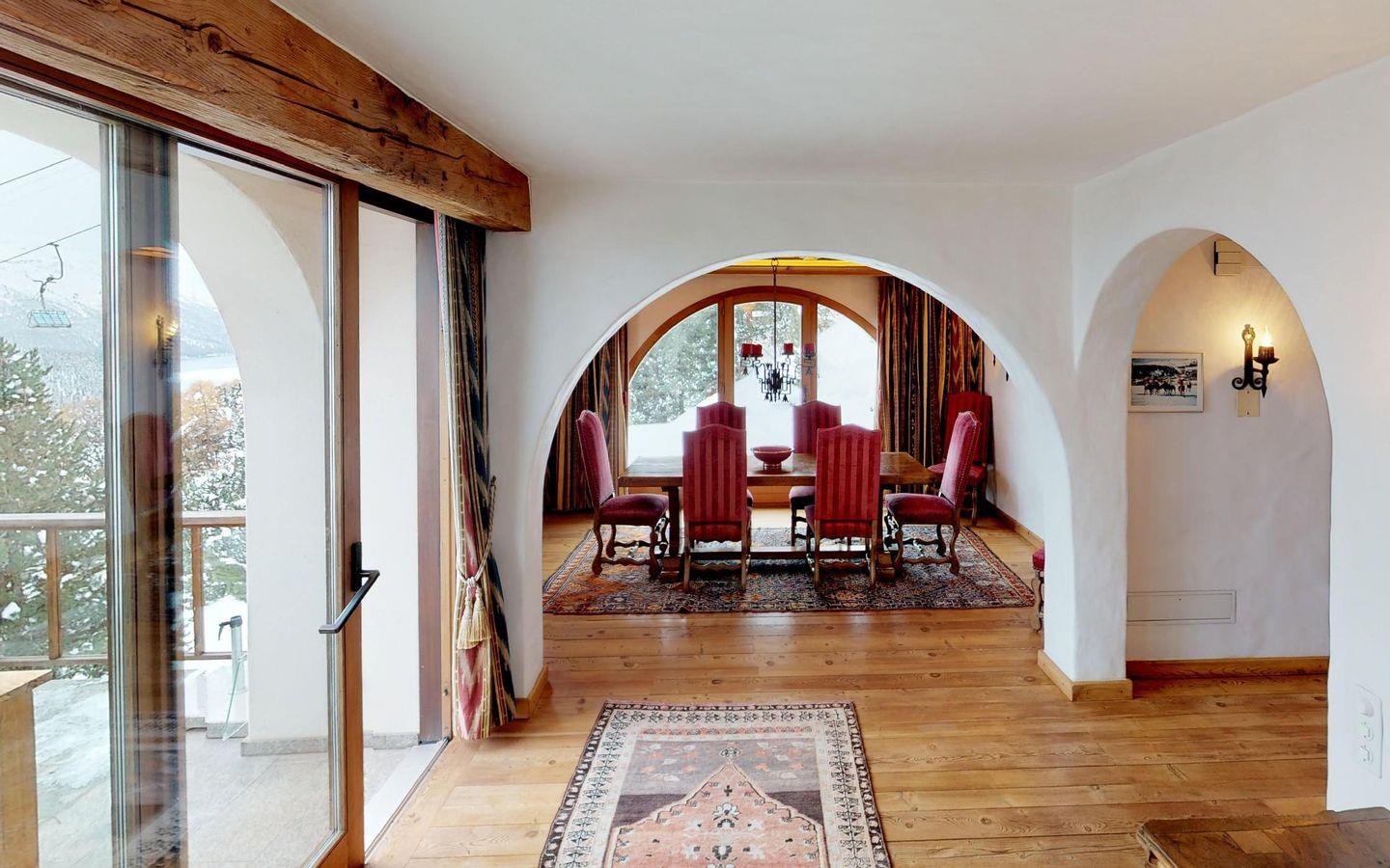 Super attraktive, persönliche Villa im exklusiven Suvretta-Gebiet. Traumhafte Lage mit perfekter Aussicht auf die Seen, die Berge und das Tal. Ski in - Ski out. Ganz in der Nähe vom Suvretta-Skilift. 3 Gehminuten zur Skipiste. 8 Autominuten vom Zentrum St.Moritz entfernt.