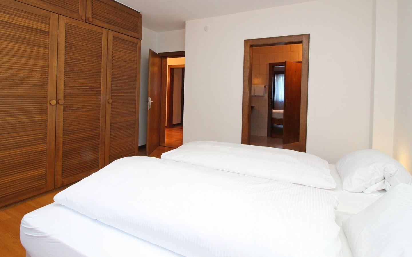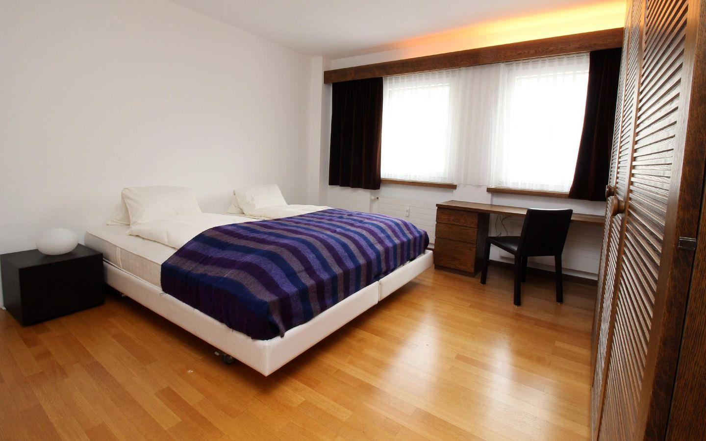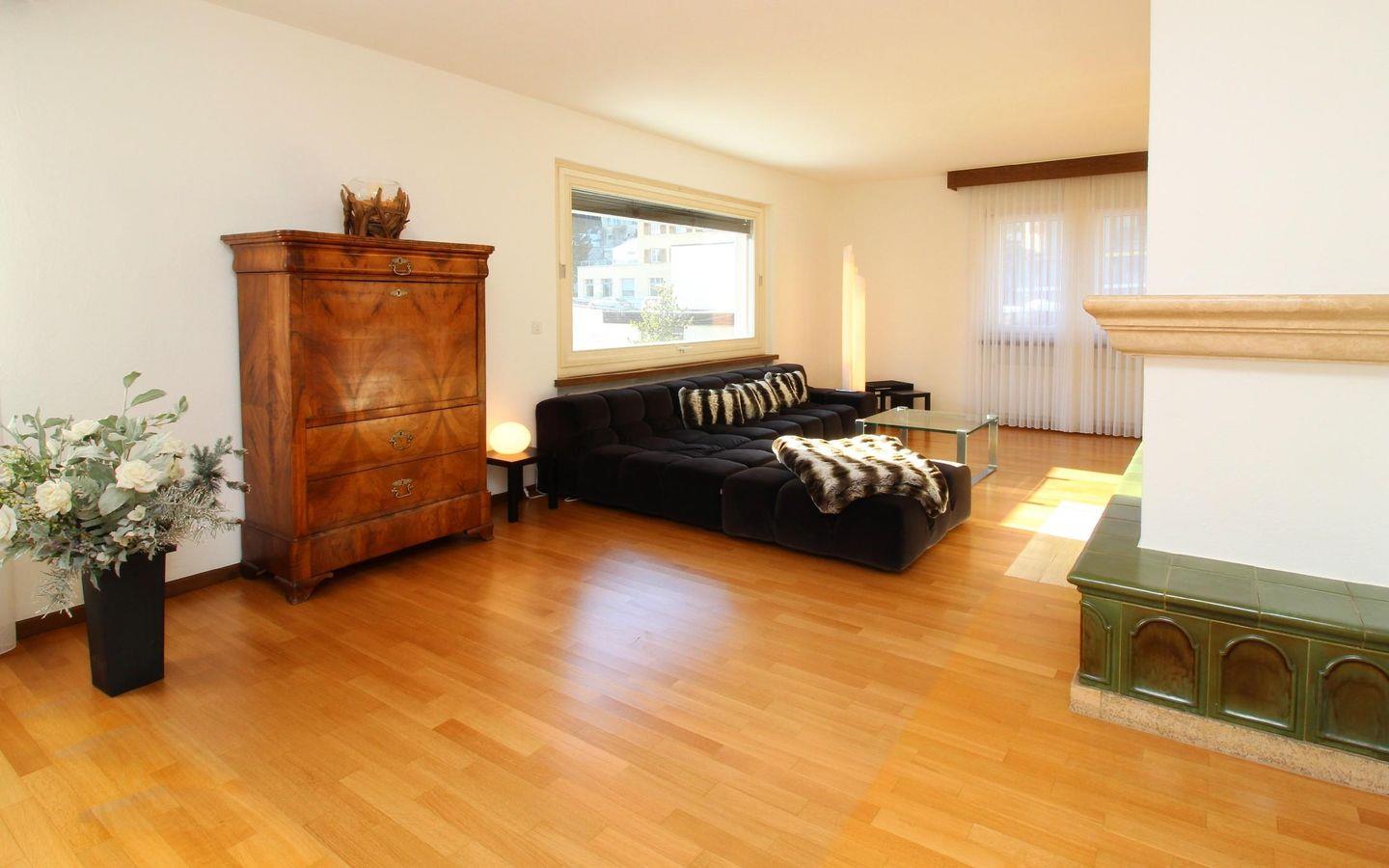 Sehr grosszügige und komfortable 5-Zimmer Ferienwohnung im obersten Stock des Hauses. Mit dem Lift gelangen Sie direkt in den hellen Wohn-/Essbereich mit Kamin. Separate, komplett ausgestattete Küche mit Esstisch. Gäste-WC. 1 Schlafzimmer mit Doppelbett, Bad/DU, 2 Schlafzimmer mit Doppelbetten verbunden durch Badezimmer mit Badewanne/DU, Doppelwaschbecken/WC. 1 weiteres Schlafzimmer mit Bad/DU. 1 Garagenparkplatz im Parkhaus "Quadrellas" gegenüber der Wohnung inklusive. Weitere Parkplätze gegen Gebühr möglich.