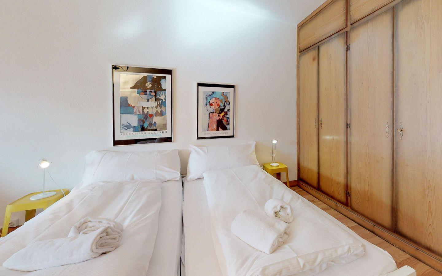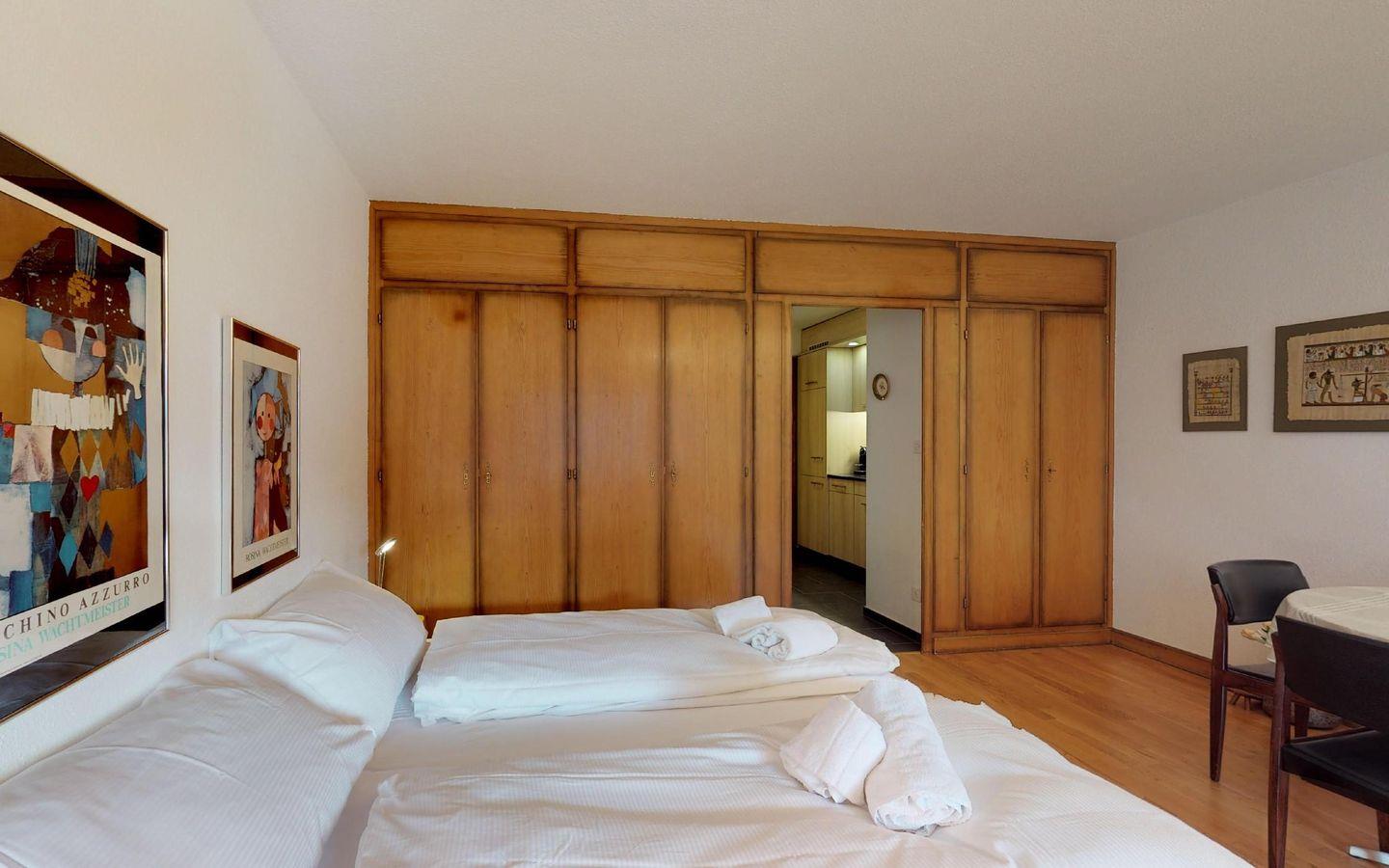 Gemütliches, grosszügiges Studio im 3. Stock mit Sofaecke, Esstisch, Doppelbett ( 2 x 95cm x 190 x cm ). Renovierte, separate Küche, Dusche. Lift. Garagenplatz kann auf Anfrage und nach Verfügbarkeit gegen Gebühr dazugebucht werden.