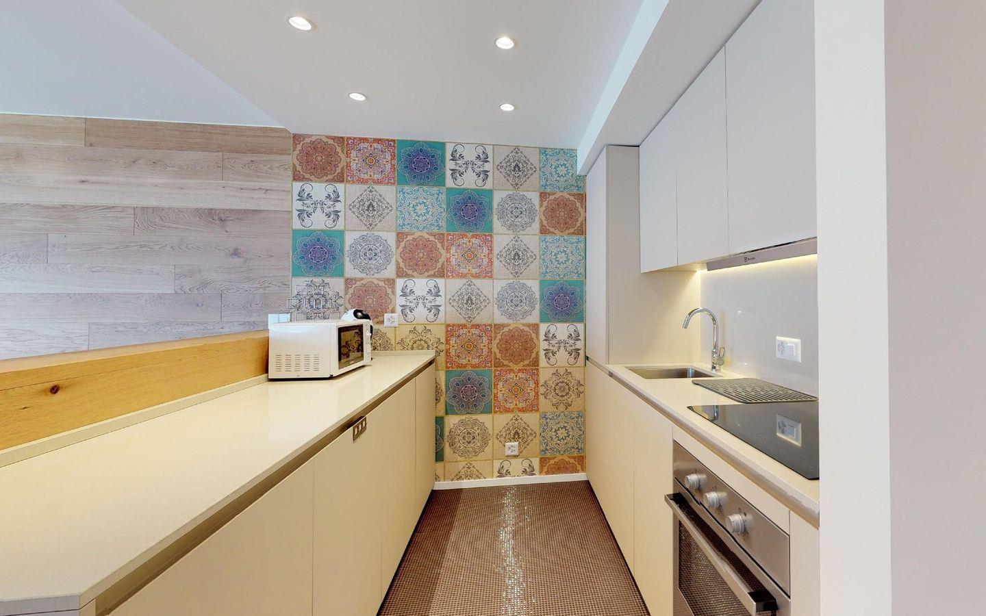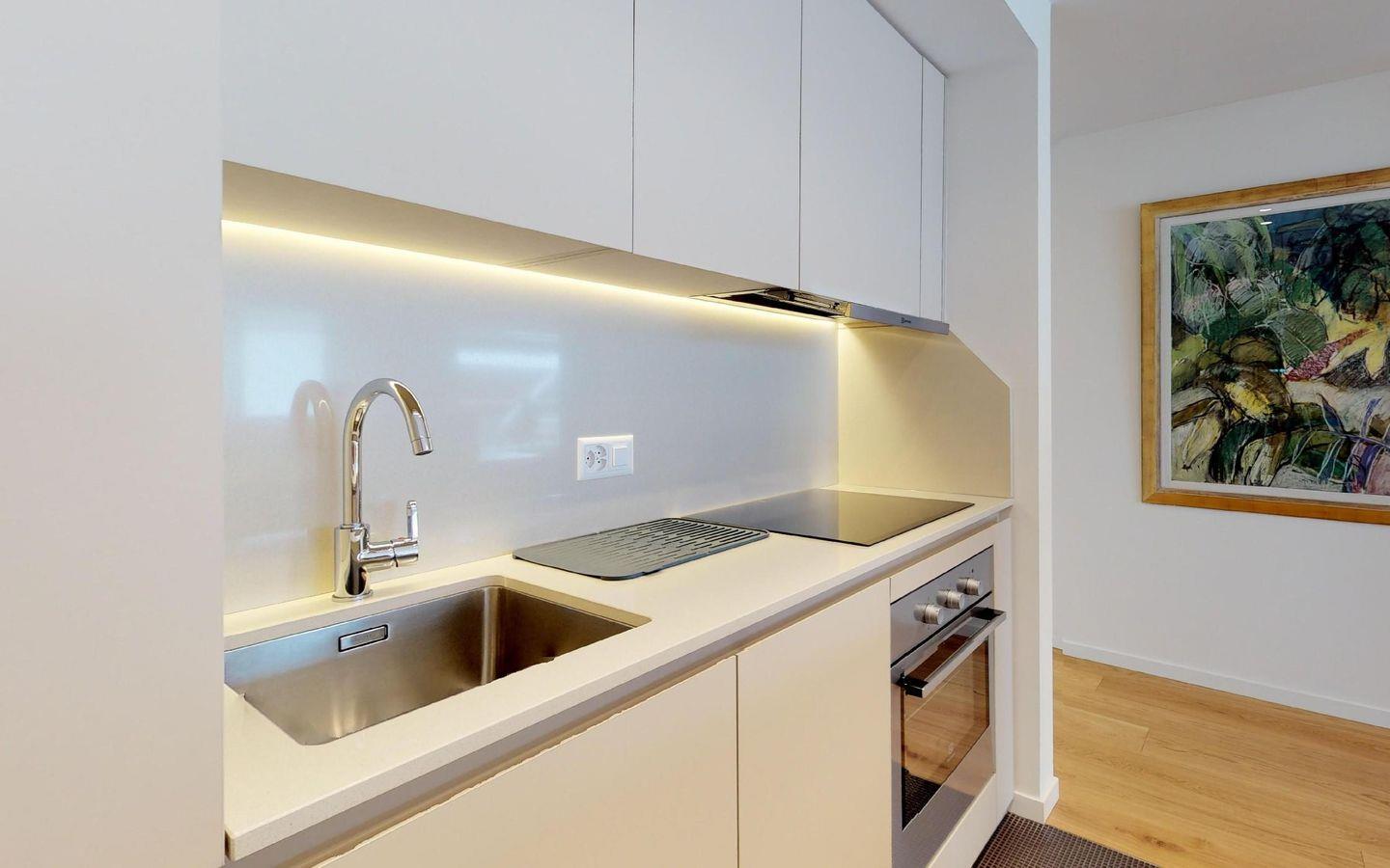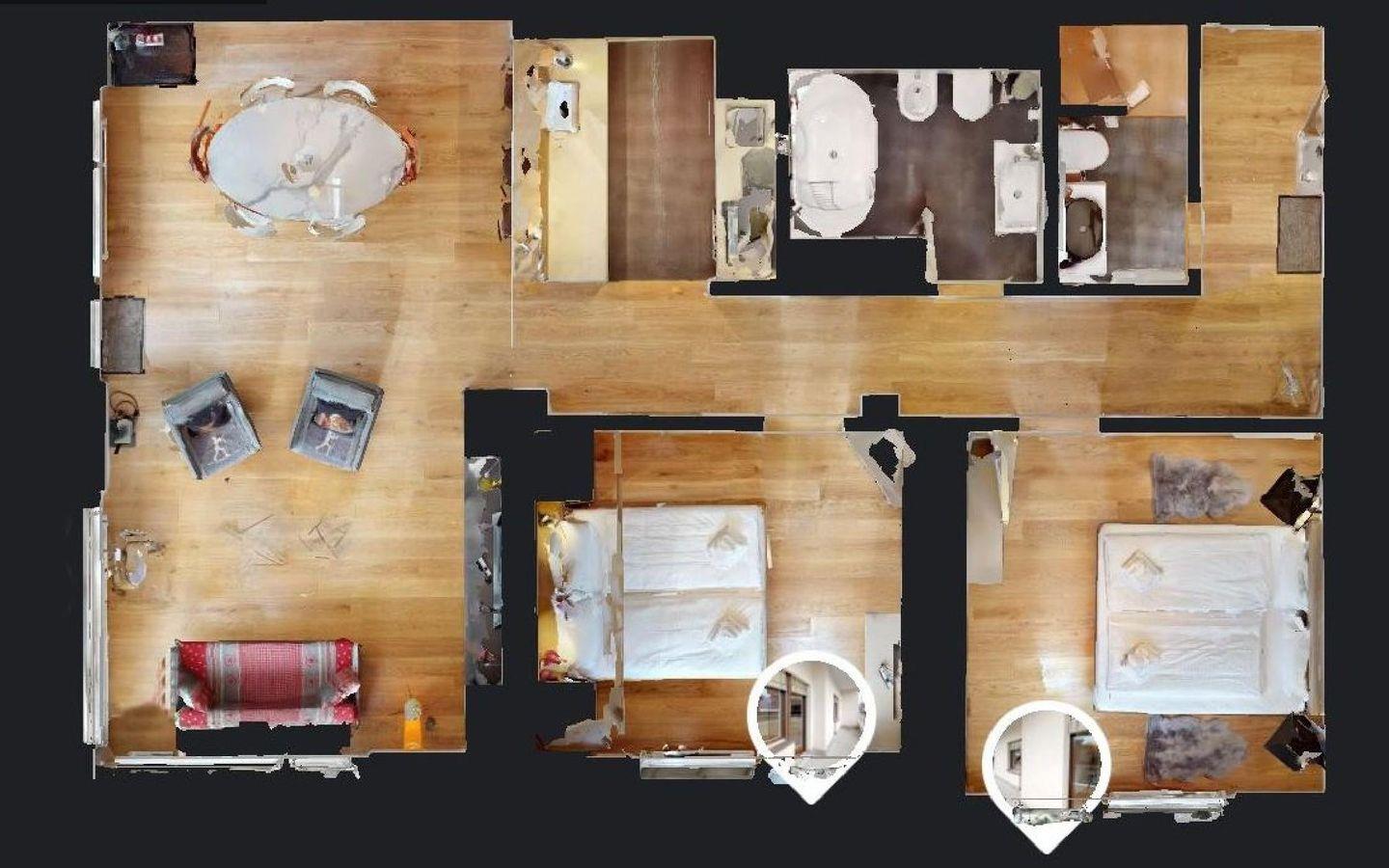 Sehr helle, modern renovierte 3 - Zimmer Ferienwohnung. Die Wohnung verfügt über Wohn- /Esszimmer mit TV, offene, gut ausgestattete Küche sowie Balkon über zwei Seiten. 1 Schlafzimmer mit Doppelbett und erhöhtem Kinder-Einzelbett. 1 Doppelschlafzimmer. 1 Bad/DU/WC sowie 1 DU/WC.
