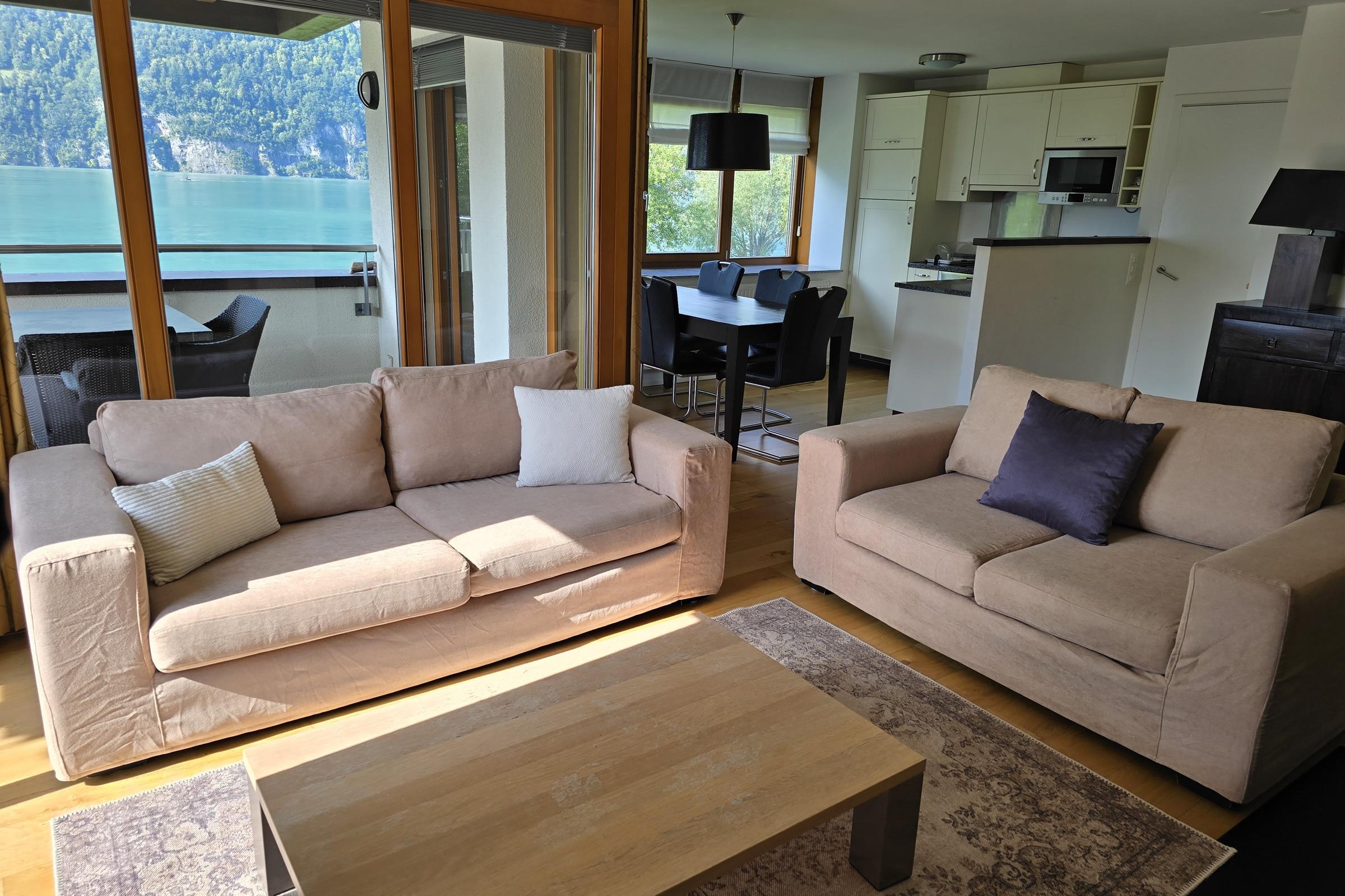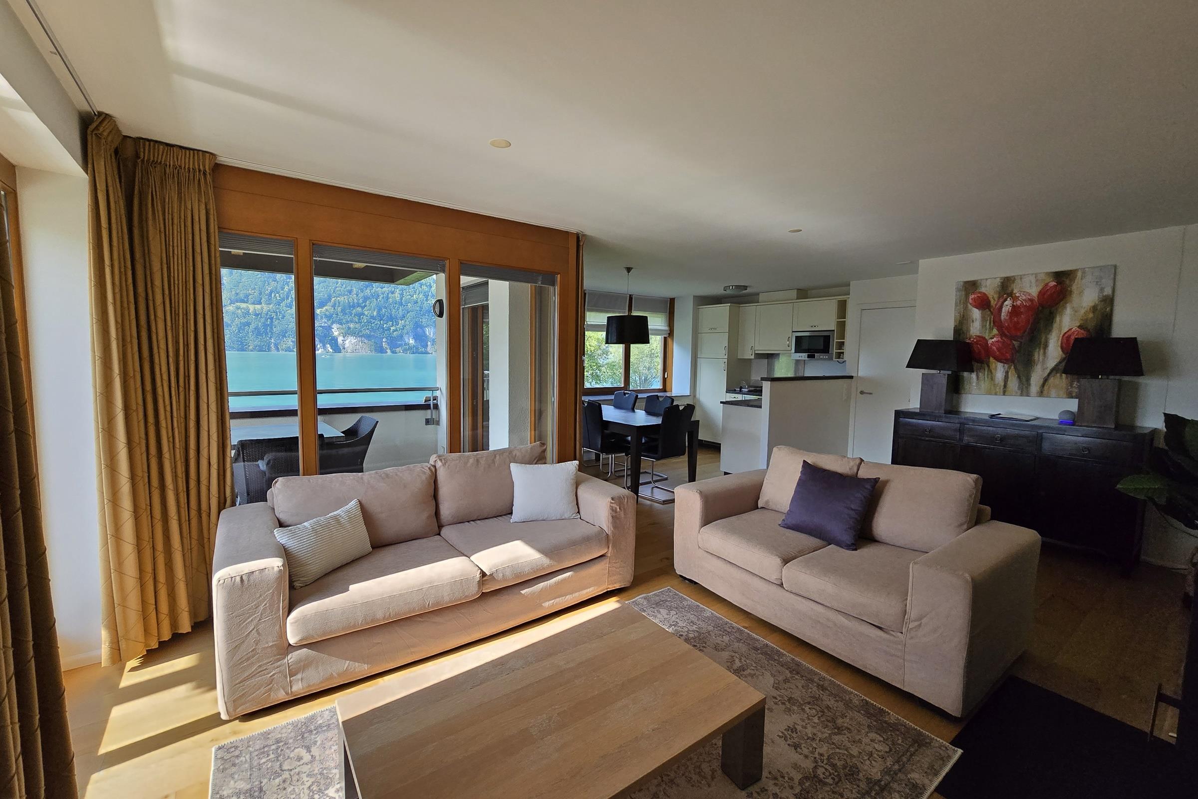 Walensee House & Apartments - directly on Lake Walen "Home is where you feel good and are treated well". The location on Lake Walen is breathtaking and offers an incredible view of the majestic Churfirsten peaks above Lake Walen. On the grounds of Resort Walensee there is a restaurant, a café and a sports shop with a wide selection of sports equipment, clothing and accessories. Last but not least, the SeeJet cable car is just a few steps away and takes you to the skiing, biking and hiking area of Flumserberg. In summer, after a hike in the mountains, the beautiful beach at Lake Walen invites you to swim and linger. So the holiday apartment of your choice is the ideal starting point for a few days' holiday for those seeking peace and quiet, for active people, for connoisseurs but also for families. We are pleased to announce the partnership with Tennis Club Terza. All apartment owner and guests of Walensee House & Apartments will be able to play tennis for free during their stay in one of our apartments. Details of the individual apartment 7x Comfort apartment (4-6 persons) with terrace 5x Deluxe apartment (4 - 6 persons) with terrace 5x Deluxe Penthouse (4 - 6 persons) with terrace 6x Penthouse apartment (6 - 8 persons) with terrace Interior
