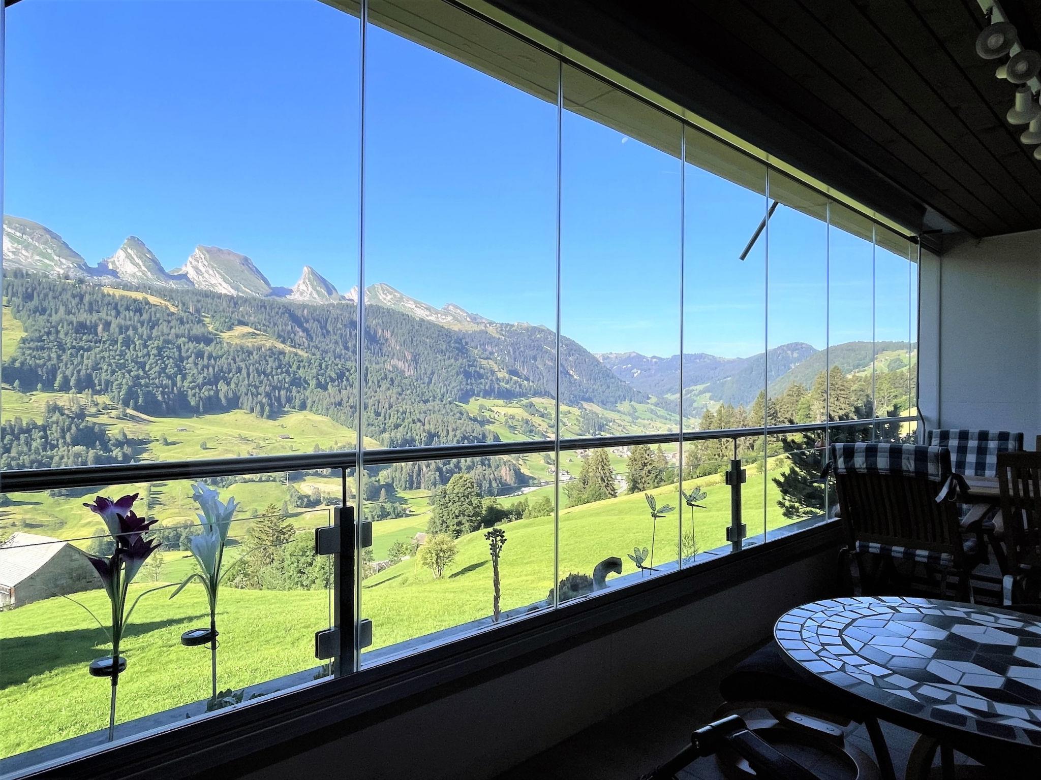 "Vista Montagna", 2-room apartment 75 m2 on 1st floor. Object suitable for 4 adults. 1 room with 1 french bed, open-hearth fireplace and TV. 1 room with 2 beds. Kitchen (oven, dishwasher, 4 induction hot plates, kettle, electric coffee machine, raclette grill). Shower/WC. Balcony, terrace. Barbecue. View of the mountains. Facilities: washing machine, dryer, hair dryer. Internet (WiFi, free). Please note: non-smokers only. DescriptionThe 3.5-room holiday apartment "Vista Montagna" is located in the Halden district, on the southern slope above Unterwasser. Due to its elevated position, one enjoys a breathtaking view of the Churfirsten. The highlight of the apartment is the spacious, wind-protected terrace, which is enclosed with glass and can be opened at any time. A barbecue, deck chairs and a massage chair invite you to complete relaxation after a walk in the beautiful winter or summer landscape. You will also feel immediately comfortable in the generous living room with a fireplace and another massage chair. The apartment is situated in the middle of the Toggenburg mountain world, which offers numerous activities all year round. Additionally, a storage/ski room, a laundry room, an underground parking space and various outdoor parking spaces are available.Mandatory or included services:Bed linen : CHF 12.00 /personFinal Cleaning : CHF 140.00 /bookinggarage and car park : IncludedHeating : IncludedInternet Access : IncludedStarter Package : CHF 25.00 /bookingTowels : CHF 8.00 /personCheck-in schedule:1.1-31.12 from 00:00 to 23:59, Monday, Tuesday, Wednesday, Thursday, Friday, Saturday, SundayCheck-out schedule: 10:00