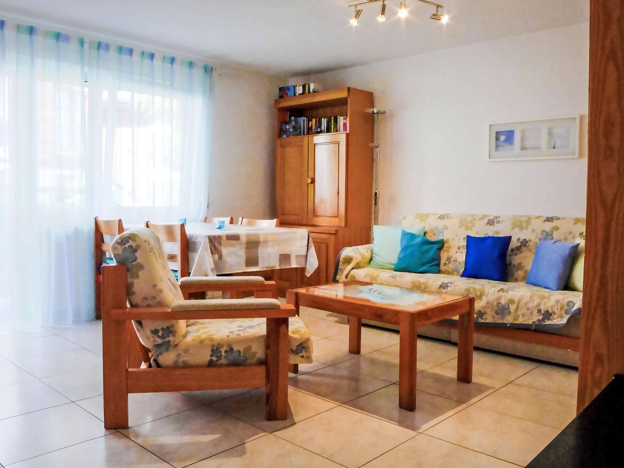 2-room apartment 65 m2, on the ground floor. Comfortable and beautiful furnishings: living/sleeping room with 1 double wall-trunk bed (140 cm, length 200 cm), open-hearth fireplace, dining table and TV. Exit to the terrace. 1 double bedroom with 2 beds (90 cm, length 200 cm). Kitchen (3 hot plates, oven, dishwasher, toaster, kettle, freezer, electric coffee machine, raclette grill, fondue Set (cheese)). Shower/WC. Terrace 15 m2 partly roofed, south facing position and west facing position. Terrace furniture. Side view of the mountains. Facilities: hair dryer. Internet (WiFi, free). Please note: non-smokers only. Maximum 1 pet/ dog allowed.