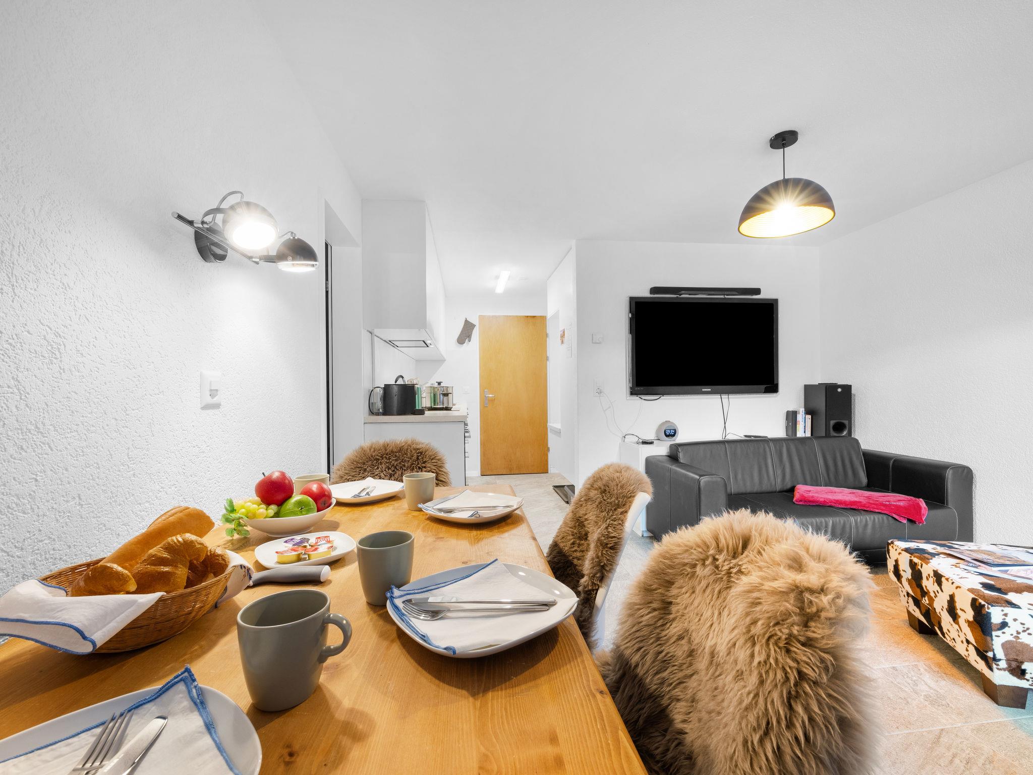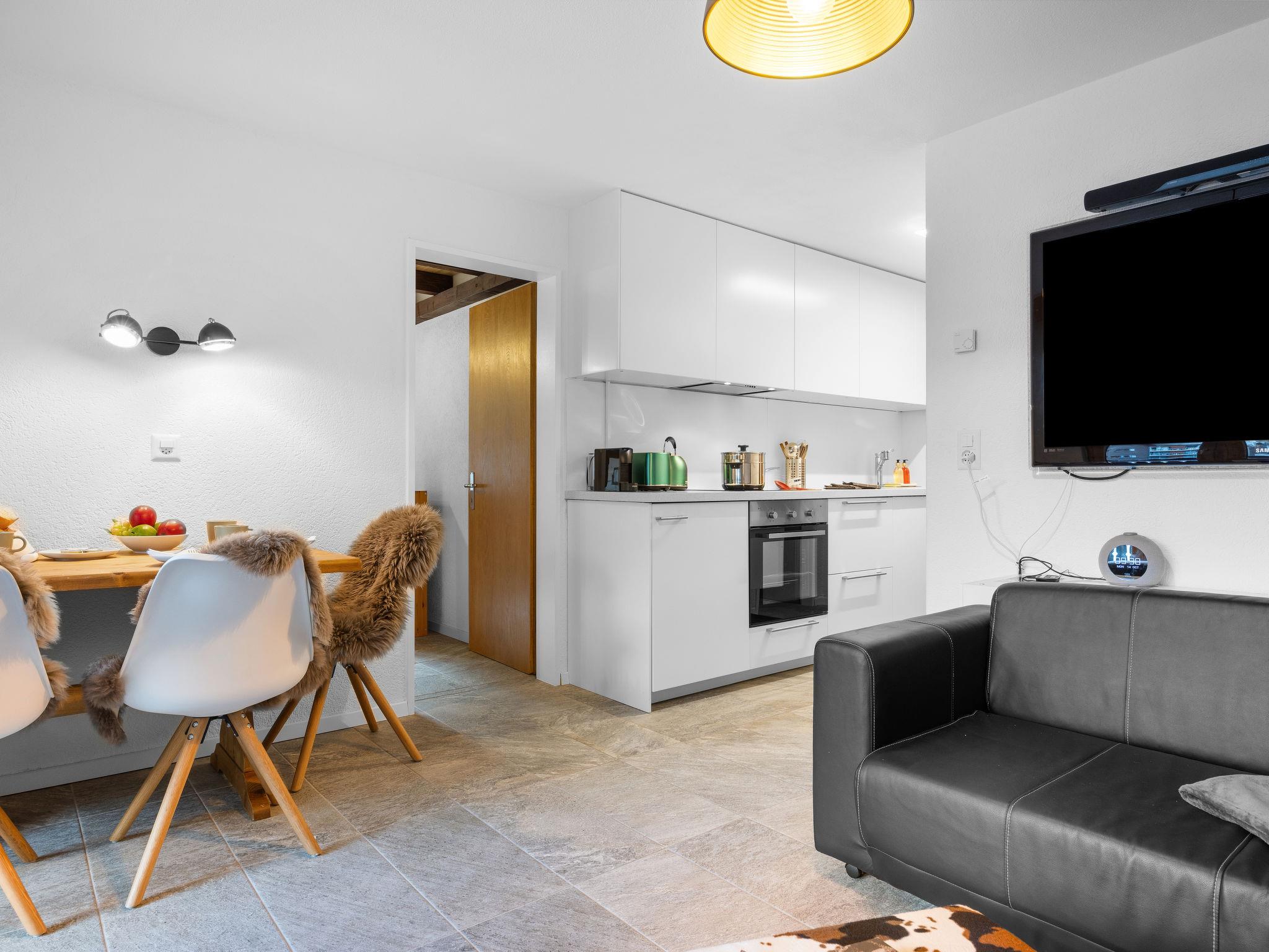 "Haus Rossignol B Apartment 2E", 2-room apartment 45 m2, north facing position. Renovated, beautiful and cosy furnishings: living room with digital TV. Exit to the balcony, north facing position. 1 room with 1 x 2 bunk beds (90 cm, length 200 cm). Open gallery with 1 double bed (1 x 160 cm, length 200 cm). Open kitchen (oven, 4 ceramic glass hob hotplates, freezer, electric coffee machine, raclette grill, fondue Set (cheese)). Bath/WC. Heating. Balcony, north facing position. Balcony furniture. Side view of the mountains. Facilities: Internet (WiFi). Please note: non-smokers only.