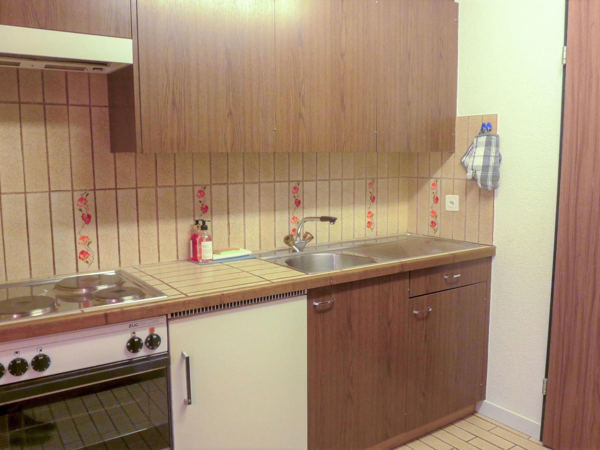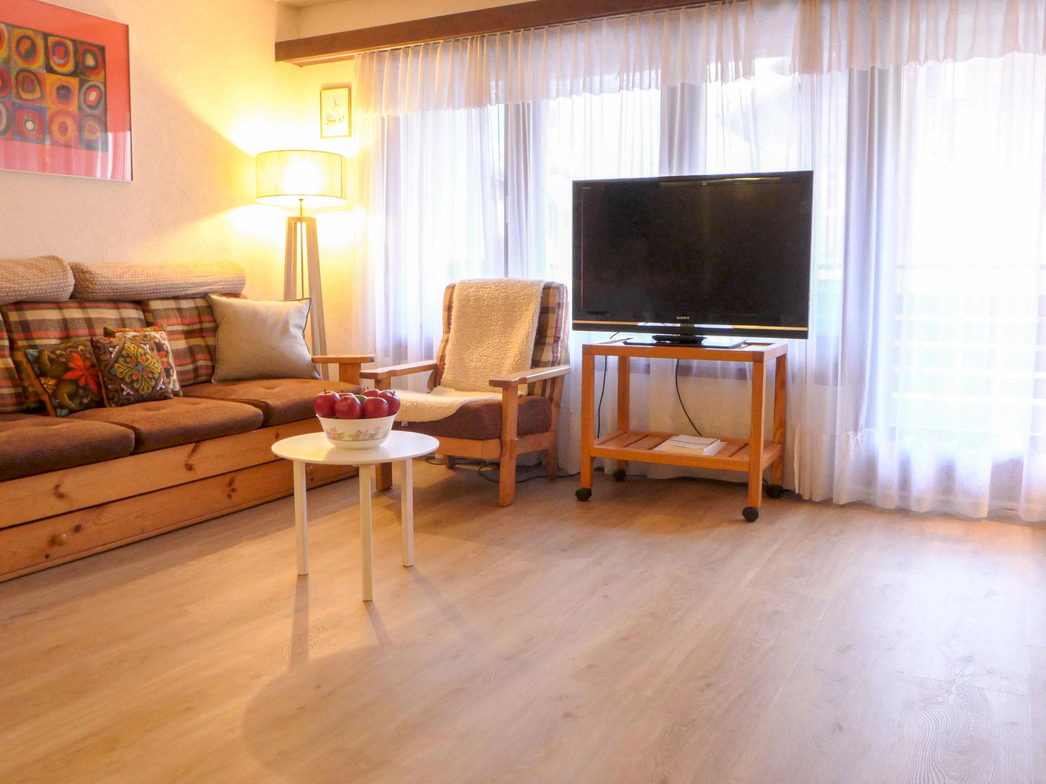 1-room apartment 25 m2 on 3rd floor. Simple and practical furnishings: living/sleeping room with 3 fold-away beds (90 cm, length 200 cm), dining table and TV. Exit to the balcony. Small kitchen in the entrance (3 hot plates, oven, toaster, kettle, freezer, electric coffee machine). Bath/WC. Balcony 8 m2. Balcony furniture. Very beautiful view of Matterhorn. Facilities: hair dryer. Internet (WiFi, free). Please note: non-smokers only. Maximum 1 pet/ dog allowed.
