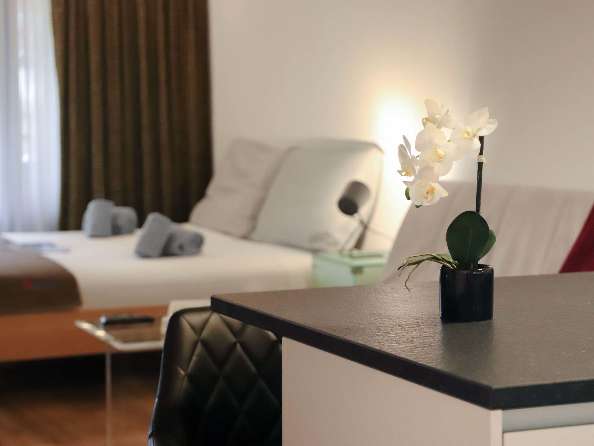 "Pasadena", 1-room apartment 46 m2 on 1st floor. Spacious and bright, beautiful and cosy furnishings: living/sleeping room with 1 double bed (2 x 90 cm, length 200 cm), dining table and TV. Exit to the balcony. Open kitchen (4 induction hot plates, toaster, kettle, microwave, freezer, electric coffee machine). Bath/WC. Balcony. Balcony furniture. Side view of the mountains. Facilities: hair dryer. Internet (WiFi, free). Please note: non-smokers only.
