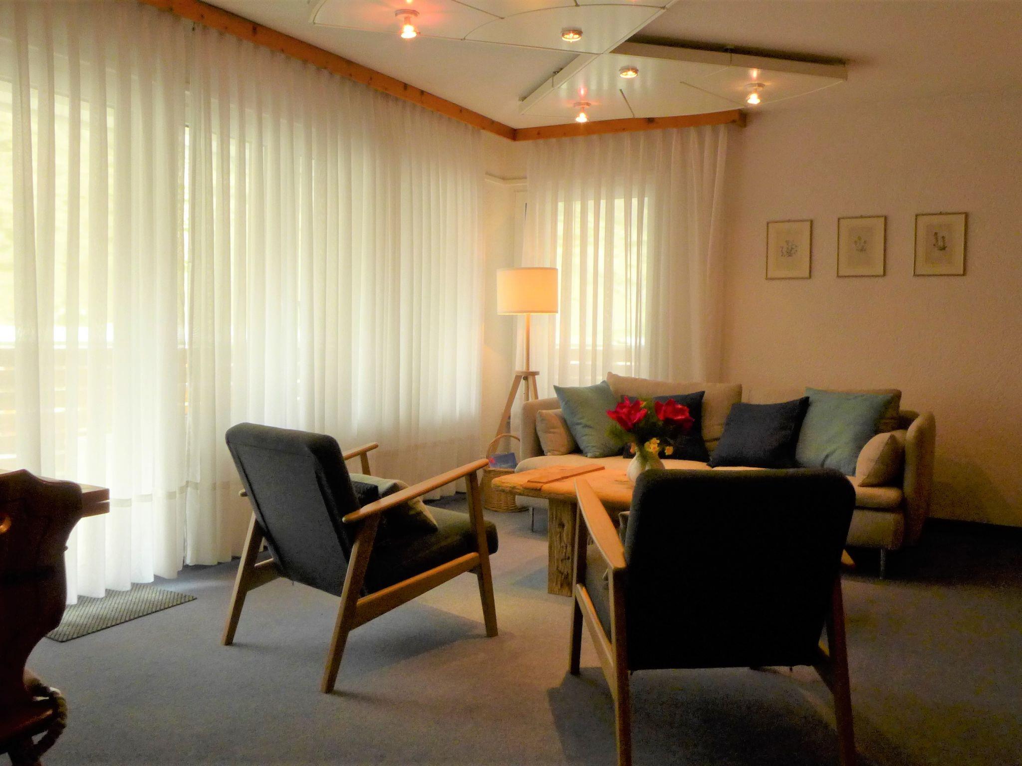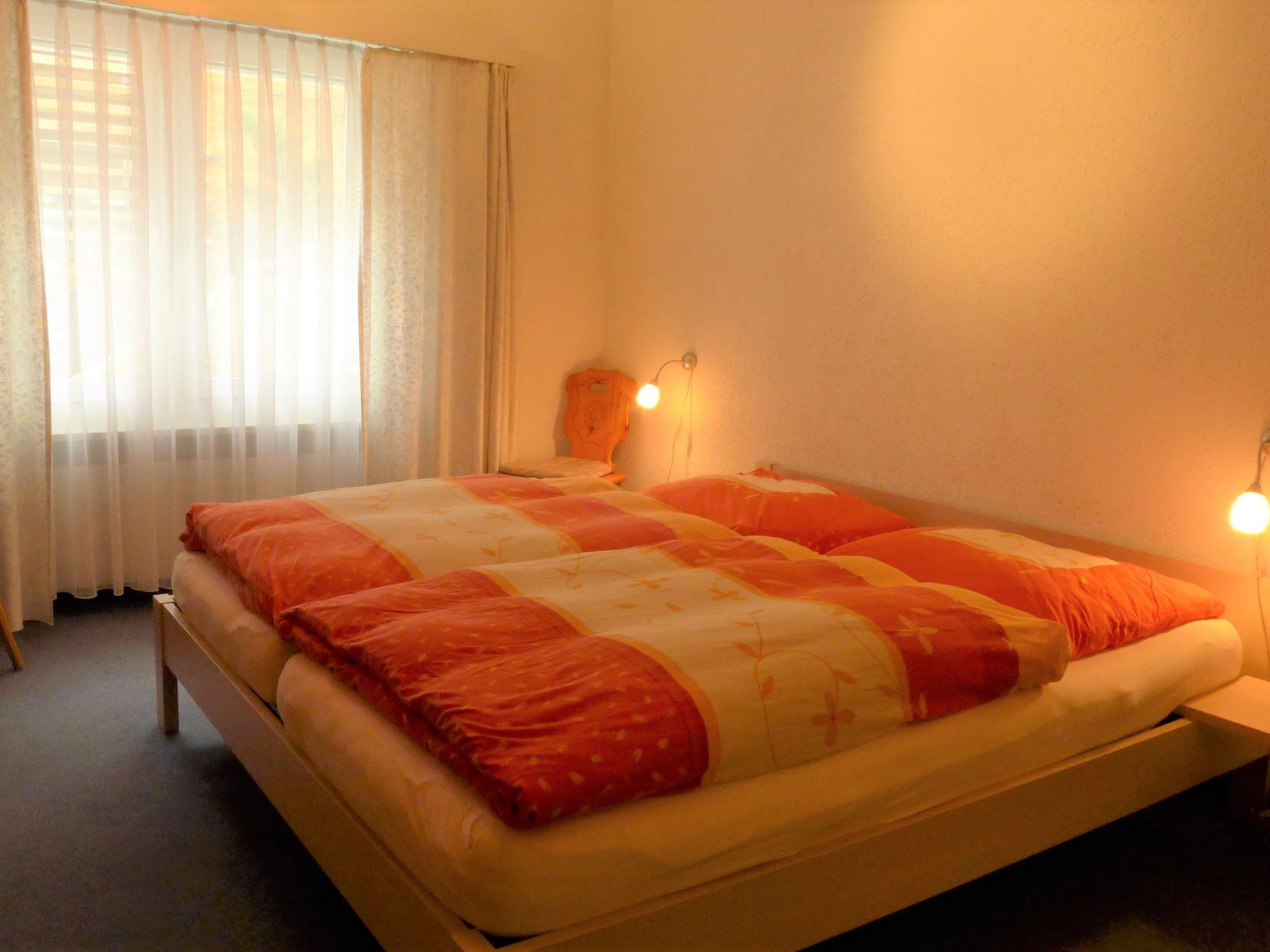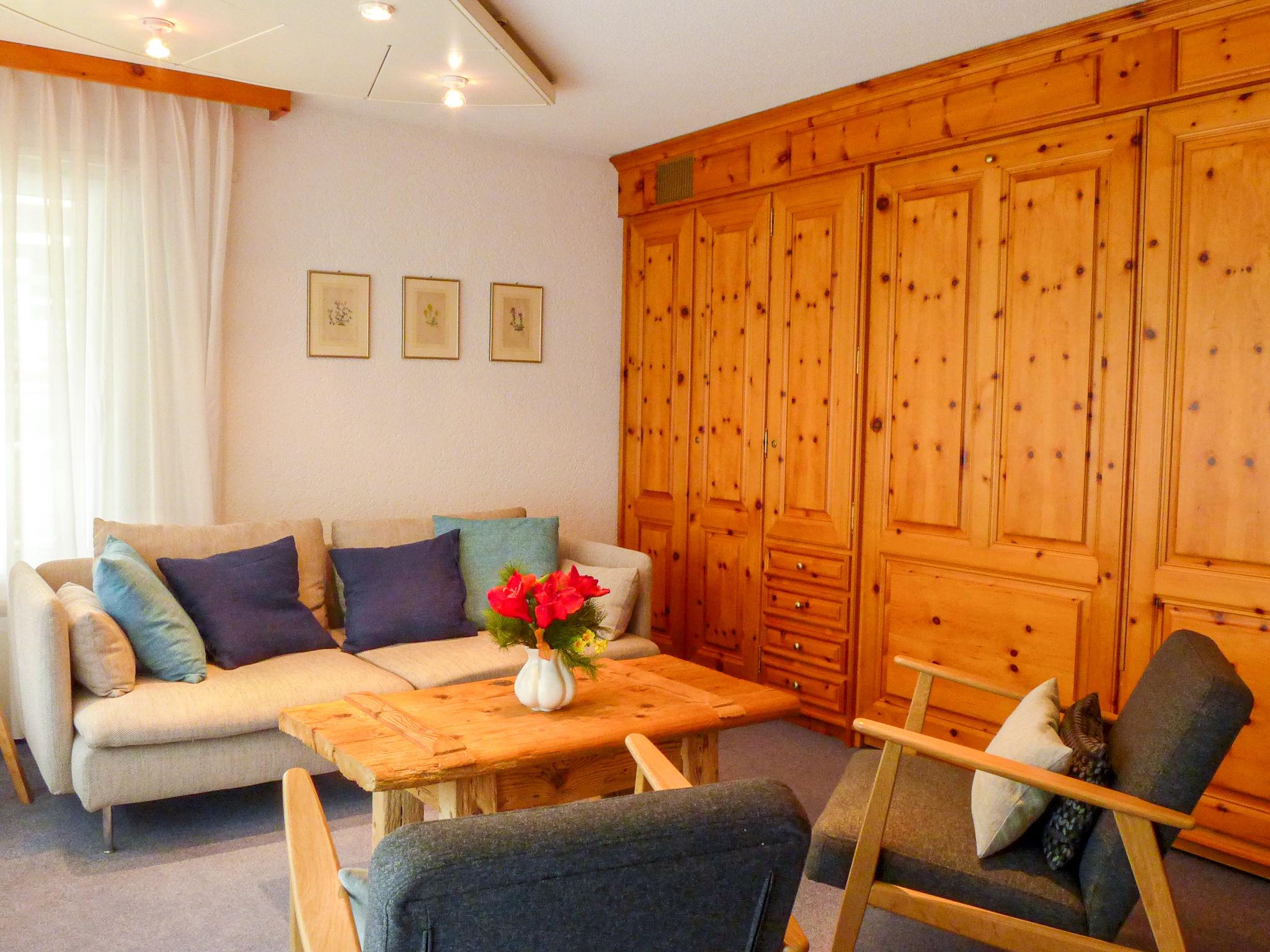 2-room apartment 60 m2, on the ground floor. Bright, simple and comfortable furnishings: living/sleeping room with 2 fold-away beds (90 cm, length 200 cm), dining table and TV. Exit to the balcony. 1 double bedroom with 1 double bed (2 x 90 cm, length 200 cm). Small kitchen (4 hot plates, oven, dishwasher, toaster, kettle, electric coffee machine, raclette grill, fondue Set (chinoise, cheese)). Bath/WC. Balcony. Balcony furniture. Beautiful view of the Matterhorn. Facilities: Internet (WiFi, free). Please note: non-smokers only.
