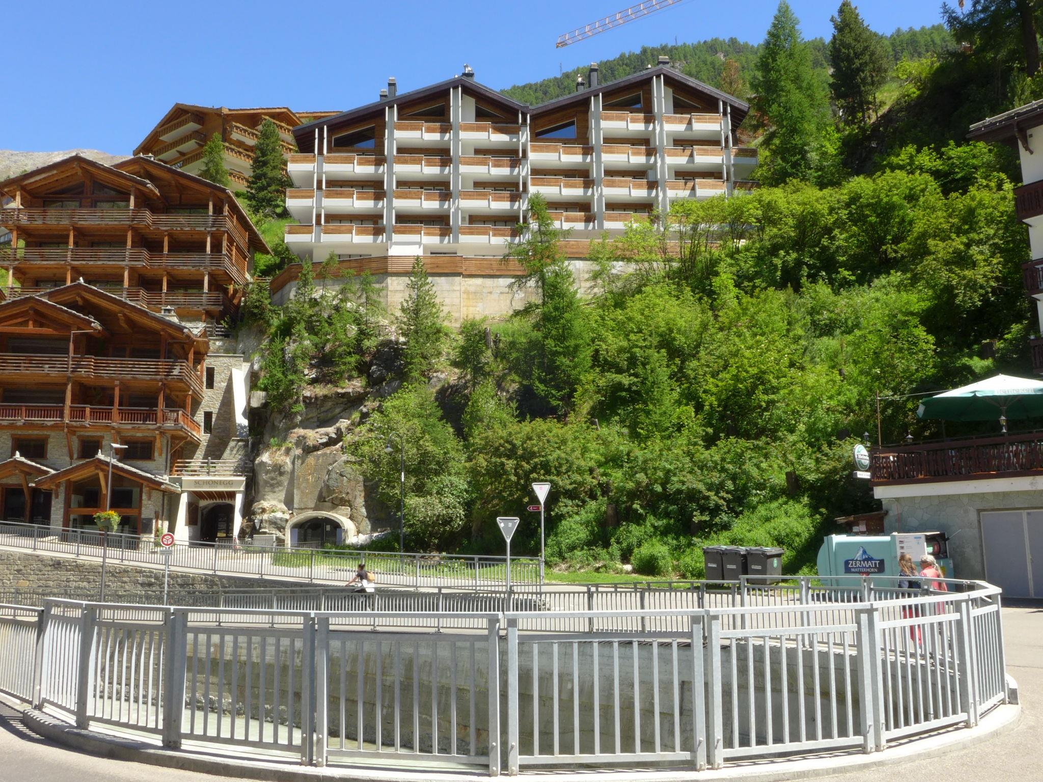 Large apartment house "Oasis", 5 storeys. In the district of Wiesti 500 m from the centre of Zermatt, on top of a hill. In the house: lift, storage room for skis, central heating system. Supermarket 350 m, restaurant 60 m, bakery 210 m, café 60 m, bicycle rental 170 m, 10 minute walk to the centre, bus stop "Getwingbrücke" 140 m, railway station "Bahnhof Zermatt" 800 m. Mountain railway, ski lift, ski rental 170 m, ski bus stop 140 m, ski school, children's ski school 450 m, children's playground 300 m. Access is by elevator to the front door.