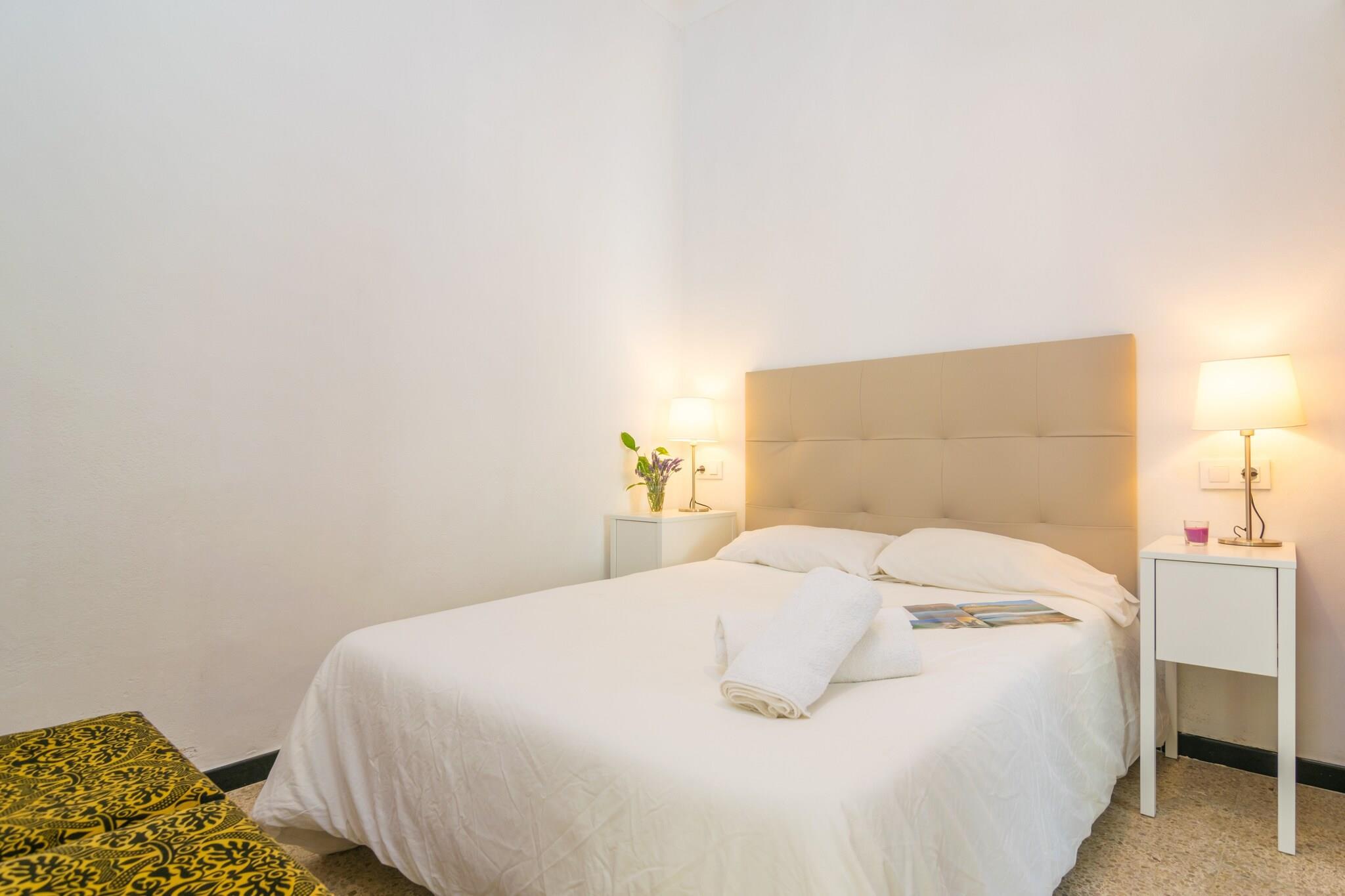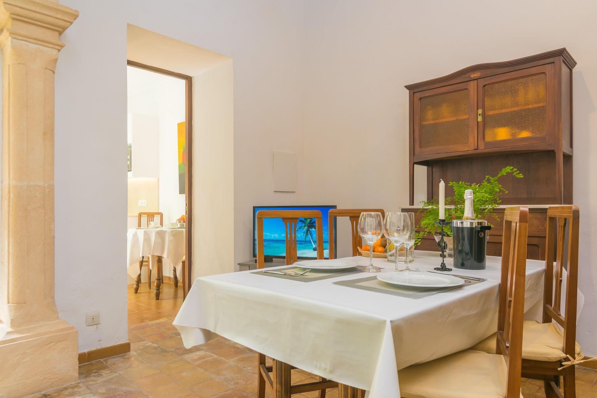 En smuk indvendig gårdhave, med et udendørs spisebord og også en brønd, inviterer til at slappe af og nyde frokoster og middage under lysthuset. Herfra kan du gå ovenpå til den øverste terrasse, hvor du kan solbade på en af liggestolene eller blot betragte den dyrebare stjernehimmel på øen. Resten af denne øverste etager er lukket. Huset ligger inden for gågaden i landsbyen, og der er naboer. Huset har kun en etage. Fra terrassen får du kun adgang til stue-spisestuen, der har en sofa og en lænestol til at se tv eller endda læse en bog samt et spisebord til 4 middagsgæster. Umiddelbart efter har du adgang til køkken-alrummet, der også har udgang til terrassen. Det er uafhængigt og er udstyret med keramisk kogeplade, ovn og et bord med stole til din morgenmad. Der er vaskemaskine, strygejern og strygebræt. For at få adgang til soveværelserne, med dobbeltseng og garderobe, kan du gøre det gennem en smuk entré. Faktisk er et af de mest imponerende elementer i huset dets store entré, hvor alle de traditionelle elementer fra den mallorcanske arkitektur, såsom brostensbelægning eller buen, der giver dig adgang til stuen, er blevet respekteret. Alcúdia er en af de smukkeste destinationer på Mallorca. Det udgør et mytisk sted takket være dets utrolige mure og dets skikke. Det er et fredeligt sted, men på samme tid er det virkelig livligt, da det har endeløse barer, restauranter, butikker, isbarer osv. Torsdage og søndage er der et fantastisk marked. Turistlicens: ETV/10082