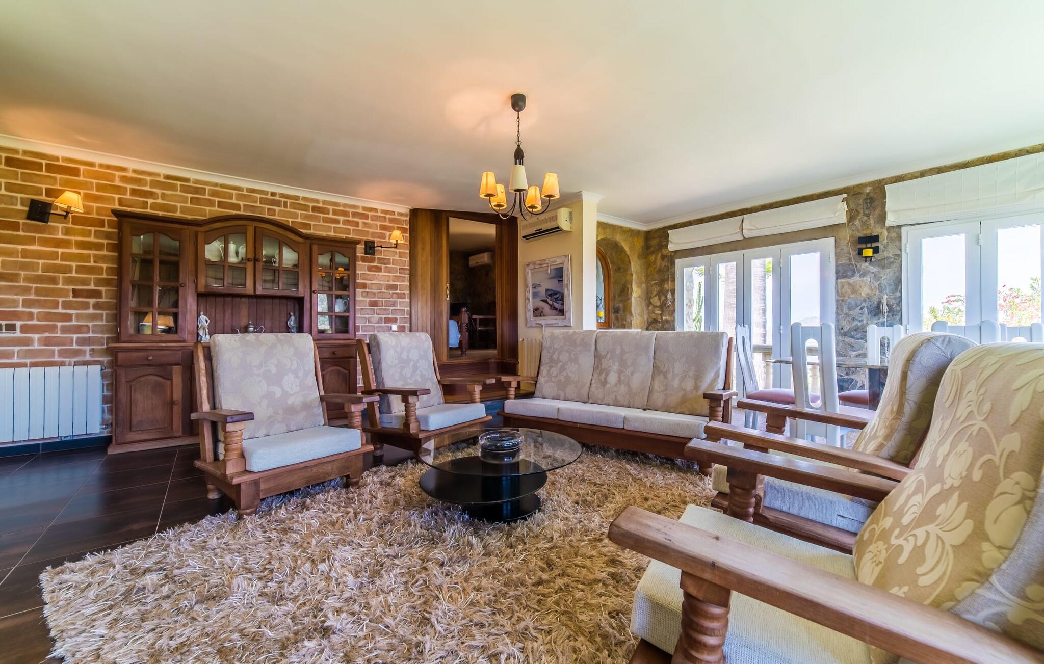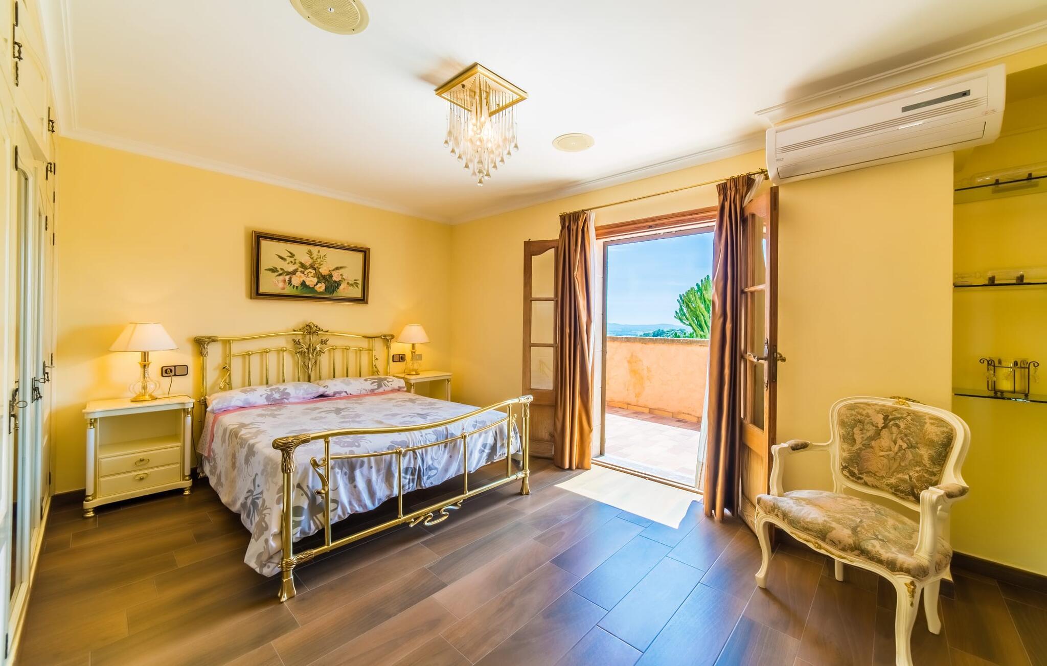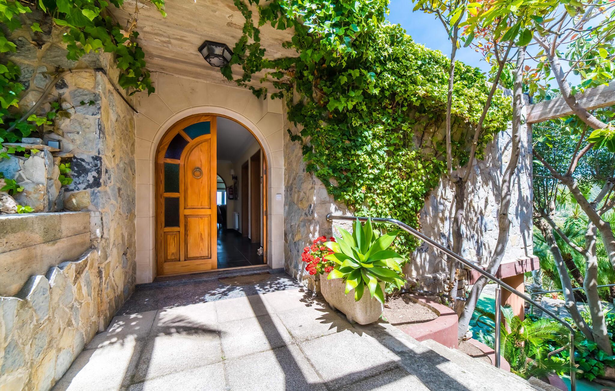 Villa "Alcudia" har en førsteklasses beliggenhed på en bjergskråning nær Mallorcas nordøstlige kyst på en betagende stor grund, der sikrer fred, privatliv og spektakulær udsigt over bugterne i Alcúdia og Pollensa. Dette er et feriehus i Fincallorca er designet i en halvcirkulær form og har en omsluttende veranda og en rummelig øvre terrasse. Poolen med et lavvandet område for børn er omgivet af en solterrasse i middelhavsstil, mens yderligere terrassemuligheder er tilgængelige. En stor muret grillplads og en lille legeplads beriger udendørsoplevelsen. Stueetagen indeholder en stor overdækket veranda, en entré med to imponerende trapper, en lys stue med spiseplads og pejs og et soveværelse med dobbeltseng anden stue har en brændeovn, satellit-tv og et poolbord. Det fuldt udstyrede køkken og bryggers er også placeret på dette niveau. På øverste etage har alle soveværelser udgang til terrassen. Det tilstødende anneks byder på en stor stue/spisestue, et andet fuldt udstyret køkken og yderligere tre soveværelser med dobbeltsenge. Med i alt fem badeværelser - inklusive et med jacuzzi - er denne ejendom ideel til større grupper eller familier, der søger både samvær og privatliv. Villaen "Alcúdia" er beliggende i en unik bjergskråning på en kæmpe 360.000 m² grund med 360 graders udsigt over havet og de grønne bjerge i den nordøstlige del af Mallorca, alt i et roligt, afsondret område kilometer fra Alcúdia-bugten Den berømte Alcanada golfbane ligger kun 10 km fra villaen.