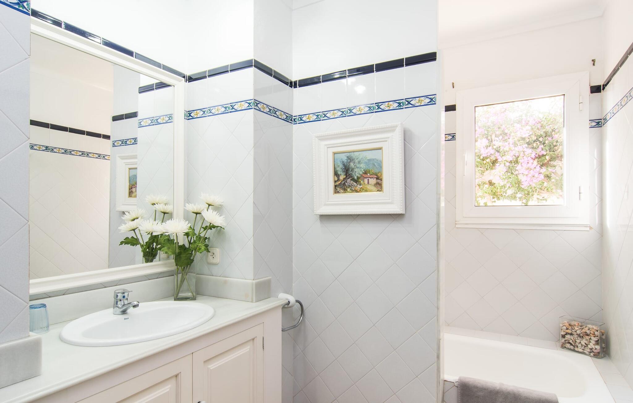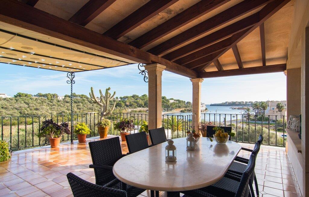 Bakkevillaen "Algueret" ligger i et velholdt boligområde over Playa de Portopedro. Omgivet af den typiske kystflora kan I nyde en uforstyrret udsigt over havet. Nyd det maritime panorama fra både balkonen i stueetagen og den 80 m² overdækkede terrasse på øverste etage. En grill er tilgængelig og perfekt komplementerer den udendørs spiseplads. Hvis I kan lide at svømme før morgenmaden, kan I besøge poolområdet. Da den indbydende villa ligger på en blind vej med kun beboelsestrafik, skal I kun krydse gaden for at svømme et par længder i den storslåede pool eller nyde et langt solbad på de medfølgende liggestole. Takket være sin indretning er den rummelige villa med havudsigt ideel til store rejsegrupper - bestående af flere familier eller en gruppe venner - og byder på masser af plads at opholde sig på og et fremragende forhold mellem pris og ydelse. Det gælder selvfølgelig også indendørs. Brunmelerede gulvfliser skaber en smuk kontrast til de hvide vægge. Alle soveværelser er i stueetagen med enten dobbeltsenge eller enkeltsenge. Hvert af de fire værelser med aircondition har et moderne flisebadeværelse, hvoraf tre har eget badeværelse. I den rummelige gang fører en naturstenstrappe dekoreret med traditionelle mallorcanske mønstre til øverste etage. Hele huset vender ud mod havet, så I kan nyde den ekstraordinære udsigt over havet helt uforstyrret fra de mange vinduer i den rummelige stue. Udover en hyggelig spiseplads bliver I også imponeret over den lyse, runde stue. Det perfekt møblerede køkken er visuelt adskilt fra den lyse spiseplads af en amerikansk disk med en førsteklasses udsigt. Tid på stranden parret med fordelene ved en charmerende havneby i gåafstand - "Algueret" tilbyder denne behagelige kombination på en særlig måde. Den solbeskinnede poolvilla "Algueret" ligger i den lille fiskerlandsby Portopedro. I nyder den frie udsigt over havet og har mulighed for at gøre jeres indkøb til fods i den lille by. Gå ture til havet og vandreture langs denne smukke sydlige kyststrækning med sine mange strande, den såkaldte Calas de Mallorca. Nogle af dem ligger i den betagende smukke naturpark Mondragó.