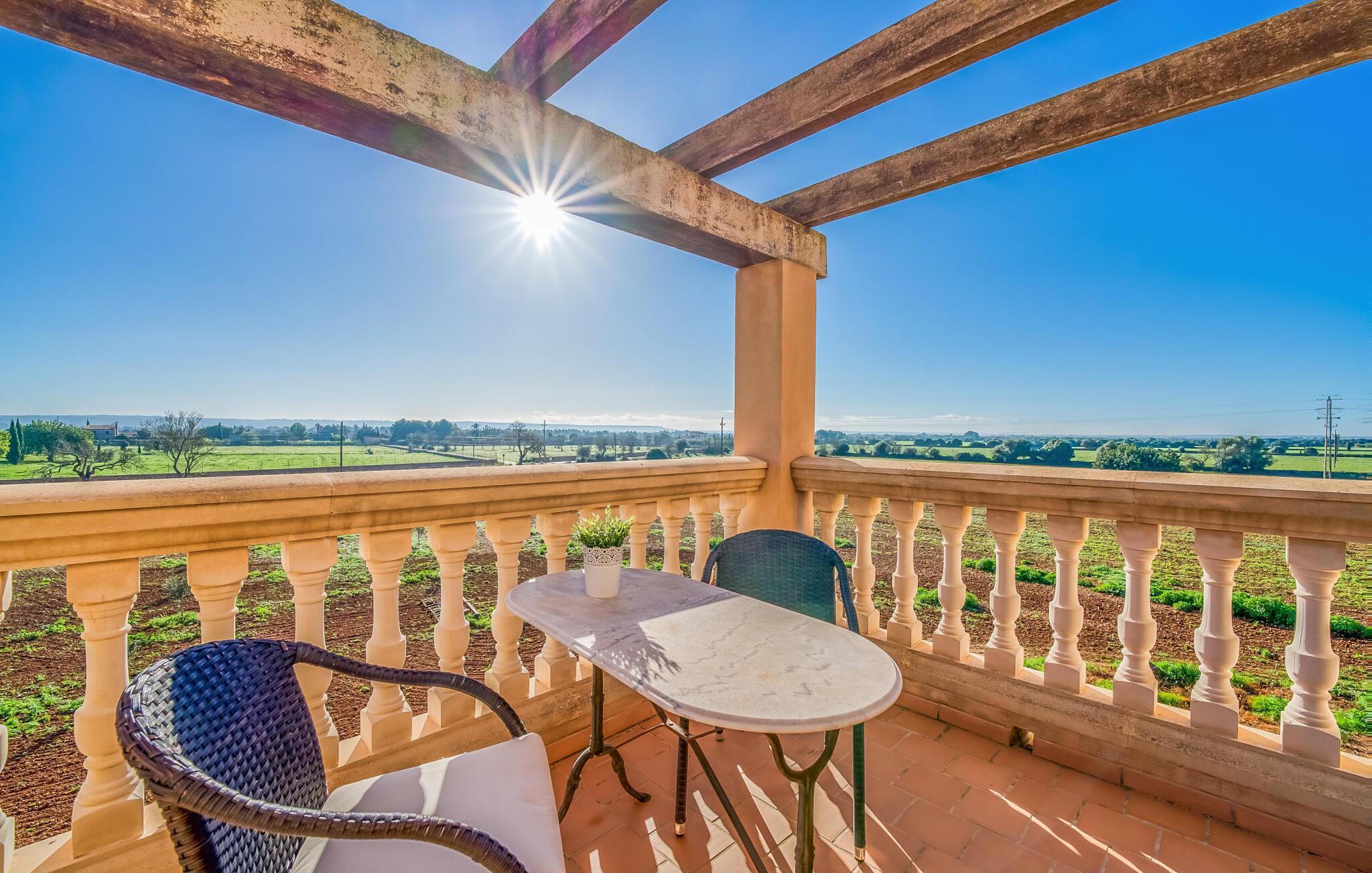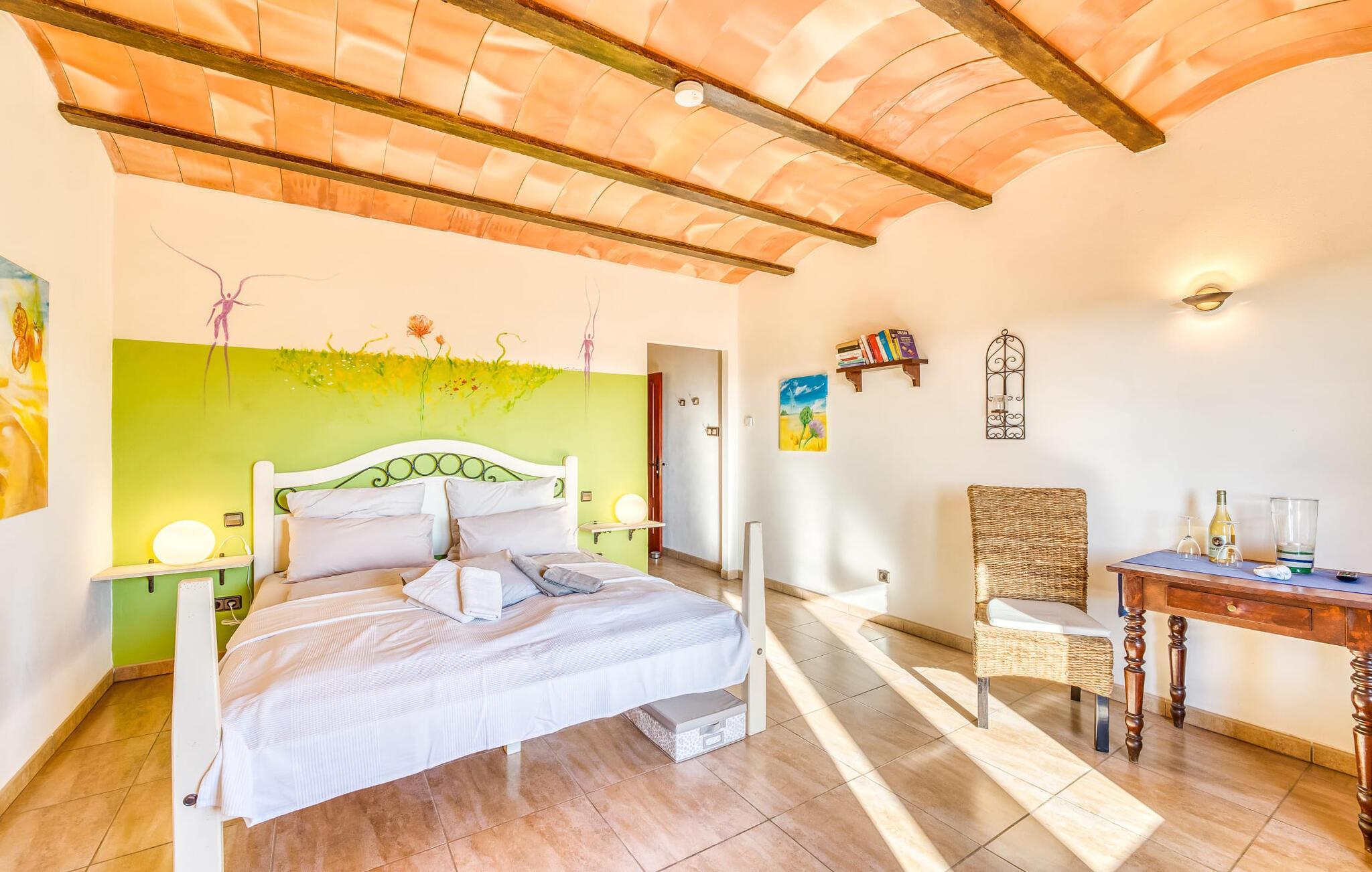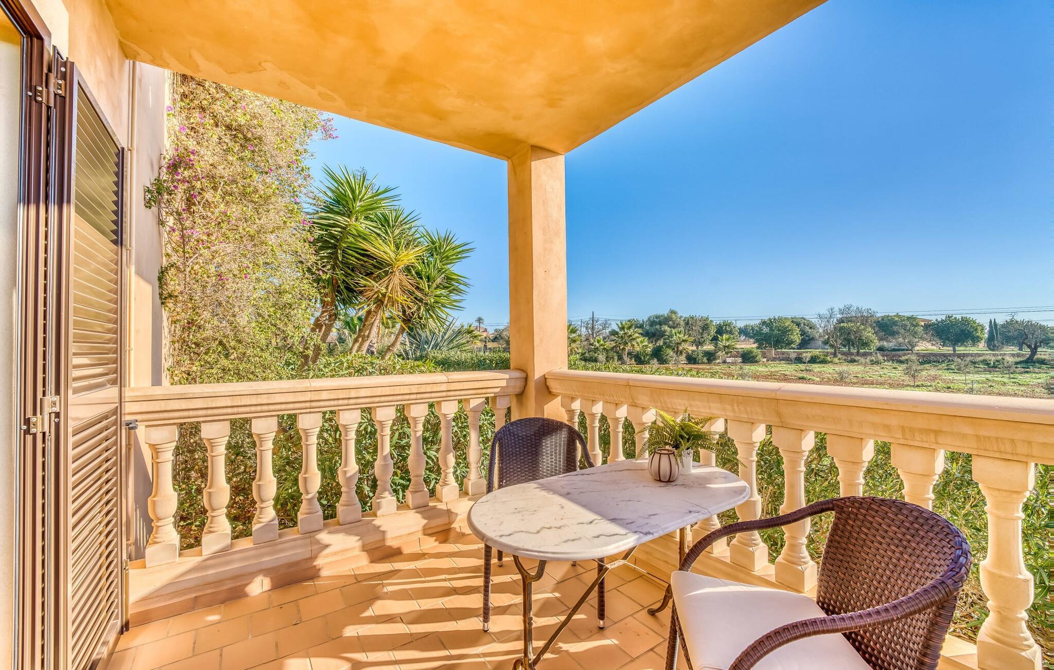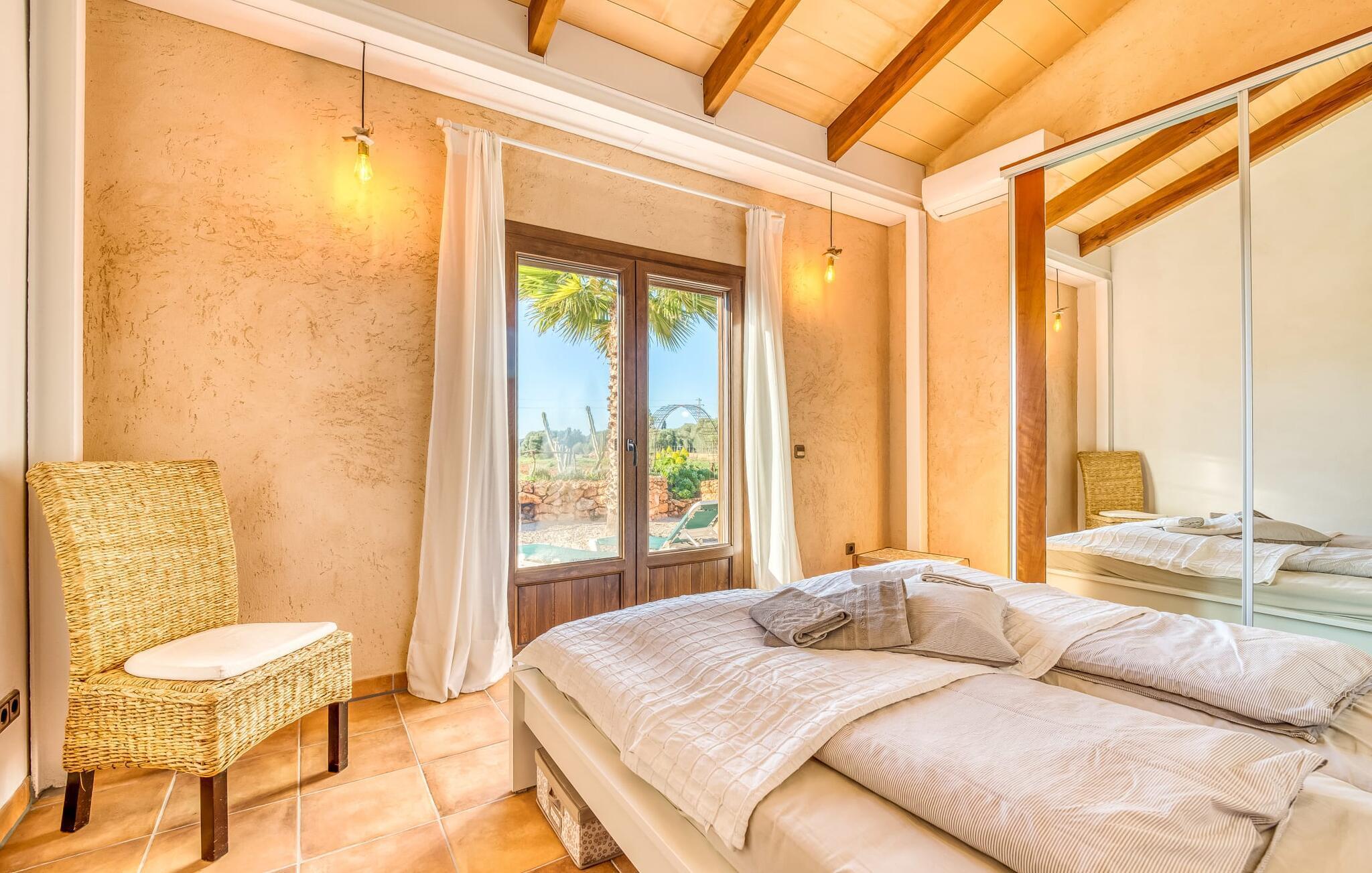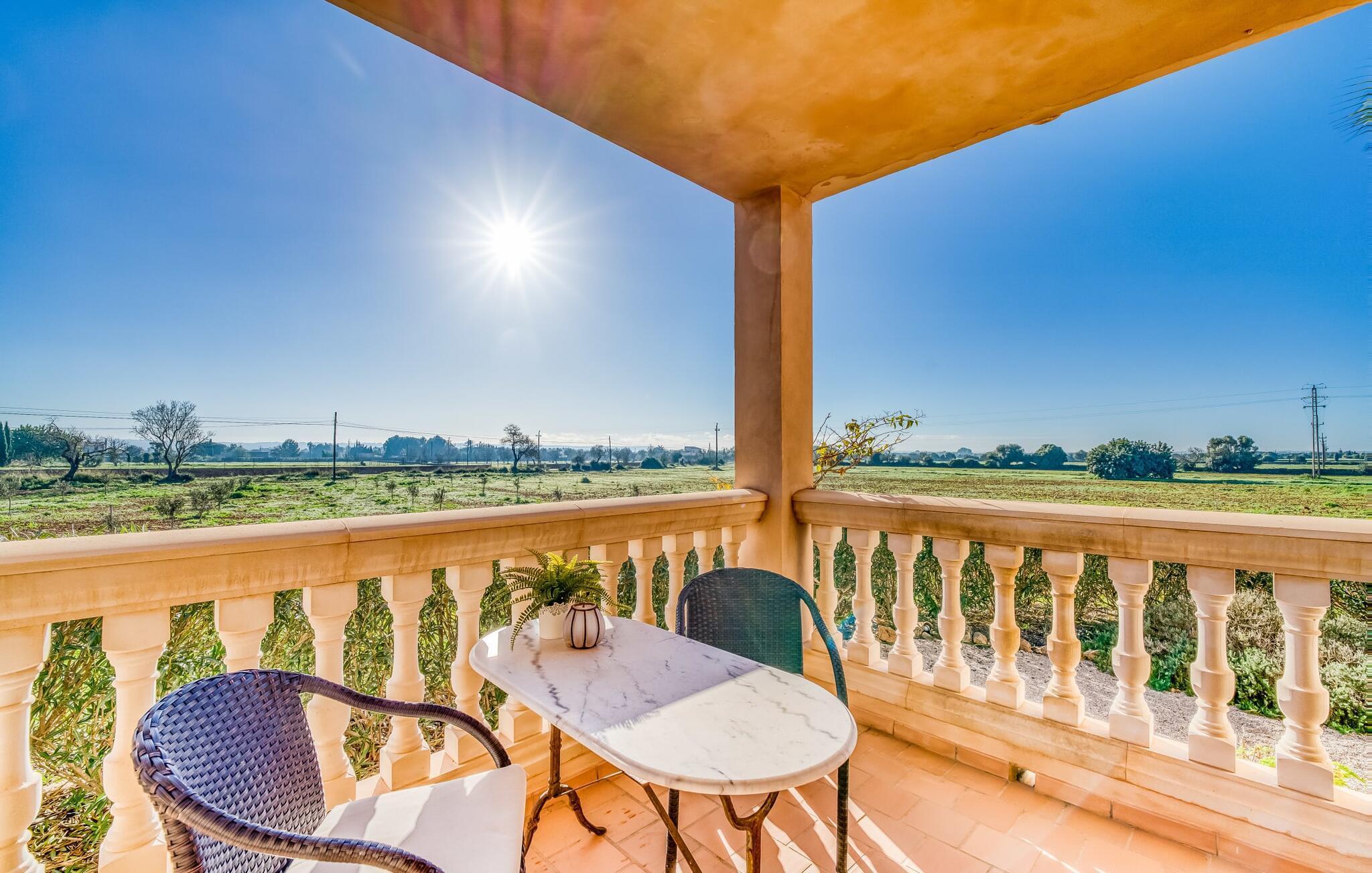 "Alqueria Fosca" er en fantastisk bondegård, smukt designet med kærlighed og sans for detaljer af sine venlige værter. Udendørsområdet er en fortryllende oase med palme-, appelsin- og mandeltræer, lyse bougainvillea og oleanderbuske. Dette er et feriehus i Fincallorca. Udover mange afslappende steder finder du et loungeområde, skyggefulde siddepladser omgivet af grønne områder og komfortable liggestole ved den klorfrie pool, perfekt til at køle af og nyde feriehyggen. Et højdepunkt er det overdækkede udekøkken med grill, gasblus, vask og køleskab, samt en spiseplads, der giver følelsen af din egen private bodega. Talrige altaner og en tagterrasse tilbyder en fantastisk udsigt over denne smukke del af det sydlige Mallorca. De fem dobbeltværelser, alle udstyret med aircondition, åbner hver ud til en balkon. De fleste værelser har deres eget køleskab, masser af opbevaringsplads og et privat brusebad, hvilket gør "Alqueria Fosca" ideel til 10 personer. Hjemmets puristiske indretning bruger naturlige farver og materialer til at skabe en rolig atmosfære, med minimal udsmykning for at forstærke følelsen af sammenhæng med naturen. De rummelige opholds-, spise- og køkkenområder afspejler denne stil, og pejsen, gulvvarmen og hjemmekontorets egnethed gør dette landsted til et perfekt tilflugtssted året rundt. Landstedet "Alqueria Fosca" er indlejret i en oase-lignende have med poolområde og et fantastisk udekøkken. Det skønne feriehus har en førsteklasses beliggenhed lige syd for Campos, hvor du kan gøre dine indkøb. Drømmestranden Es Trenc ligger kun 15 minutter væk i bil.