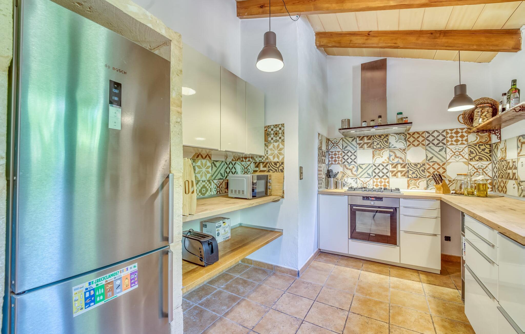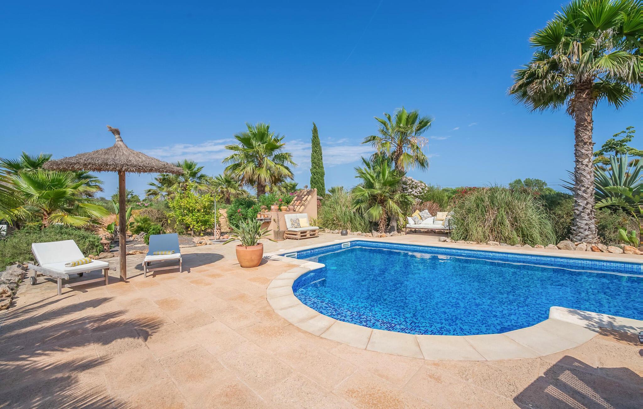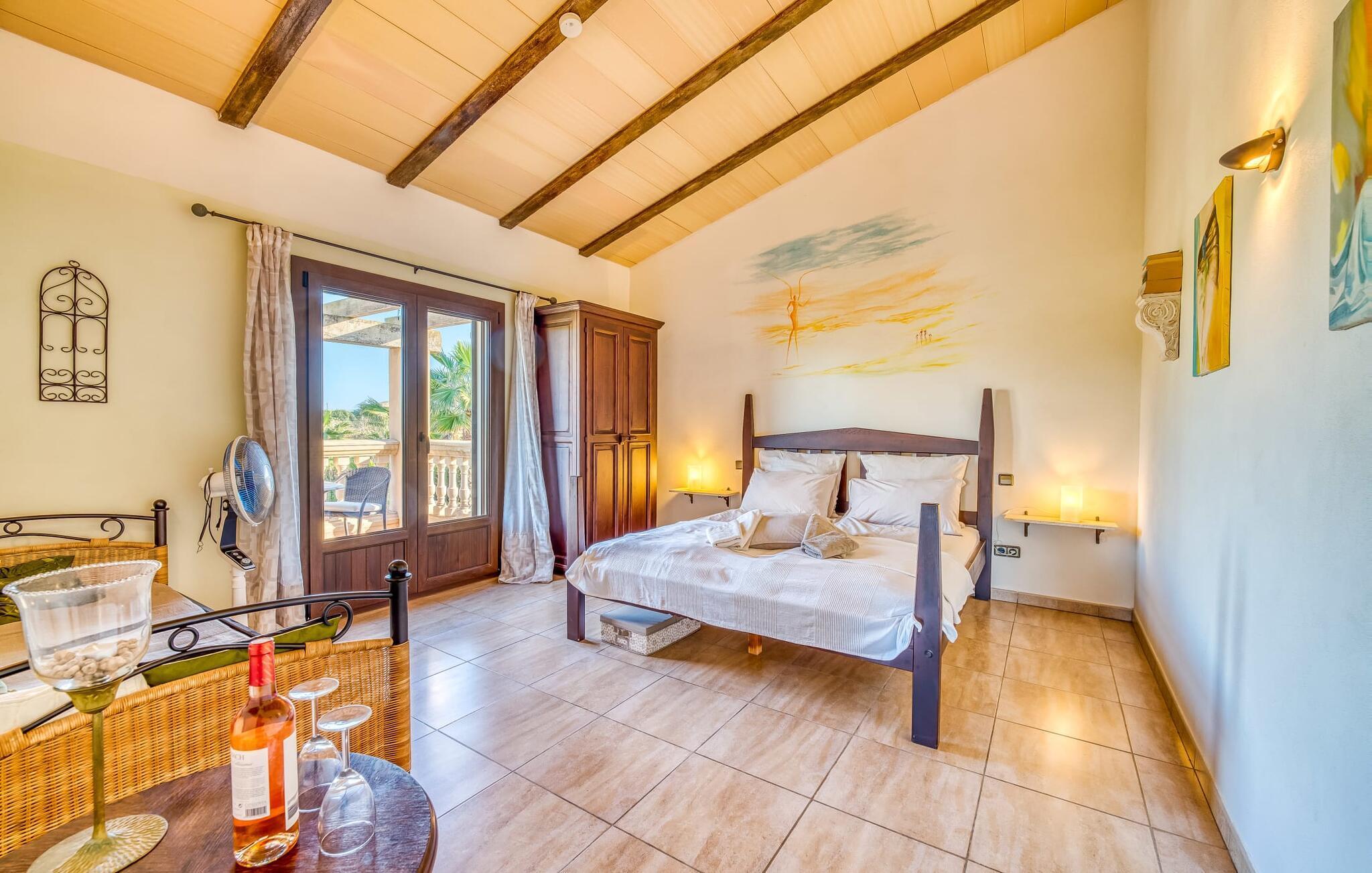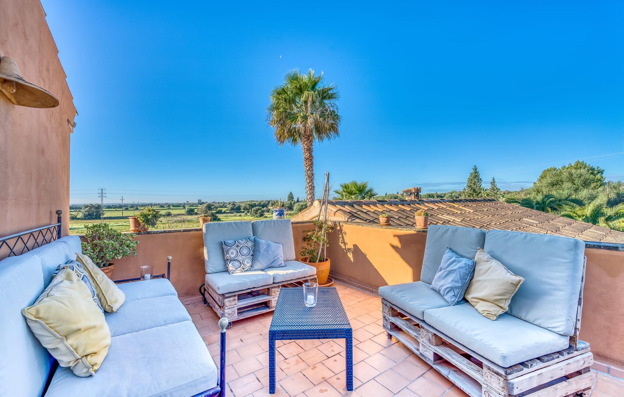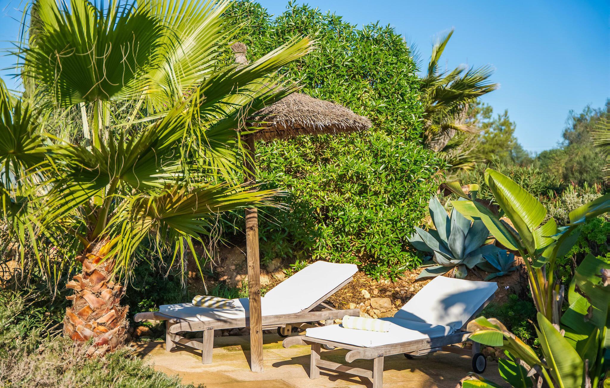 "Alqueria Fosca" er en fantastisk bondegård, smukt designet med kærlighed og sans for detaljer af sine venlige værter. Udendørsområdet er en fortryllende oase med palme-, appelsin- og mandeltræer, lyse bougainvillea og oleanderbuske. Dette er et feriehus i Fincallorca. Udover mange afslappende steder finder du et loungeområde, skyggefulde siddepladser omgivet af grønne områder og komfortable liggestole ved den klorfrie pool, perfekt til at køle af og nyde feriehyggen. Et højdepunkt er det overdækkede udekøkken med grill, gasblus, vask og køleskab, samt en spiseplads, der giver følelsen af din egen private bodega. Talrige altaner og en tagterrasse tilbyder en fantastisk udsigt over denne smukke del af det sydlige Mallorca. De fem dobbeltværelser, alle udstyret med aircondition, åbner hver ud til en balkon. De fleste værelser har deres eget køleskab, masser af opbevaringsplads og et privat brusebad, hvilket gør "Alqueria Fosca" ideel til 10 personer. Hjemmets puristiske indretning bruger naturlige farver og materialer til at skabe en rolig atmosfære, med minimal udsmykning for at forstærke følelsen af sammenhæng med naturen. De rummelige opholds-, spise- og køkkenområder afspejler denne stil, og pejsen, gulvvarmen og hjemmekontorets egnethed gør dette landsted til et perfekt tilflugtssted året rundt. Landstedet "Alqueria Fosca" er indlejret i en oase-lignende have med poolområde og et fantastisk udekøkken. Det skønne feriehus har en førsteklasses beliggenhed lige syd for Campos, hvor du kan gøre dine indkøb. Drømmestranden Es Trenc ligger kun 15 minutter væk i bil.