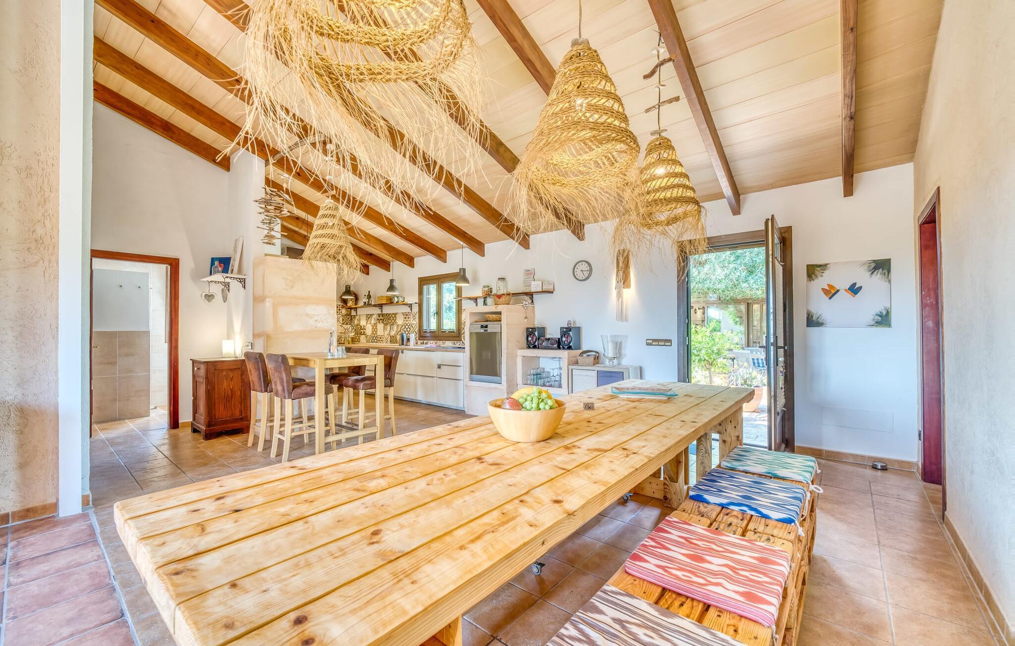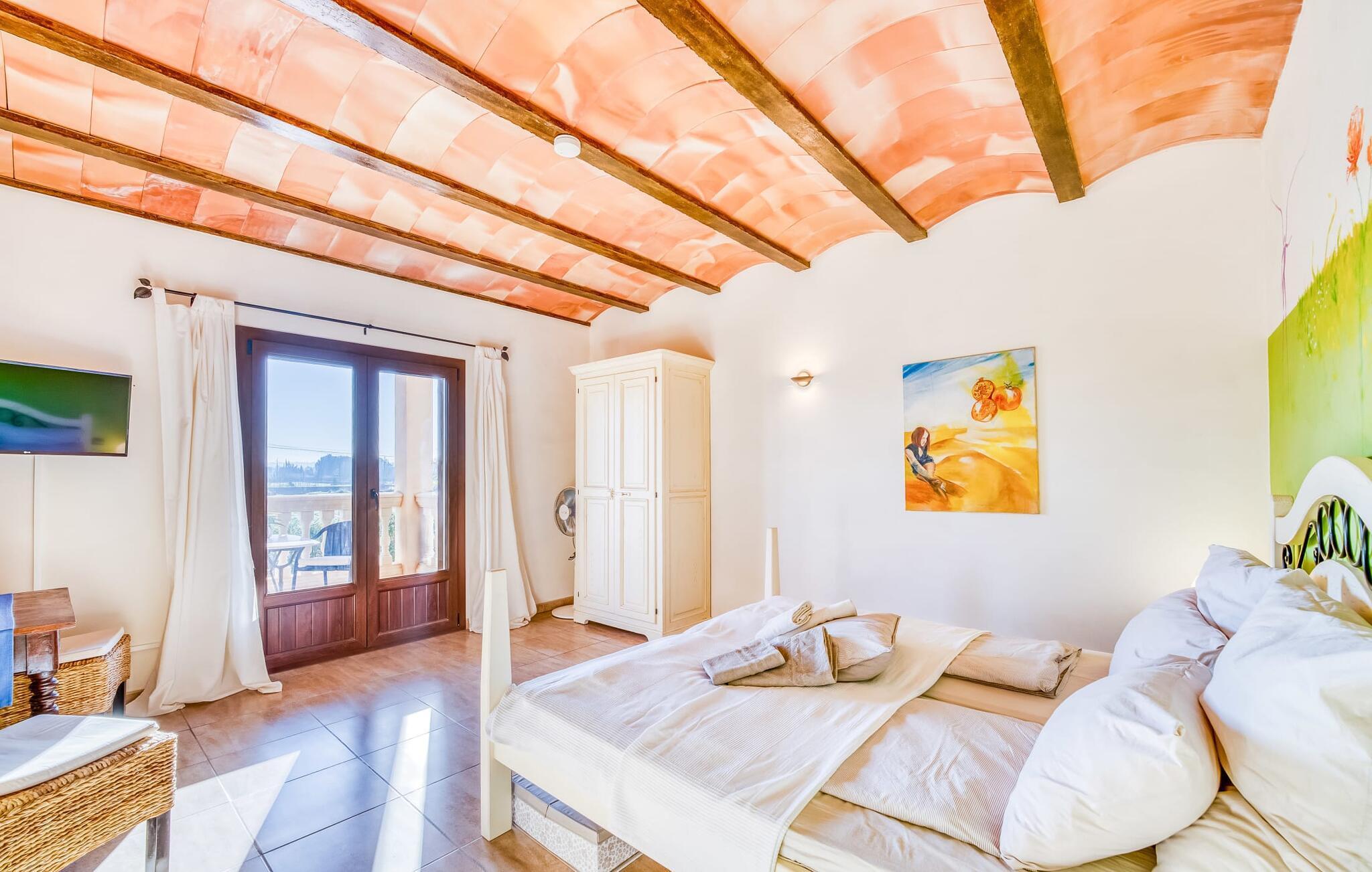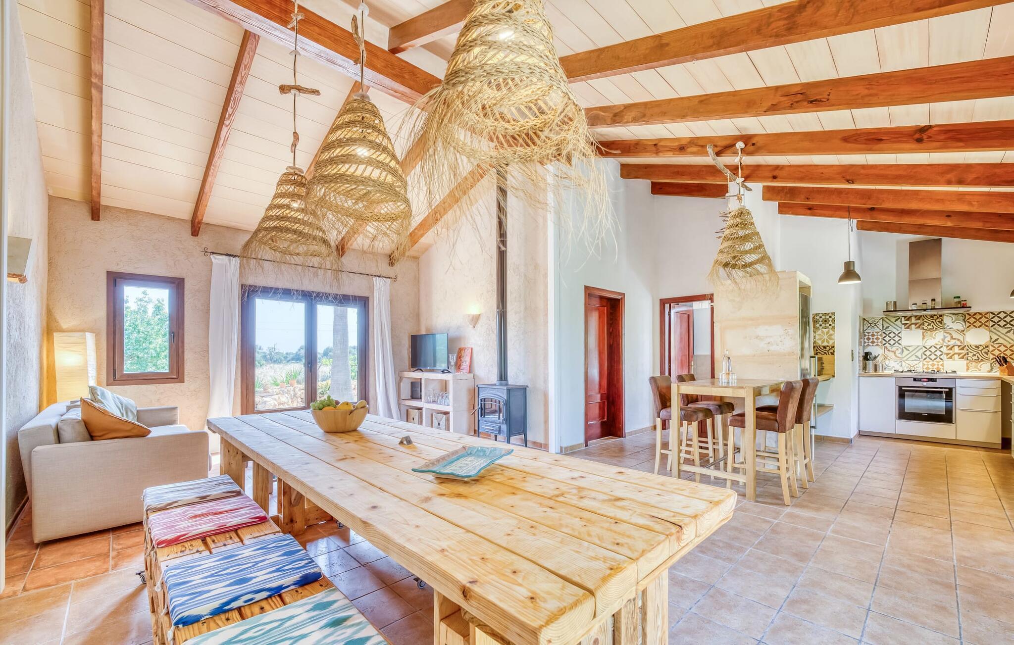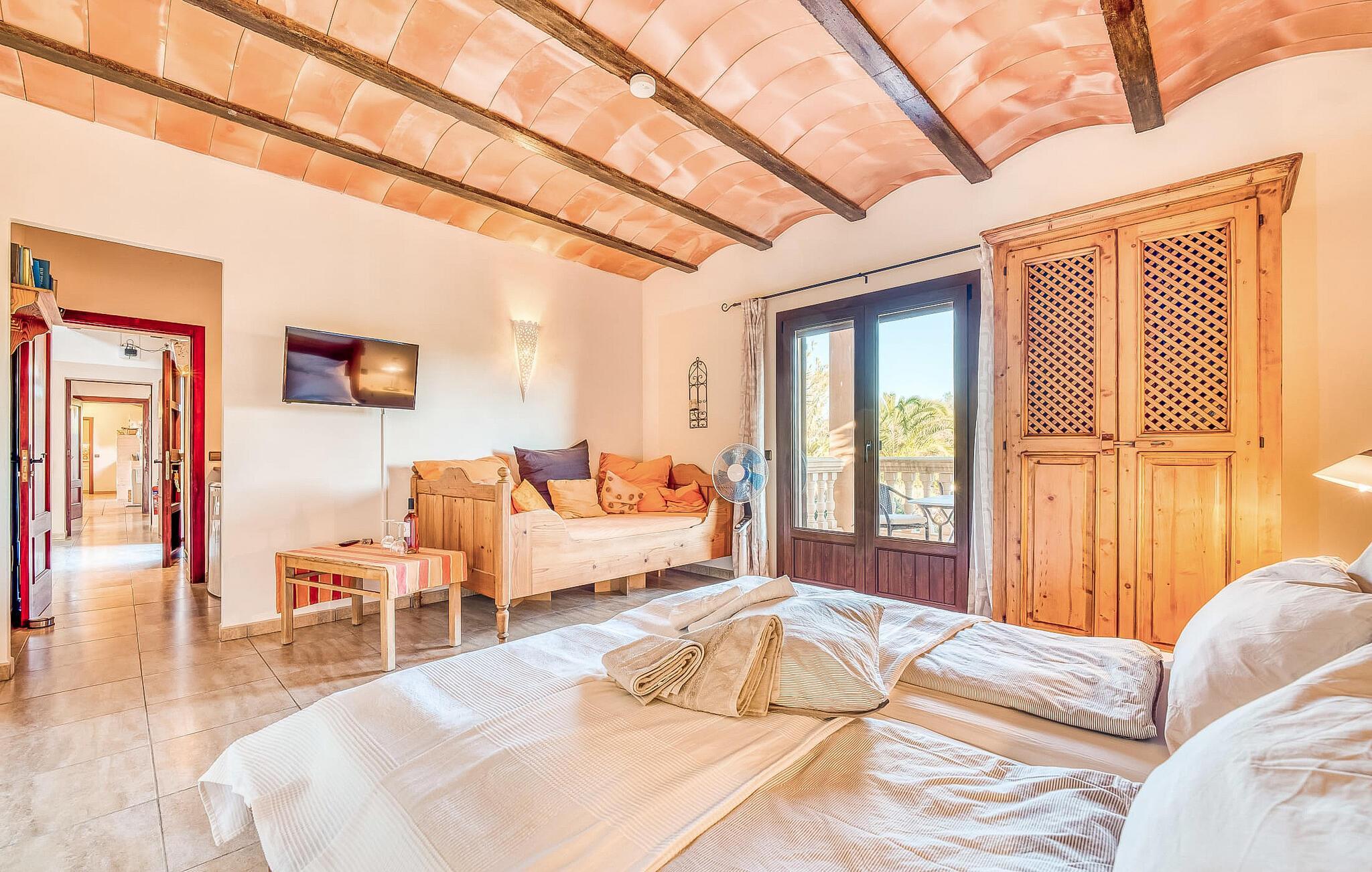 "Alqueria Fosca" er en fantastisk bondegård, smukt designet med kærlighed og sans for detaljer af sine venlige værter. Udendørsområdet er en fortryllende oase med palme-, appelsin- og mandeltræer, lyse bougainvillea og oleanderbuske. Dette er et feriehus i Fincallorca. Udover mange afslappende steder finder du et loungeområde, skyggefulde siddepladser omgivet af grønne områder og komfortable liggestole ved den klorfrie pool, perfekt til at køle af og nyde feriehyggen. Et højdepunkt er det overdækkede udekøkken med grill, gasblus, vask og køleskab, samt en spiseplads, der giver følelsen af din egen private bodega. Talrige altaner og en tagterrasse tilbyder en fantastisk udsigt over denne smukke del af det sydlige Mallorca. De fem dobbeltværelser, alle udstyret med aircondition, åbner hver ud til en balkon. De fleste værelser har deres eget køleskab, masser af opbevaringsplads og et privat brusebad, hvilket gør "Alqueria Fosca" ideel til 10 personer. Hjemmets puristiske indretning bruger naturlige farver og materialer til at skabe en rolig atmosfære, med minimal udsmykning for at forstærke følelsen af sammenhæng med naturen. De rummelige opholds-, spise- og køkkenområder afspejler denne stil, og pejsen, gulvvarmen og hjemmekontorets egnethed gør dette landsted til et perfekt tilflugtssted året rundt. Landstedet "Alqueria Fosca" er indlejret i en oase-lignende have med poolområde og et fantastisk udekøkken. Det skønne feriehus har en førsteklasses beliggenhed lige syd for Campos, hvor du kan gøre dine indkøb. Drømmestranden Es Trenc ligger kun 15 minutter væk i bil.