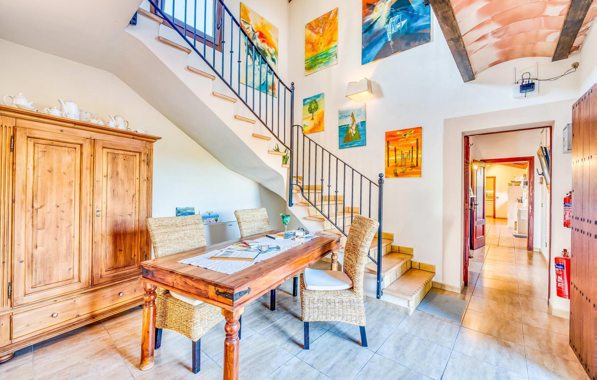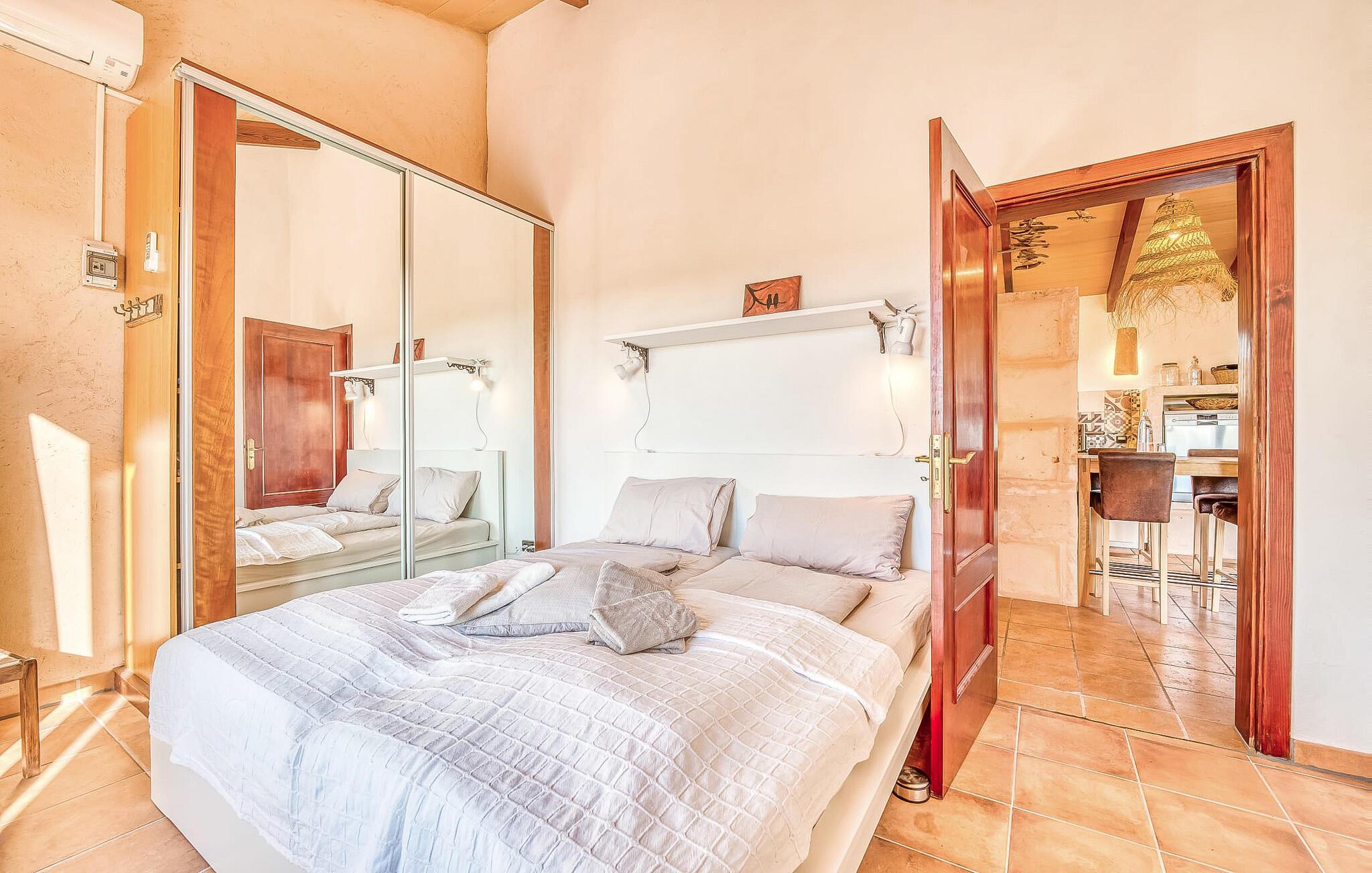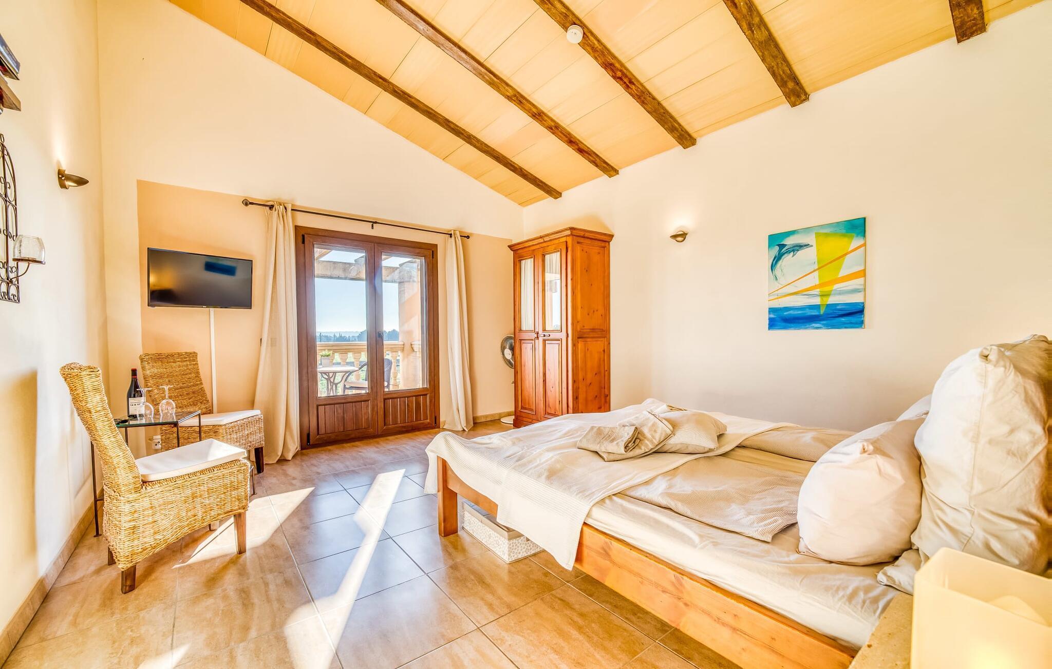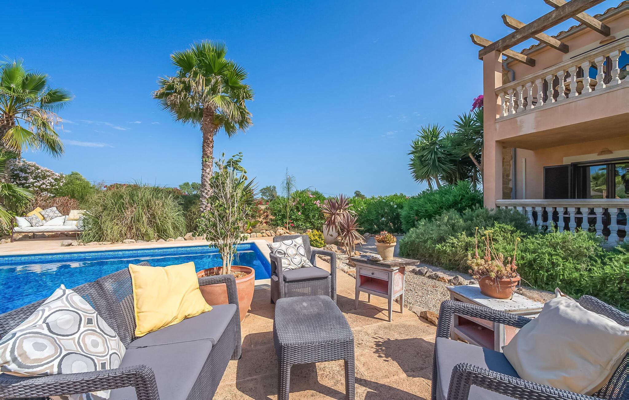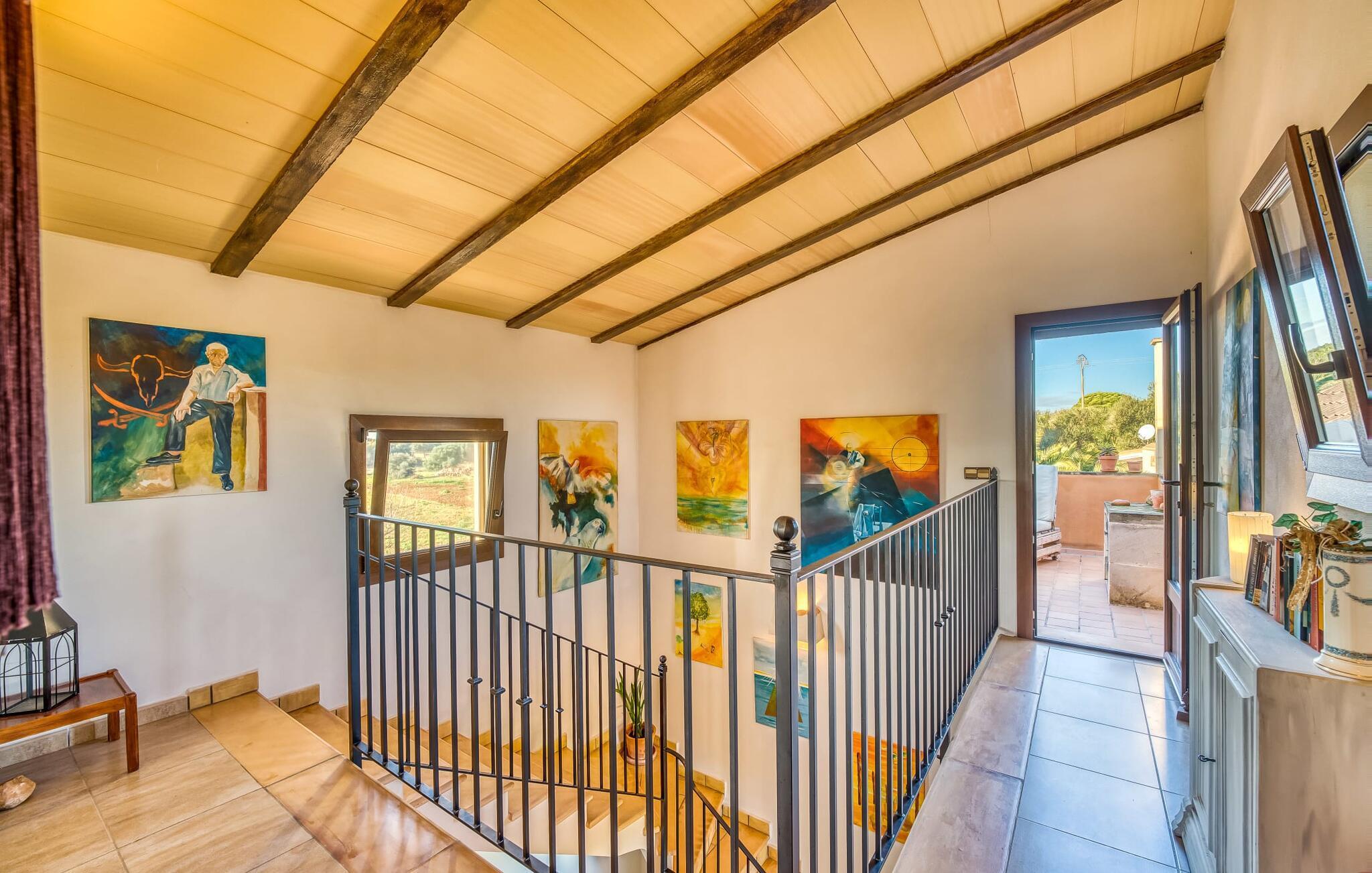 "Alqueria Fosca" er en fantastisk bondegård, smukt designet med kærlighed og sans for detaljer af sine venlige værter. Udendørsområdet er en fortryllende oase med palme-, appelsin- og mandeltræer, lyse bougainvillea og oleanderbuske. Dette er et feriehus i Fincallorca. Udover mange afslappende steder finder du et loungeområde, skyggefulde siddepladser omgivet af grønne områder og komfortable liggestole ved den klorfrie pool, perfekt til at køle af og nyde feriehyggen. Et højdepunkt er det overdækkede udekøkken med grill, gasblus, vask og køleskab, samt en spiseplads, der giver følelsen af din egen private bodega. Talrige altaner og en tagterrasse tilbyder en fantastisk udsigt over denne smukke del af det sydlige Mallorca. De fem dobbeltværelser, alle udstyret med aircondition, åbner hver ud til en balkon. De fleste værelser har deres eget køleskab, masser af opbevaringsplads og et privat brusebad, hvilket gør "Alqueria Fosca" ideel til 10 personer. Hjemmets puristiske indretning bruger naturlige farver og materialer til at skabe en rolig atmosfære, med minimal udsmykning for at forstærke følelsen af sammenhæng med naturen. De rummelige opholds-, spise- og køkkenområder afspejler denne stil, og pejsen, gulvvarmen og hjemmekontorets egnethed gør dette landsted til et perfekt tilflugtssted året rundt. Landstedet "Alqueria Fosca" er indlejret i en oase-lignende have med poolområde og et fantastisk udekøkken. Det skønne feriehus har en førsteklasses beliggenhed lige syd for Campos, hvor du kan gøre dine indkøb. Drømmestranden Es Trenc ligger kun 15 minutter væk i bil.