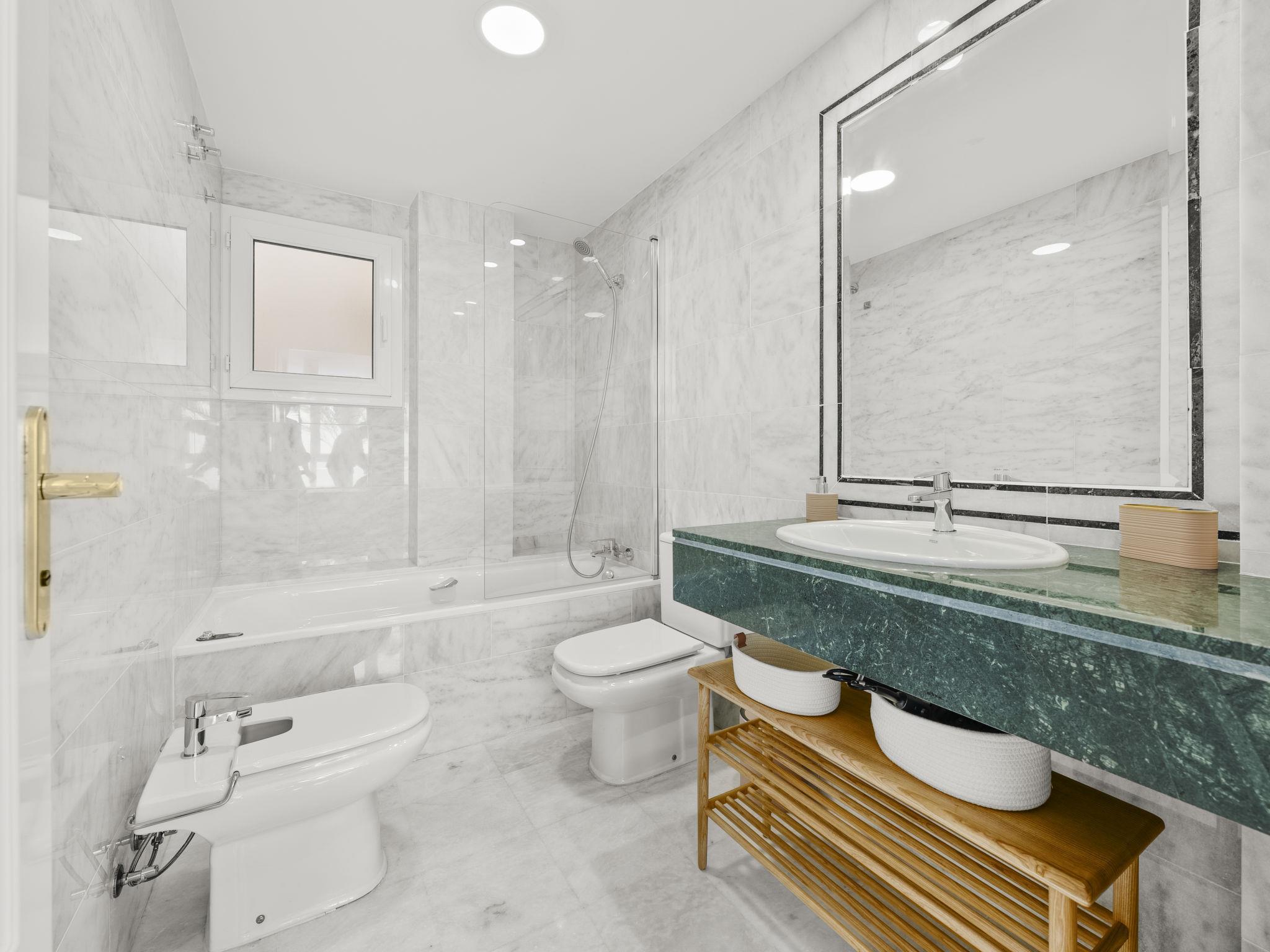 "Panorama", 3-room apartment 119 m2 on 2nd floor. Spacious and bright, beautiful furnishings: open living/dining room with digital TV, air conditioning and forced-air heating. Exit to the terrace. 1 room with 1 french bed (1 x 160 cm, length 200 cm), bath/bidet/WC, air conditioning, fan and forced-air heating. 1 room with 2 beds (90 cm, length 200 cm), air conditioning, fan and forced-air heating. Kitchen (oven, dishwasher, 3 induction hot plates, toaster, kettle, microwave, electric coffee machine). Shower/WC. Large terrace. Terrace furniture, sitting area. Panoramic view of the sea and the swimming pool. Facilities: washing machine, iron, children's high chair, baby cot for up to 2 year olds, hair dryer. Internet (WiFi, free). Parking space n 37 (roofed). Please note: non-smoking house. AT-503083-A // Reg. Nr.: ESFCTU00000305300027628600000000000000000AT-503083-A3