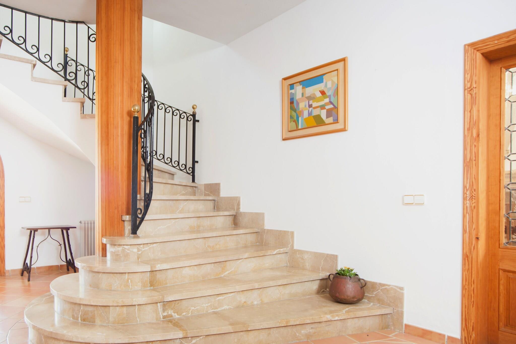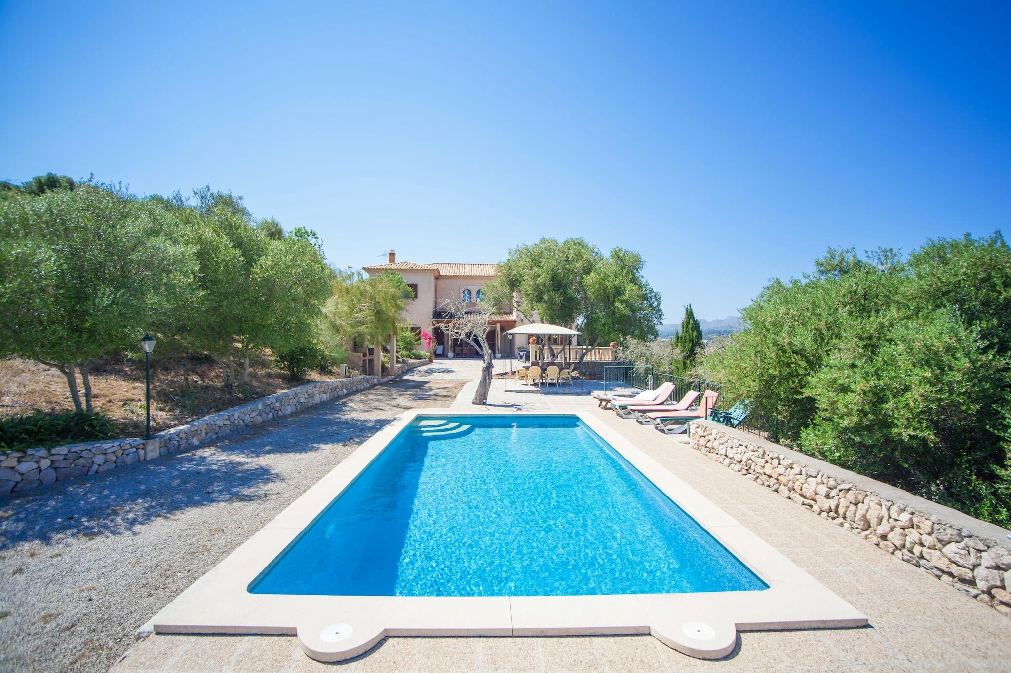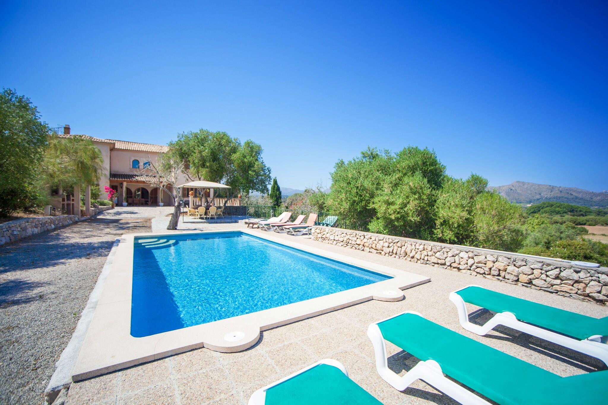 Rummelig udendørs opholdsstue Denne villa i Artà er designet til grupper og familier, der ønsker både privatliv og plads. Beliggende på en indhegnet 20.000 m² grund uden nære naboer, byder den på en flot udsigt over bjergene og fredelige omgivelser. Gæsterne kan nyde lang morgenmad på terrassen, frokost ved poolen i den skyggefulde veranda og afslappede aftener med en grill under stjernerne. Den private klorpool (9m x 4m) er ideel til afkøling, og med 10 liggestole til rådighed, kan alle slappe af i komfort. Traditionelt møder moderne Indvendigt kombinerer villaen mallorcansk karakter med moderne bekvemmeligheder. Opholdsstuen i åbent plan har hyggelige sofaer, satellit-tv og en spiseplads forbundet med et veludstyret køkken. Fem soveværelser ovenpå rummer familier og grupper med fleksible sovearrangementer, nogle med eget badeværelse og adgang til balkon. Centralvarme, aircondition i udvalgte værelser og gennemtænkte detaljer som barneseng og høj stol gør det praktisk til længere ophold. Strande og lokal spisning Kun en kort køretur væk finder du sandstrande som Cala Agulla og Costa dels Pins sammen med skjulte bugter som Cala Torta til en roligere dag ved havet. Golfspillere vil sætte pris på Pula Golf kun 10 minutter væk, mens dem, der søger natteliv, kan tage til Cala Ratjada. For autentisk spisning i nærheden serverer Restaurant Ca Nostra lokale favoritter, og Artàs bymidte er fyldt med caféer, tapasbarer og ugentlige markeder, der fremviser ø-smag.