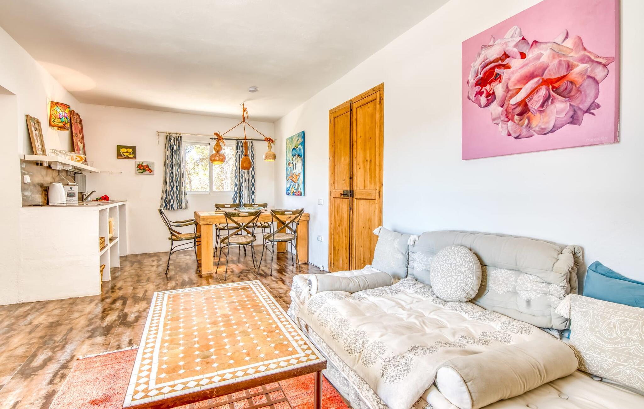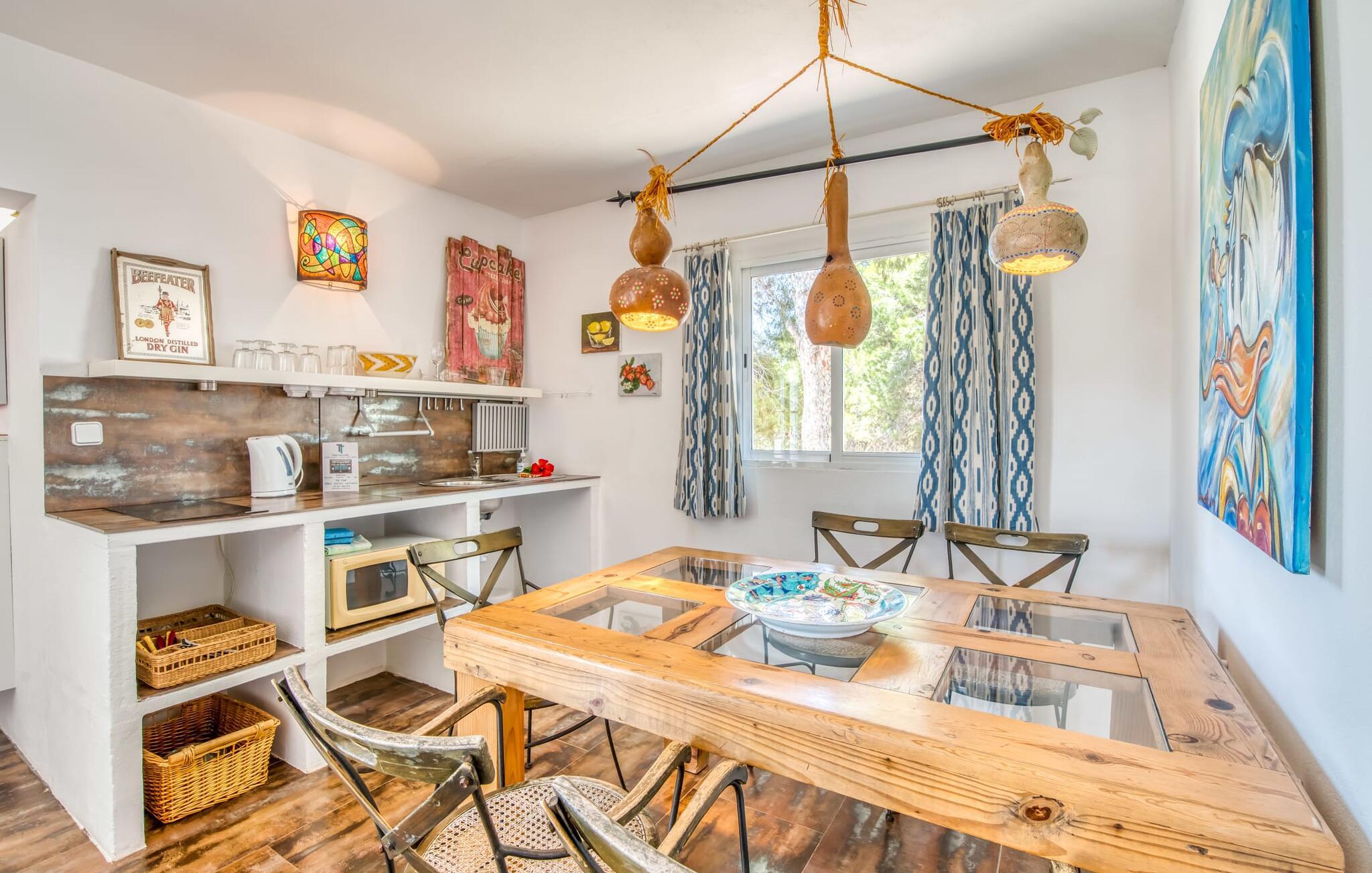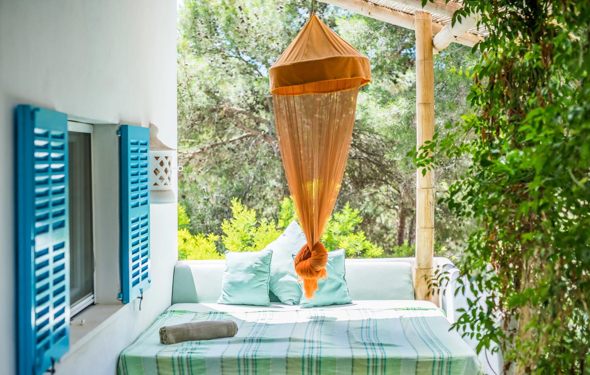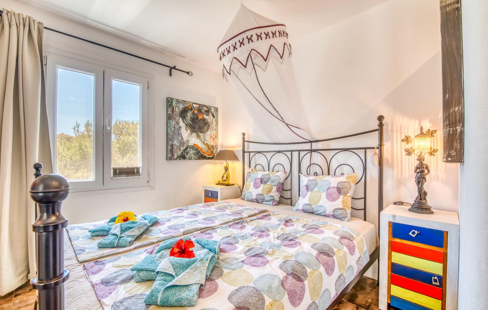 Billederne taler for sig selv: Feriehuset "Bamboo" er omgivet af frodig vegetation nær kysten på det sydlige Mallorca og emmer af ren livsglæde i hvert hjørne. Huset i Ibiza-stil byder på flere komfortabelt møblerede afslapningsområder, hvor I kan blive hængende og slappe af. Takket være taget forbliver den lille pool kølig selv i de varme sommermåneder. Et andet højdepunkt: et par skridt, og I sidder i en kærligt designet asiatisk verden med en dam og en overdækket træterrasse. Det er svært at tro, at det kun er et par minutters gang gennem fyrreskoven til Middelhavskysten. Cala Figuera byder på shopping og spisning med en smuk udsigt over havnen. Interiøret i dette feriehus til 6 gæster er krydret med originale detaljer og nøje udvalgte møbler fra hele verden. Boligarealet er fordelt på tre etager. I stueetagen er der stue med åbent køkken og udgang til terrassen ved poolen, soveværelse med dobbeltseng og badeværelse. En trappe i indgangspartiet fører til anden sal. Her finder I endnu en hyggelig stue med åbent køkken og spiseplads, soveværelse med dobbeltseng og badeværelse samt terrasse med overdækket chill-out område. Fra denne terrasse fører en udvendig trappe op til en rummelig tagterrasse med sommerkøkken, en hyggelig chill-out lounge og liggestole. Det tredje soveværelse ligger lige ved siden af tagterrassen og har eget badeværelse. Fincaen grænser op til naturparken Mondragó og ligger kun få minutters gang fra havnen i Cala Figuera med restauranter og små butikker. Sandstranden S'Amarador kan nås på 10 minutter i bil. Santanyí ligger kun 6 km væk og byder på gode indkøbsmuligheder, supermarkeder og et ugentligt marked.