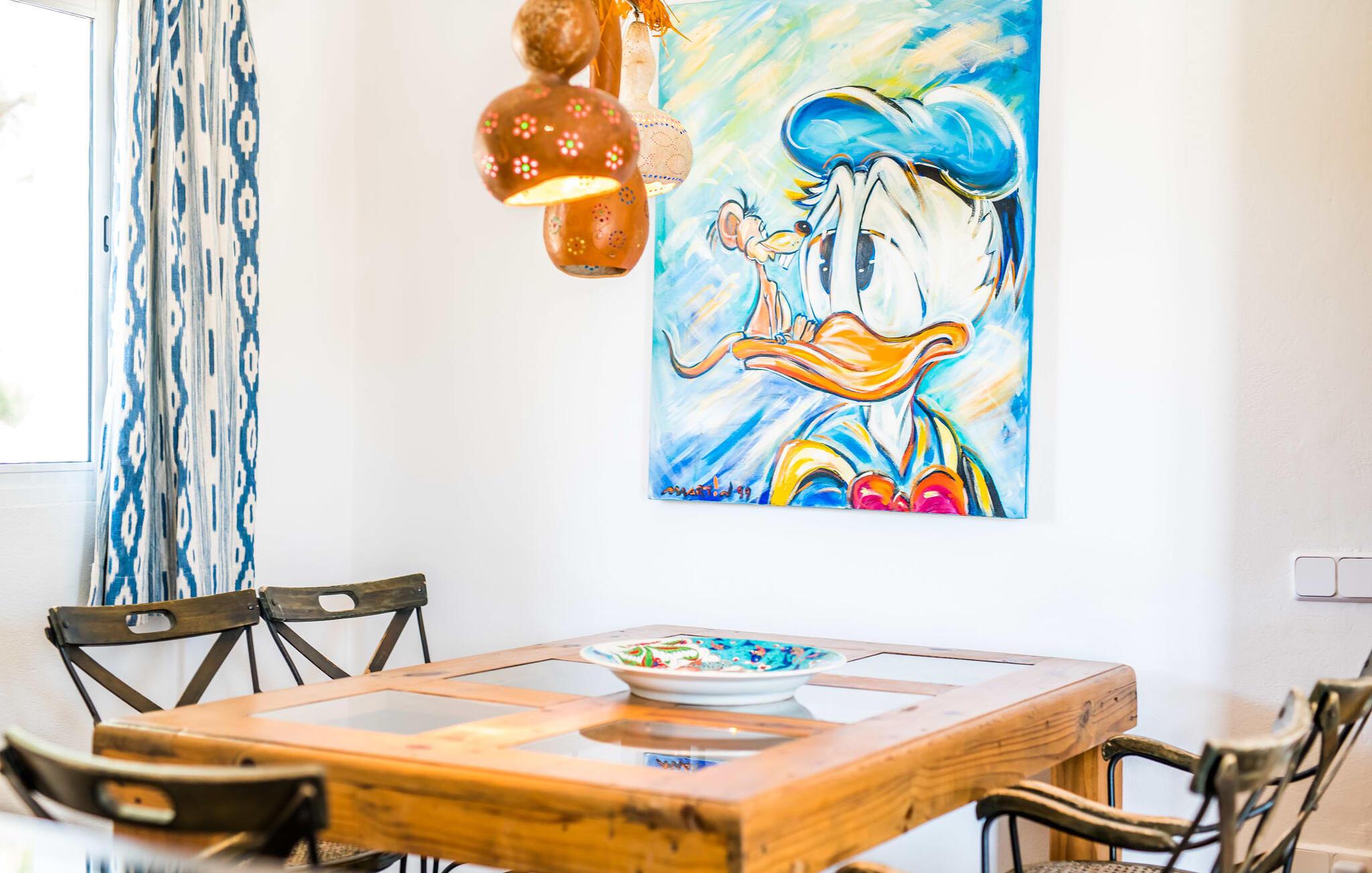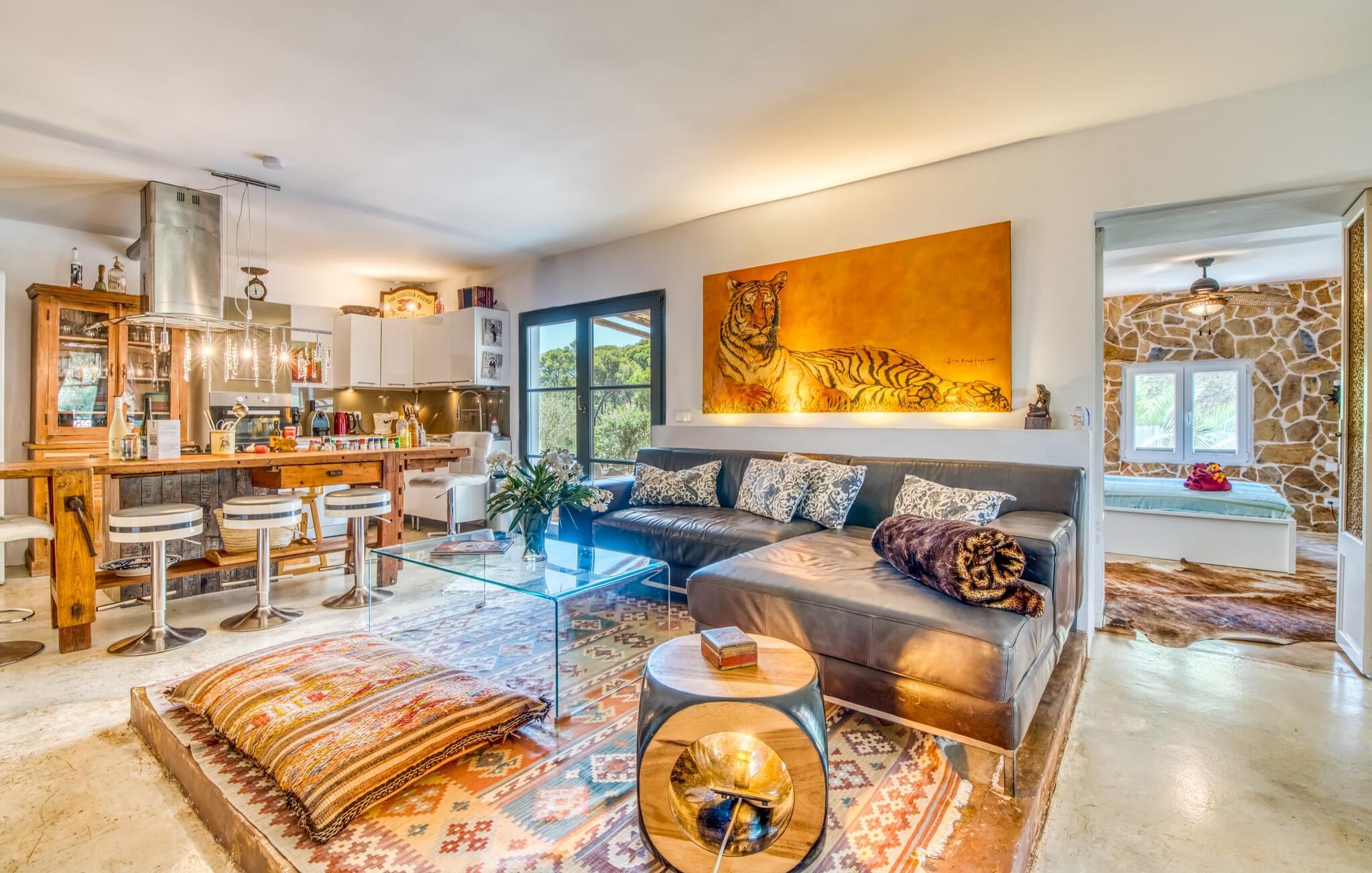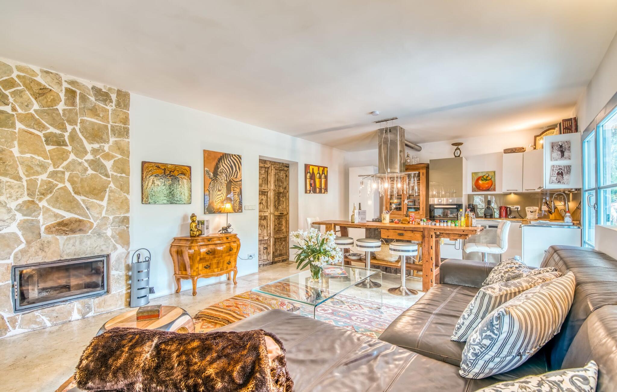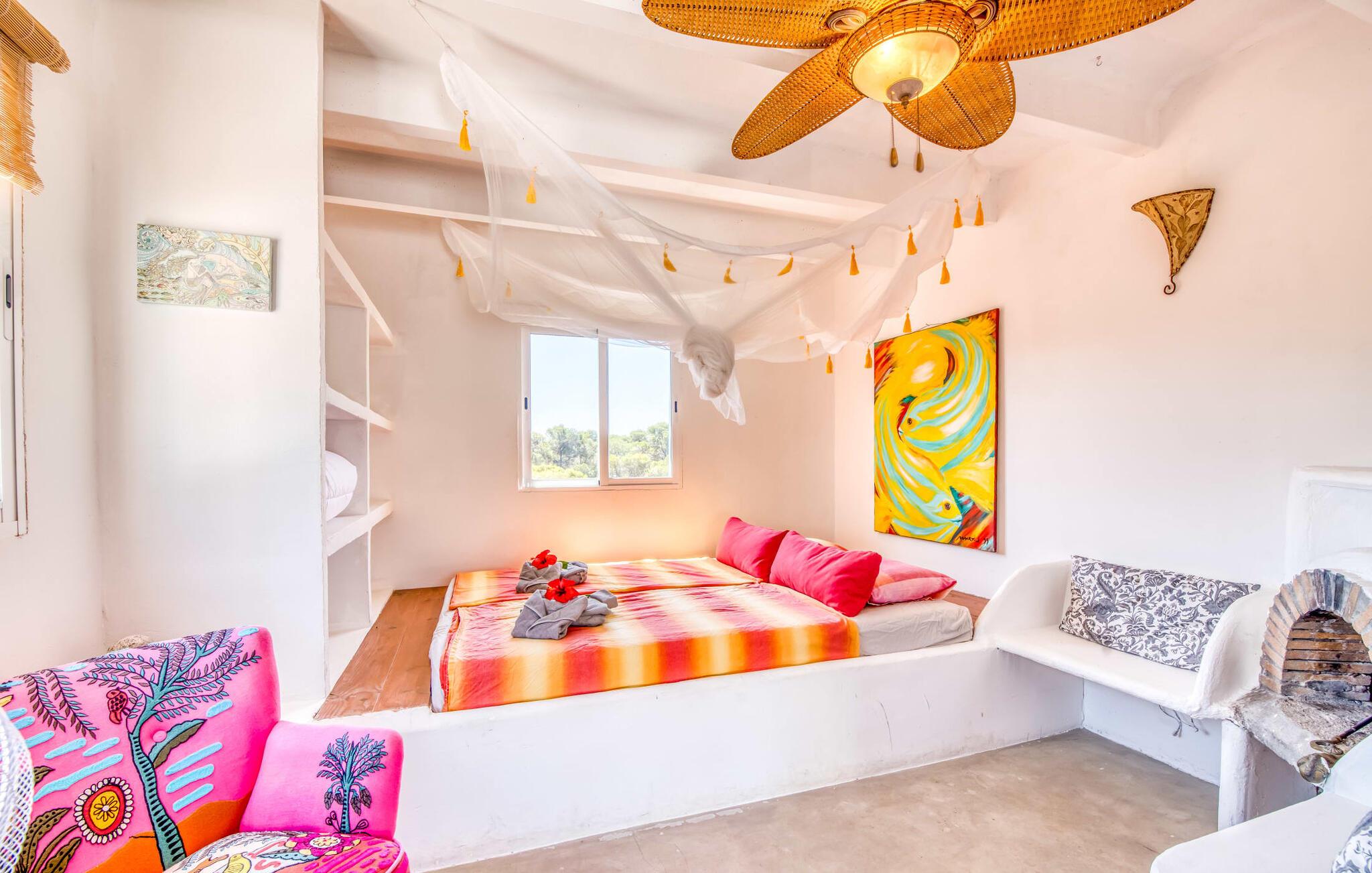 Billederne taler for sig selv: Feriehuset "Bamboo" er omgivet af frodig vegetation nær kysten på det sydlige Mallorca og emmer af ren livsglæde i hvert hjørne. Huset i Ibiza-stil byder på flere komfortabelt møblerede afslapningsområder, hvor I kan blive hængende og slappe af. Takket være taget forbliver den lille pool kølig selv i de varme sommermåneder. Et andet højdepunkt: et par skridt, og I sidder i en kærligt designet asiatisk verden med en dam og en overdækket træterrasse. Det er svært at tro, at det kun er et par minutters gang gennem fyrreskoven til Middelhavskysten. Cala Figuera byder på shopping og spisning med en smuk udsigt over havnen. Interiøret i dette feriehus til 6 gæster er krydret med originale detaljer og nøje udvalgte møbler fra hele verden. Boligarealet er fordelt på tre etager. I stueetagen er der stue med åbent køkken og udgang til terrassen ved poolen, soveværelse med dobbeltseng og badeværelse. En trappe i indgangspartiet fører til anden sal. Her finder I endnu en hyggelig stue med åbent køkken og spiseplads, soveværelse med dobbeltseng og badeværelse samt terrasse med overdækket chill-out område. Fra denne terrasse fører en udvendig trappe op til en rummelig tagterrasse med sommerkøkken, en hyggelig chill-out lounge og liggestole. Det tredje soveværelse ligger lige ved siden af tagterrassen og har eget badeværelse. Fincaen grænser op til naturparken Mondragó og ligger kun få minutters gang fra havnen i Cala Figuera med restauranter og små butikker. Sandstranden S'Amarador kan nås på 10 minutter i bil. Santanyí ligger kun 6 km væk og byder på gode indkøbsmuligheder, supermarkeder og et ugentligt marked.