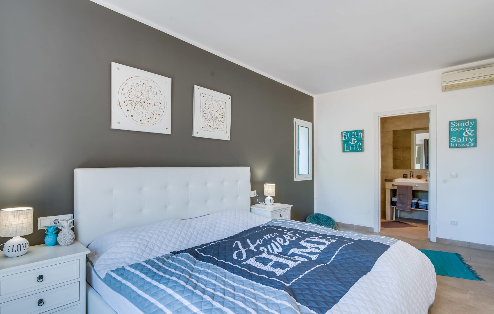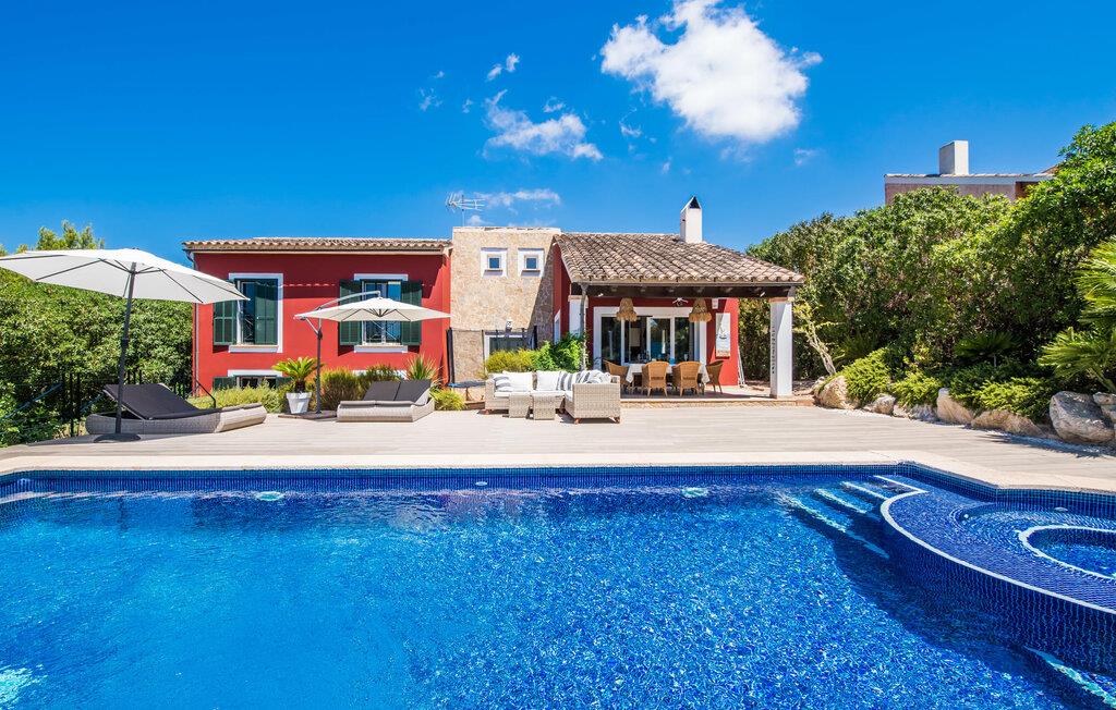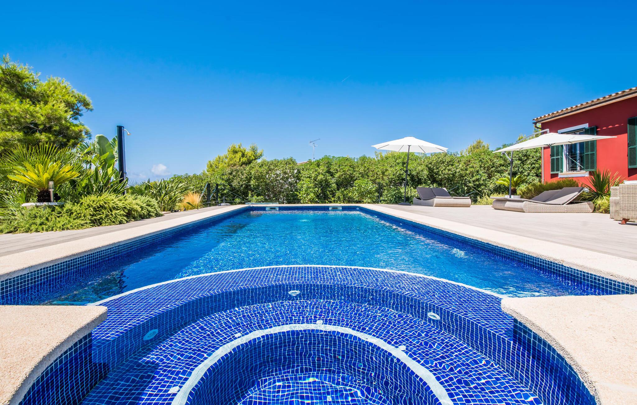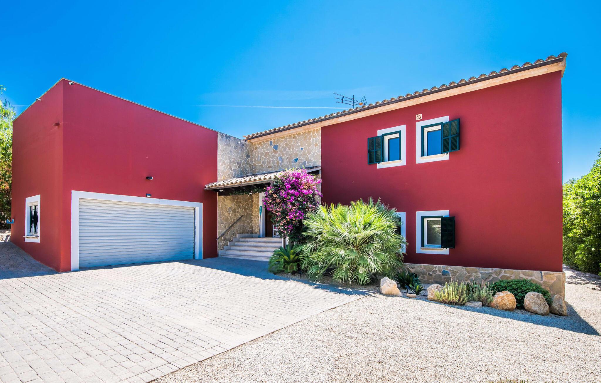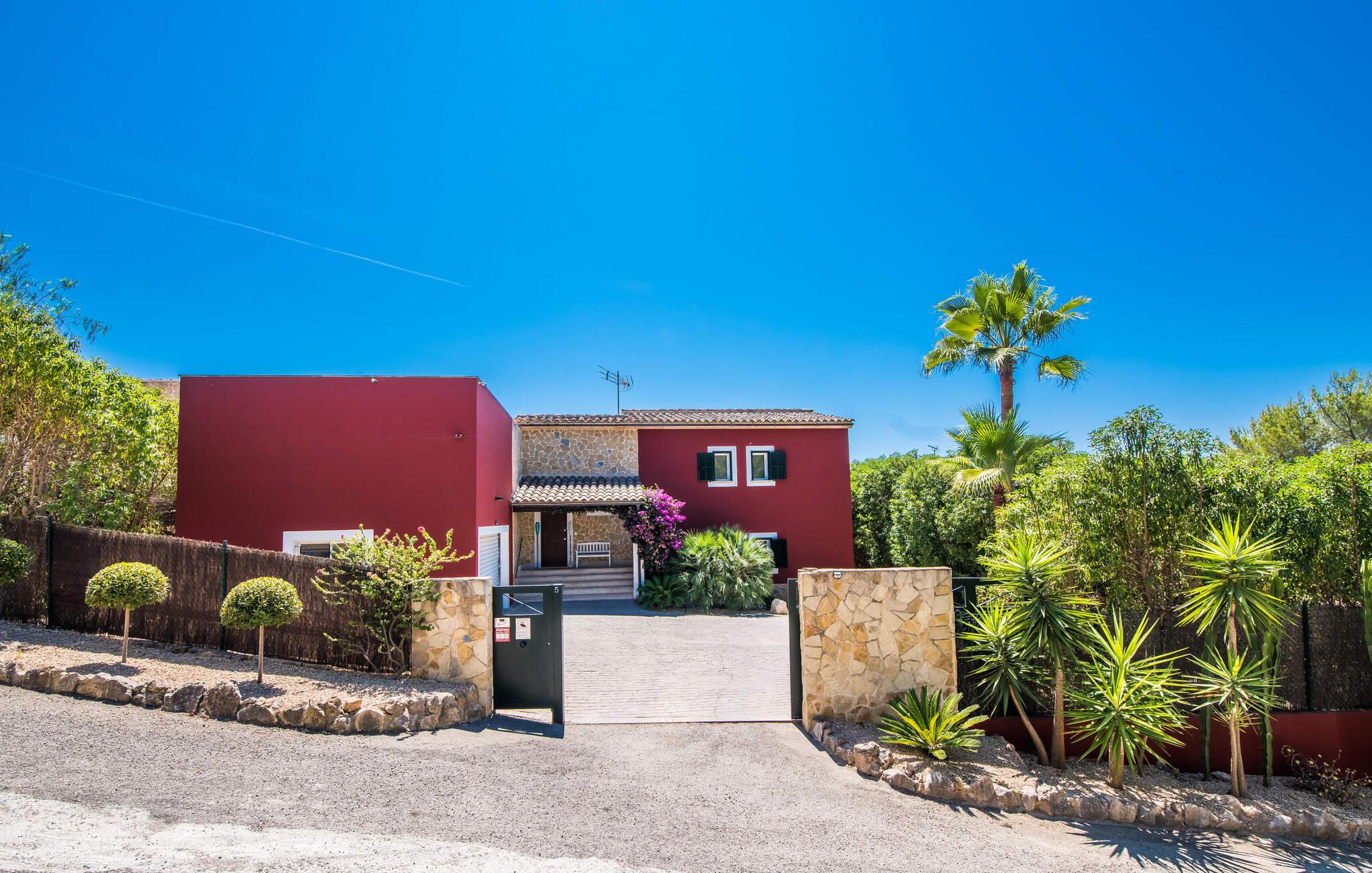 Et lille paradis venter gæsten, når de træder ind på det 1.600 m² store område, hvorpå den knaldrøde villa "Bella Mallorca" ligger. Enhver, der leder efter det smukkeste sted at slappe af, vil hurtigt blive forkælet med valgmuligheder, da de forskellige steder konkurrerer med hinanden i forhold til æstetik, komfort og praktisk. Det er bedst at prøve de forskellige muligheder efter hinanden! Lige ved siden af huset, under tag og med en vidunderlig udsigt over poolområdet, står det smukke spisebord: det perfekte mødested for al fresco spisning. I kan sidde udendørs lige ved siden af i den smarte polyrattan-lounge, som harmonerer fantastisk med de matchende dobbelte daybeds. Et andet perspektiv byder den balinesiske seng på, der ligesom den anden udendørs sofa er lidt af vejen, men stadig ligger på den rummelige træflade, der putter sig omkring poolen. Der er også et andet spisebord i dette bagerste område, så I kan nyde jeres privatliv uforstyrret, selv når det er fyldt. Udekøkkenet med køleskab, vinkøleskab, vask, pizzaovn og integreret gasgrill inviterer til faktisk at flytte ferielivet helt udenfor i løbet af dagen. Den store pool sørger for den nødvendige nedkøling ind imellem. Miljøbevidst bæredygtighed er også meget vigtigt. Denne finca er udstyret med et solcelleanlæg og genererer elektricitet via solenergi. Haven vandes desuden på en økologisk fornuftig måde via et regnvandsbeholderanlæg. Så meget er blevet klart indtil nu: Tid i det fri kan bruges her som ægte kvalitetstid. Interiøret i denne villa på Mallorca inviterer derimod uden tvivl til at tilbringe lange timer indendørs. Her er indretning, design og udsmykning omfattende, men aldrig påtrængende. En masse hvidt danner rammen om alverdens farverige tilbehør og detaljer, som på imponerende vis fremhæves af deres placering i rummet og skaber en yderst smagfuld stemning. Og så kan det være, at I sidder i sofaen og tror, I er midt i et Schöner Wohnen-katalog... - her kan I sagtens føle jer hjemme! Den fremragende indretning er også med til at sikre, at I kommer helt hertil og føler jer hjemme i den stillede komfort. Det åbne design af opholds-, spise- og køkkenområderne understreger dette feriehuss fælles karakter. Rummet, der åbner videre ud til entréen og opgangen, understreger også - også med de imponerende søjler - husets rummelighed, der med 280 m² boligareal faktisk byder på en masse friarealer. Stilfulde afslapningsrum er fordelt på forskellige niveauer: Et par trin lavere er to soveværelser med dobbeltsenge og to badeværelser, hvoraf det ene har eget bad. På øverste etage er der yderligere to soveværelser og badeværelser, hvoraf det ene er en suite. Vi hos Fincallorca giver dette hus, som imponerer i enhver henseende, en særlig anbefaling! Tilbuddet om den familie- og børnevenlige villa "Bella Mallorca" henvender sig primært til familier og par, der ønsker at slappe af sammen og tilbringe en dejlig tid i en smuk finca. Grundet den smukke, eksklusive indretning og den rolige beliggenhed i et hyggeligt kvarter er huset ikke velegnet til festgrupper. Fester, firmafester, bryllupper og lignende arrangementer samt kommercielle arrangementer er ikke tilladt. Med sin varme røde farve og grønne skodder er Villa “Bella Mallorca” en farverig invitation til en afslappet og behagelig ferie på Mallorca. I bor her i yderkanten af Costa de la Calma urbaniseringen på den vestlige del af øen. Strande, fritidsfaciliteter og forskellige byer er kun få minutter væk. Et supermarked og stranden Costa de Calma ligger kun omkring 1,6 km væk. Bemærk venligst, at denne ejendom ikke accepterer ungdomsgrupper eller polterabender. En ungdomsgruppe på denne ejendom består af personer under 30 år. Book ikke denne ejendom, hvis I er en ungdomsgruppe eller en polterabendgruppe, da jeres reservation vil blive afvist, når den er booket, hvilket også kan være tilfældet ved ankomst til ejendommen eller under jeres ophold, og I vil ikke modtage en refusion.