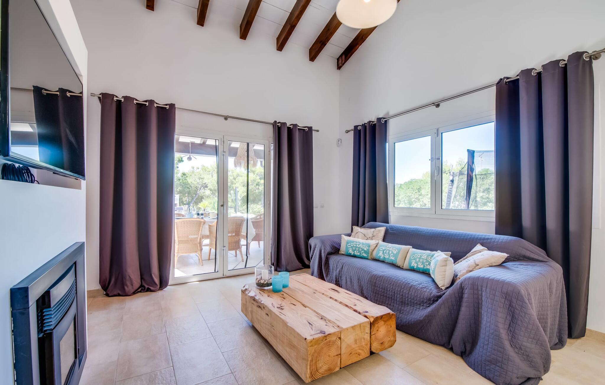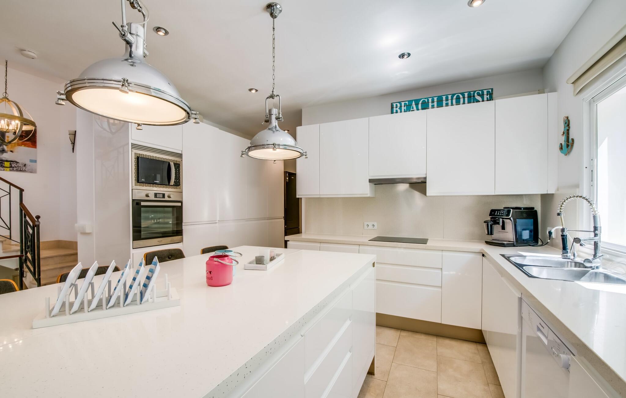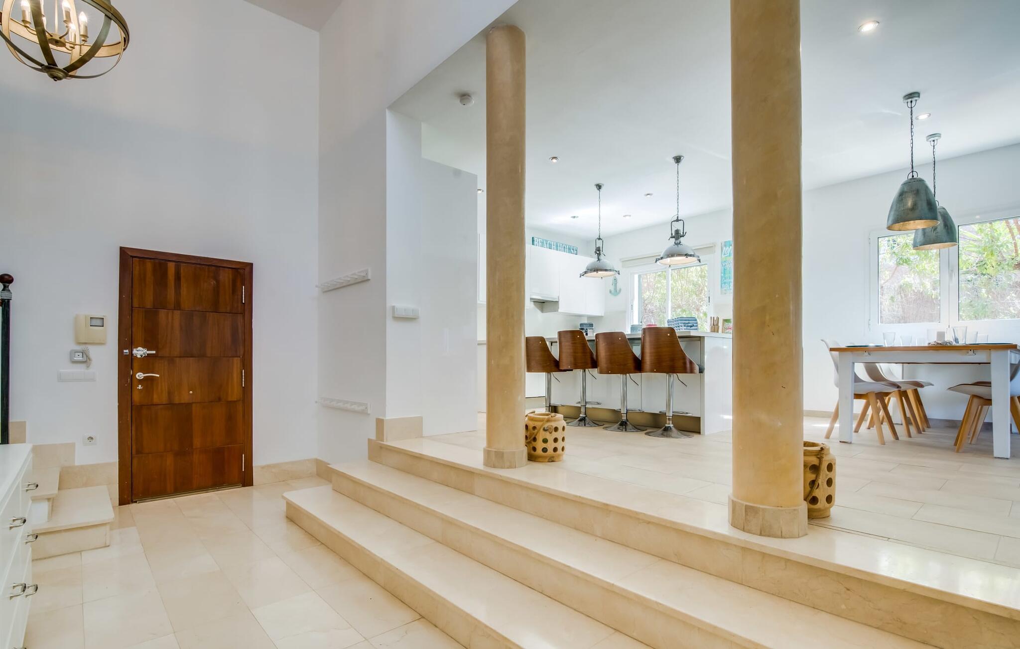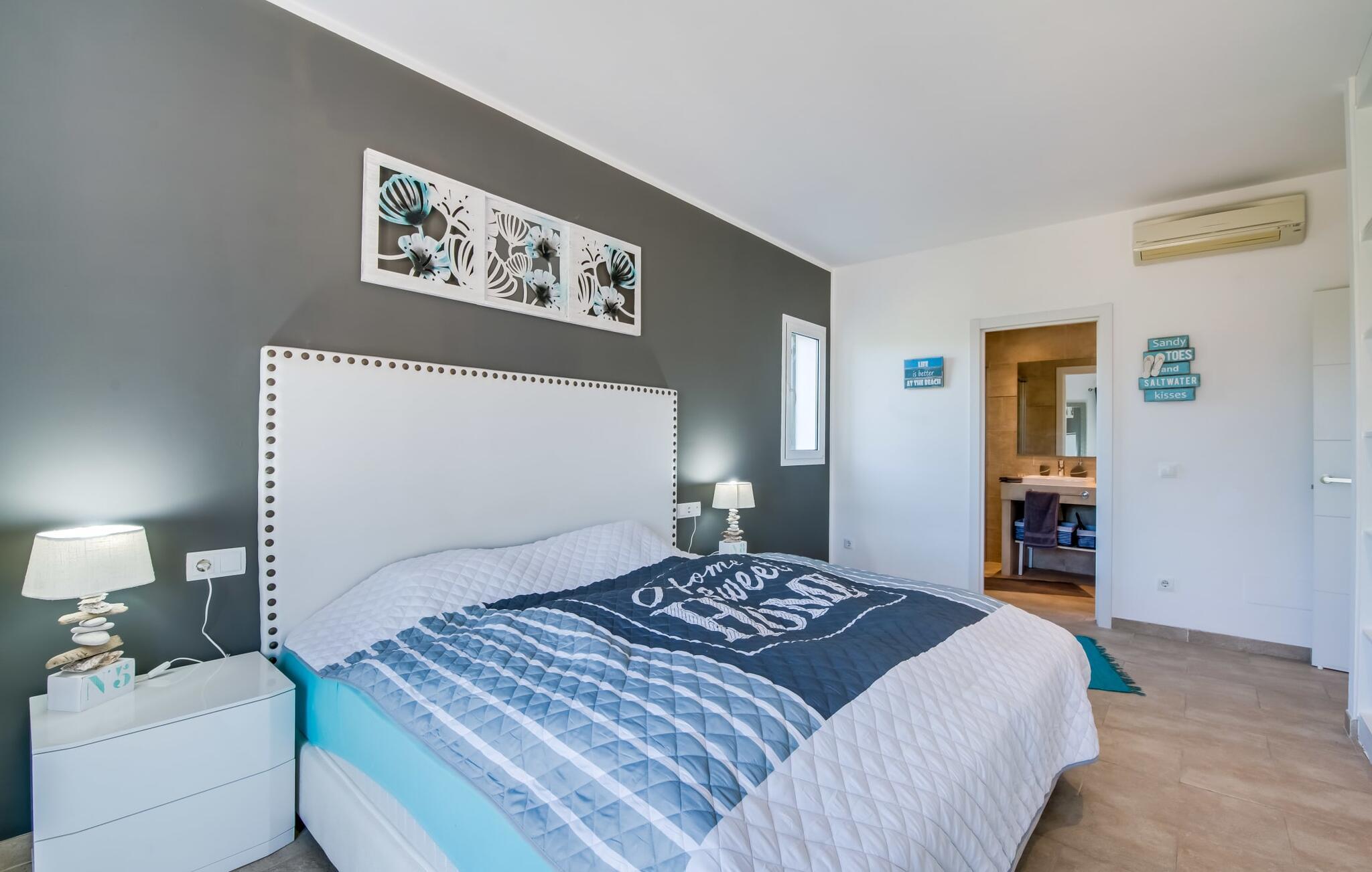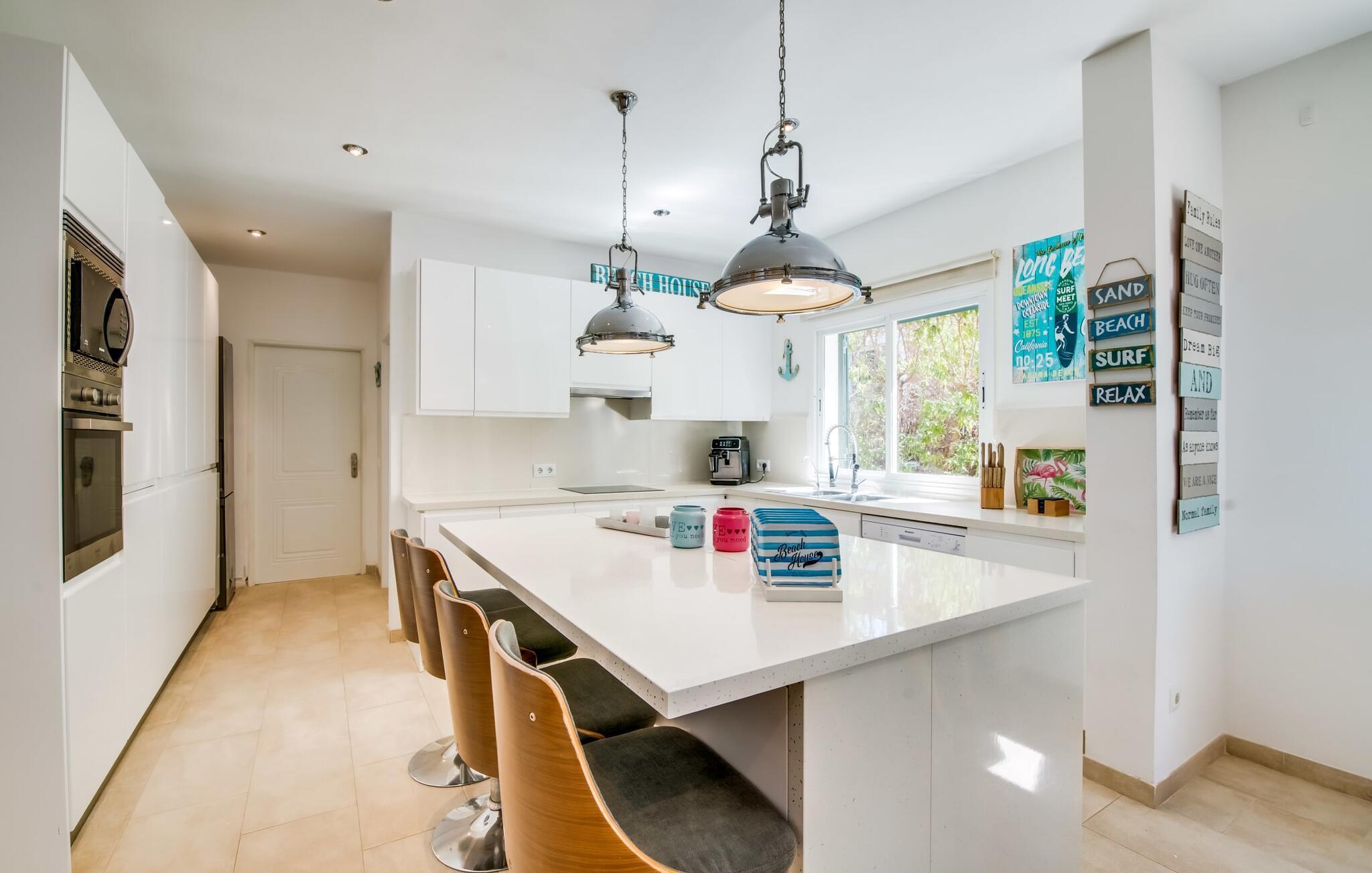 Et lille paradis venter gæsten, når de træder ind på det 1.600 m² store område, hvorpå den knaldrøde villa "Bella Mallorca" ligger. Enhver, der leder efter det smukkeste sted at slappe af, vil hurtigt blive forkælet med valgmuligheder, da de forskellige steder konkurrerer med hinanden i forhold til æstetik, komfort og praktisk. Det er bedst at prøve de forskellige muligheder efter hinanden! Lige ved siden af huset, under tag og med en vidunderlig udsigt over poolområdet, står det smukke spisebord: det perfekte mødested for al fresco spisning. I kan sidde udendørs lige ved siden af i den smarte polyrattan-lounge, som harmonerer fantastisk med de matchende dobbelte daybeds. Et andet perspektiv byder den balinesiske seng på, der ligesom den anden udendørs sofa er lidt af vejen, men stadig ligger på den rummelige træflade, der putter sig omkring poolen. Der er også et andet spisebord i dette bagerste område, så I kan nyde jeres privatliv uforstyrret, selv når det er fyldt. Udekøkkenet med køleskab, vinkøleskab, vask, pizzaovn og integreret gasgrill inviterer til faktisk at flytte ferielivet helt udenfor i løbet af dagen. Den store pool sørger for den nødvendige nedkøling ind imellem. Miljøbevidst bæredygtighed er også meget vigtigt. Denne finca er udstyret med et solcelleanlæg og genererer elektricitet via solenergi. Haven vandes desuden på en økologisk fornuftig måde via et regnvandsbeholderanlæg. Så meget er blevet klart indtil nu: Tid i det fri kan bruges her som ægte kvalitetstid. Interiøret i denne villa på Mallorca inviterer derimod uden tvivl til at tilbringe lange timer indendørs. Her er indretning, design og udsmykning omfattende, men aldrig påtrængende. En masse hvidt danner rammen om alverdens farverige tilbehør og detaljer, som på imponerende vis fremhæves af deres placering i rummet og skaber en yderst smagfuld stemning. Og så kan det være, at I sidder i sofaen og tror, I er midt i et Schöner Wohnen-katalog... - her kan I sagtens føle jer hjemme! Den fremragende indretning er også med til at sikre, at I kommer helt hertil og føler jer hjemme i den stillede komfort. Det åbne design af opholds-, spise- og køkkenområderne understreger dette feriehuss fælles karakter. Rummet, der åbner videre ud til entréen og opgangen, understreger også - også med de imponerende søjler - husets rummelighed, der med 280 m² boligareal faktisk byder på en masse friarealer. Stilfulde afslapningsrum er fordelt på forskellige niveauer: Et par trin lavere er to soveværelser med dobbeltsenge og to badeværelser, hvoraf det ene har eget bad. På øverste etage er der yderligere to soveværelser og badeværelser, hvoraf det ene er en suite. Vi hos Fincallorca giver dette hus, som imponerer i enhver henseende, en særlig anbefaling! Tilbuddet om den familie- og børnevenlige villa "Bella Mallorca" henvender sig primært til familier og par, der ønsker at slappe af sammen og tilbringe en dejlig tid i en smuk finca. Grundet den smukke, eksklusive indretning og den rolige beliggenhed i et hyggeligt kvarter er huset ikke velegnet til festgrupper. Fester, firmafester, bryllupper og lignende arrangementer samt kommercielle arrangementer er ikke tilladt. Med sin varme røde farve og grønne skodder er Villa “Bella Mallorca” en farverig invitation til en afslappet og behagelig ferie på Mallorca. I bor her i yderkanten af Costa de la Calma urbaniseringen på den vestlige del af øen. Strande, fritidsfaciliteter og forskellige byer er kun få minutter væk. Et supermarked og stranden Costa de Calma ligger kun omkring 1,6 km væk. Bemærk venligst, at denne ejendom ikke accepterer ungdomsgrupper eller polterabender. En ungdomsgruppe på denne ejendom består af personer under 30 år. Book ikke denne ejendom, hvis I er en ungdomsgruppe eller en polterabendgruppe, da jeres reservation vil blive afvist, når den er booket, hvilket også kan være tilfældet ved ankomst til ejendommen eller under jeres ophold, og I vil ikke modtage en refusion.