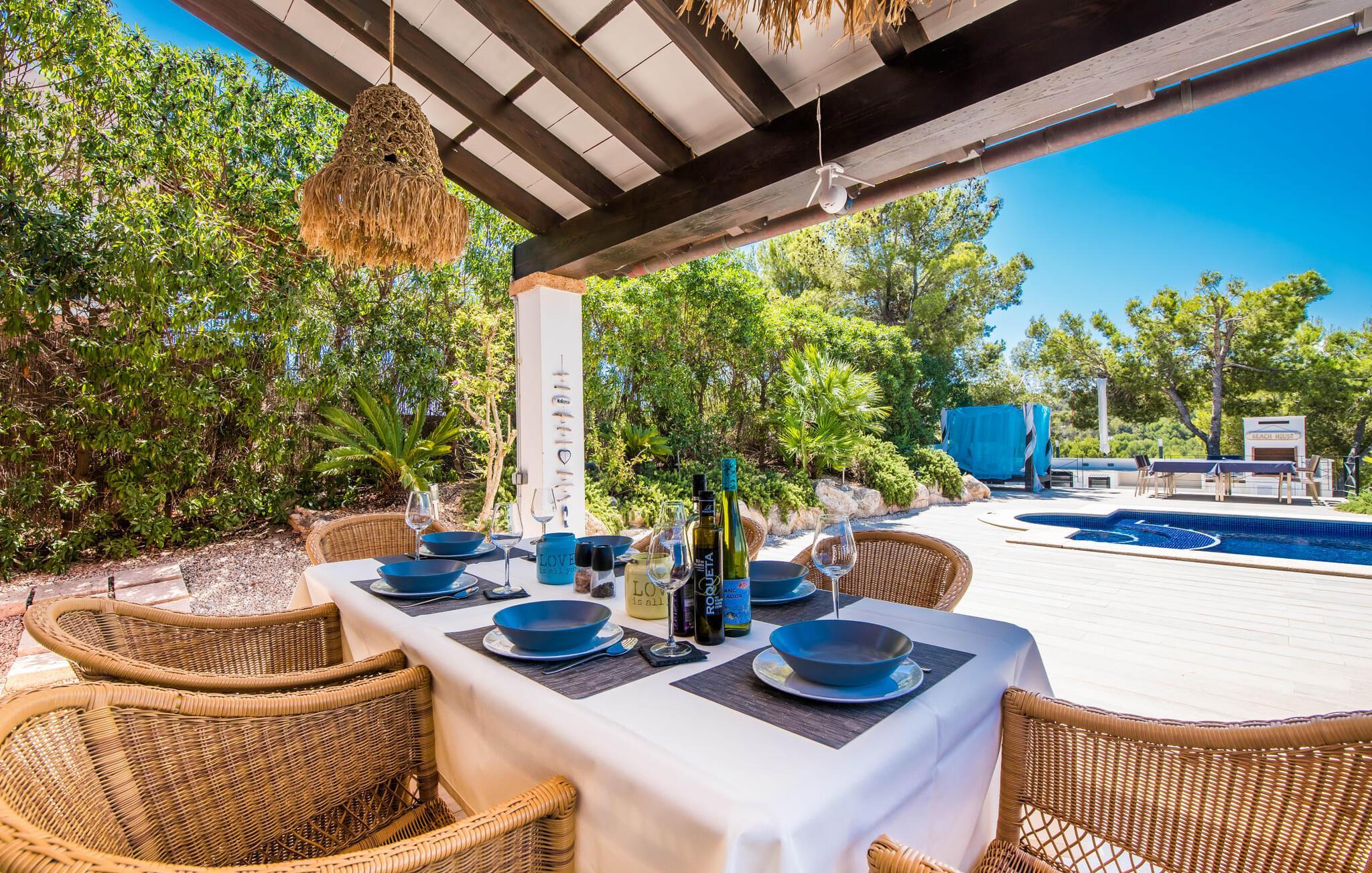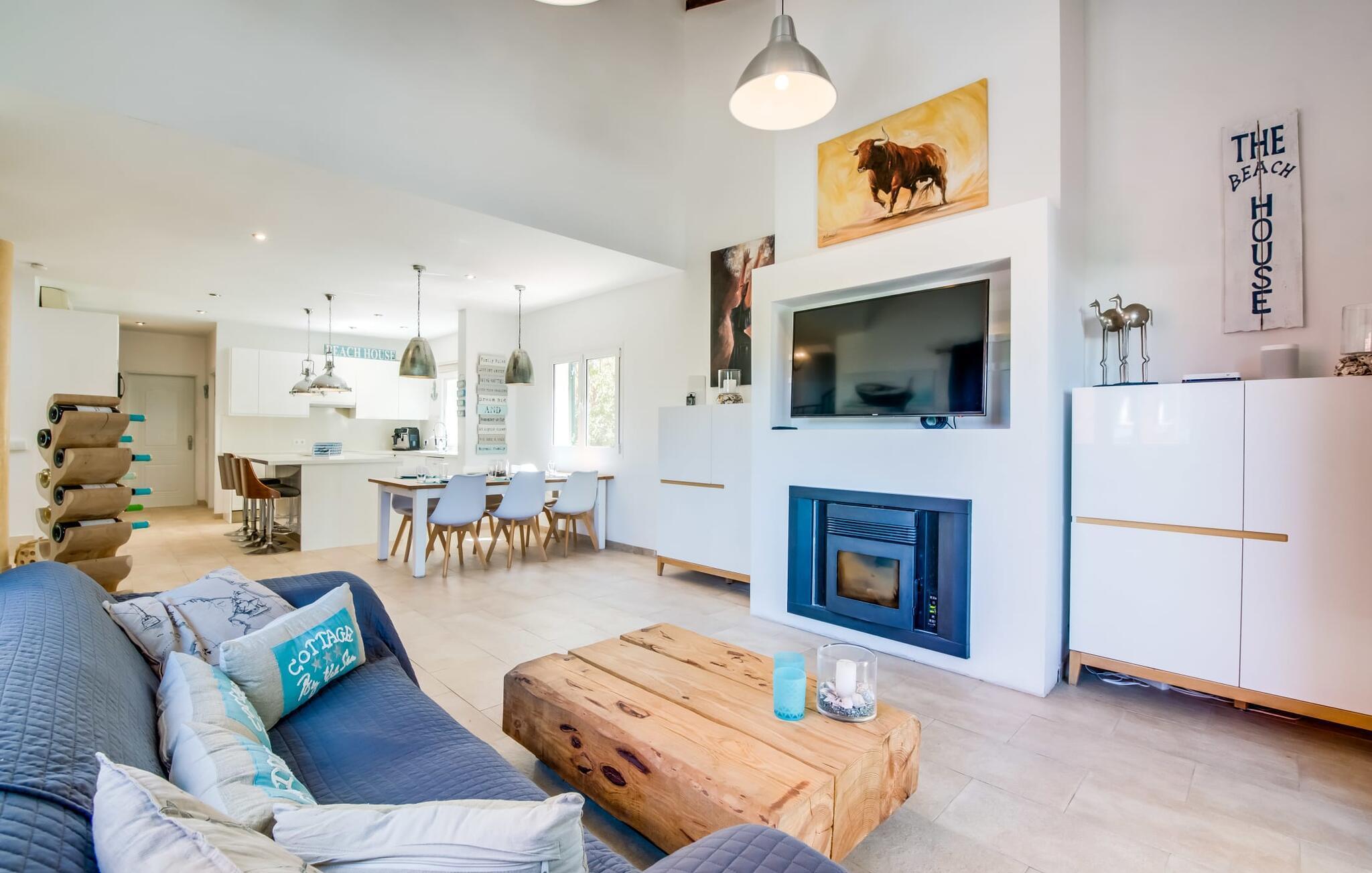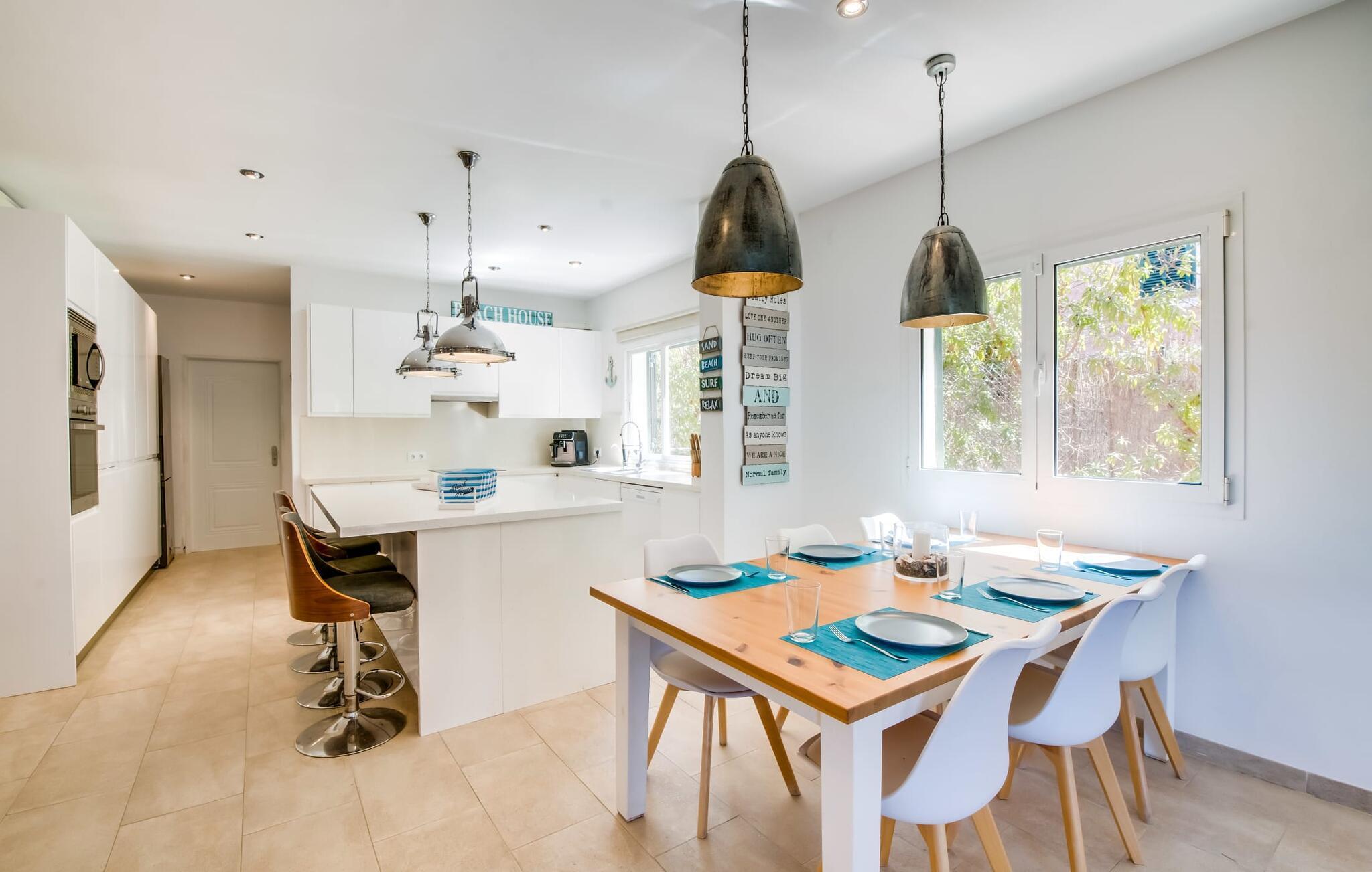 Et lille paradis venter gæsten, når de træder ind på det 1.600 m² store område, hvorpå den knaldrøde villa "Bella Mallorca" ligger. Enhver, der leder efter det smukkeste sted at slappe af, vil hurtigt blive forkælet med valgmuligheder, da de forskellige steder konkurrerer med hinanden i forhold til æstetik, komfort og praktisk. Det er bedst at prøve de forskellige muligheder efter hinanden! Lige ved siden af huset, under tag og med en vidunderlig udsigt over poolområdet, står det smukke spisebord: det perfekte mødested for al fresco spisning. Du kan sidde udendørs lige ved siden af i den smarte polyrattan-lounge, som harmonerer fantastisk med de matchende dobbelte daybeds. Et andet perspektiv byder den balinesiske seng på, der ligesom den anden udendørs sofa er lidt af vejen, men stadig ligger på den rummelige træflade, der putter sig omkring poolen. Der er også et andet spisebord i dette bagerste område, så du kan nyde dit privatliv uforstyrret, selv når det er fyldt. Udekøkkenet med køleskab, vinkøleskab, vask, pizzaovn og integreret gasgrill inviterer til faktisk at flytte ferielivet helt udenfor i løbet af dagen. Den store pool sørger for den nødvendige nedkøling ind imellem. Miljøbevidst bæredygtighed er også meget vigtigt. Denne finca er udstyret med et solcelleanlæg og genererer elektricitet via solenergi. Haven vandes desuden på en økologisk fornuftig måde via et regnvandsbeholderanlæg. Så meget er blevet klart indtil nu: Tid i det fri kan bruges her som ægte kvalitetstid. Interiøret i denne villa på Mallorca inviterer derimod uden tvivl til at tilbringe lange timer indendørs. Her er indretning, design og udsmykning omfattende, men aldrig påtrængende. En masse hvidt danner rammen om alverdens farverige tilbehør og detaljer, som på imponerende vis fremhæves af deres placering i rummet og skaber en yderst smagfuld stemning. Og så kan det være, at du sidder i sofaen og tror, du er midt i et Schöner Wohnen-katalog... - her kan du sagtens føle dig hjemme! Den fremragende indretning er også med til at sikre, at du kommer helt hertil og føler dig hjemme i den stillede komfort. Det åbne design af opholds-, spise- og køkkenområderne understreger dette feriehuss fælles karakter. Rummet, der åbner videre ud til entréen og opgangen, understreger også - også med de imponerende søjler - husets rummelighed, der med 280 m² boligareal faktisk byder på en masse friarealer. Stilfulde afslapningsrum er fordelt på forskellige niveauer: Et par trin lavere er to soveværelser med dobbeltsenge og to badeværelser, hvoraf det ene har eget bad. På øverste etage er der yderligere to soveværelser og badeværelser, hvoraf det ene er en suite. Vi hos Fincallorca giver dette hus, som imponerer i enhver henseende, en særlig anbefaling! Tilbuddet om den familie- og børnevenlige villa "Bella Mallorca" henvender sig primært til familier og par, der ønsker at slappe af sammen og tilbringe en dejlig tid i en smuk finca. Grundet den smukke, eksklusive indretning og den rolige beliggenhed i et hyggeligt kvarter er huset ikke velegnet til festgrupper. Fester, firmafester, bryllupper og lignende arrangementer samt kommercielle arrangementer er ikke tilladt. Med sin varme røde farve og grønne skodder er Villa “Bella Mallorca” en farverig invitation til en afslappet og behagelig ferie på Mallorca. Du bor her i yderkanten af Costa de la Calma urbaniseringen på den vestlige del af øen. Strande, fritidsfaciliteter og forskellige byer er kun få minutter væk. Et supermarked og stranden Costa de Calma ligger kun omkring 1,6 km væk. Bemærk venligst, at denne ejendom ikke accepterer ungdomsgrupper eller polterabender. En ungdomsgruppe på denne ejendom består af personer under 30 år. Book ikke denne ejendom, hvis du er en ungdomsgruppe eller en polterabendgruppe, da din reservation vil blive afvist, når den er booket, hvilket også kan være tilfældet ved ankomst til ejendommen eller under dit ophold, og du vil ikke modtage en refusion. Dette er et Fincallorca feriehus.
