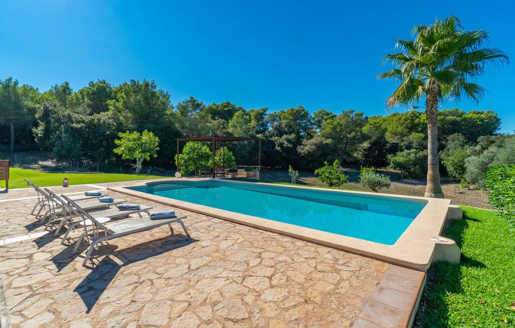 En landlig, rolig villa, hyggelig og komfortabel, ikke for stor og bygget i ét plan: denne perle hedder "Bellpuig d'Artà" og er beliggende på en kæmpe ejendom nær Artà på den østlige del af øen. Uanset hvor I er på ejendommen: jeres blik vil altid vandre over naturen med dens vidunderligt afslappende effekt. Bag huset, bygget på en lille bakke, kan I køle af i den skrånende pool, svømme runder eller udnytte de forskellige muligheder for at slappe af. Udover poolen med de indbydende liggestole finder I et opholdsområde under pergolaen, hvor I for eksempel kan nippe til en cocktail i skyggen, læse en god bog eller blot slappe af. Det samme gælder forteltet på siden af huset. For at spise sammen i den friske luft kan I sidde ved et af spisebordene på den overdækkede terrasse. Haven direkte omkring huset er anlagt i en let skrånende terrassestil, med græsplæner til leg med børnene og nogle imponerende palmer - og måske kigger også de to katte forbi, der bor på grunden.