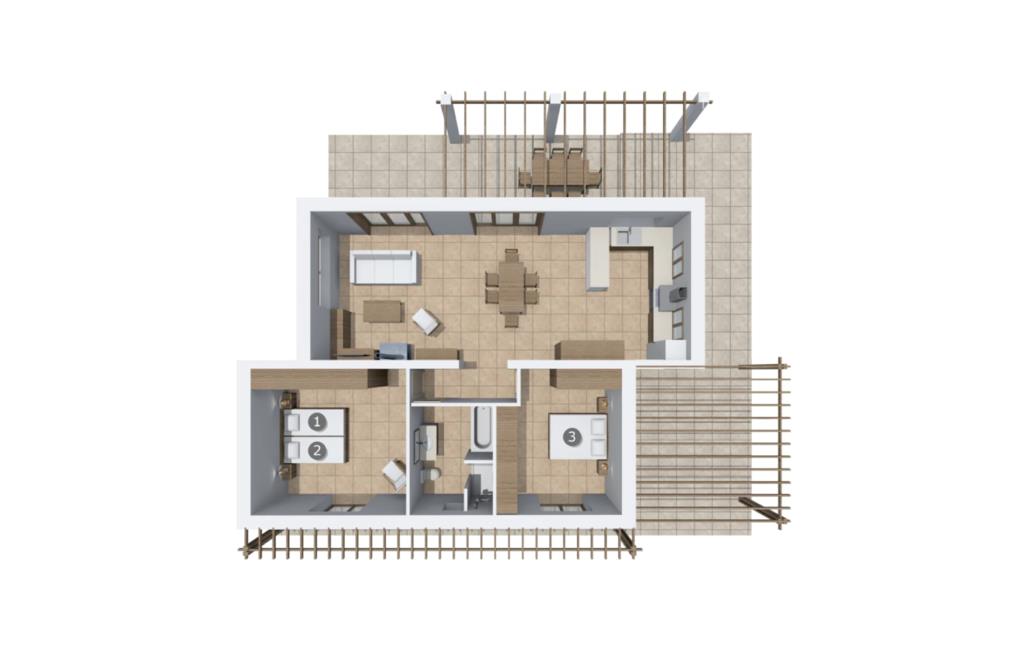 Interiøret i "Bellpuig d'Artà" er moderne, indbydende og hyggeligt - et behagelig midlertidigt hjem. Naturlige og hvide toner dominerer farvesammensætningen, smukt suppleret af de rustikke træbjælker på lofterne og naturstensdetaljer forskellige steder i huset. Det, der er særligt praktisk, er, at I kan finde alt på ét plan – især en aflastning for familier med børn. Det åbne køkken med stort køleskab og spisepladsen med træbord og tilhørende stole samt stuen med den gylden gule sofa, gyngestolen og pejsen er placeret i et rummeligt, langt rum. Villaens boligareal suppleres af to kærligt møblerede soveværelser med dobbeltsenge, hver med rummelige garderobeskabe til jeres ferieudstyr og siddepladser, samt et badeværelse med smukke blå dekorative fliser, et badekar og en murstensbruser.