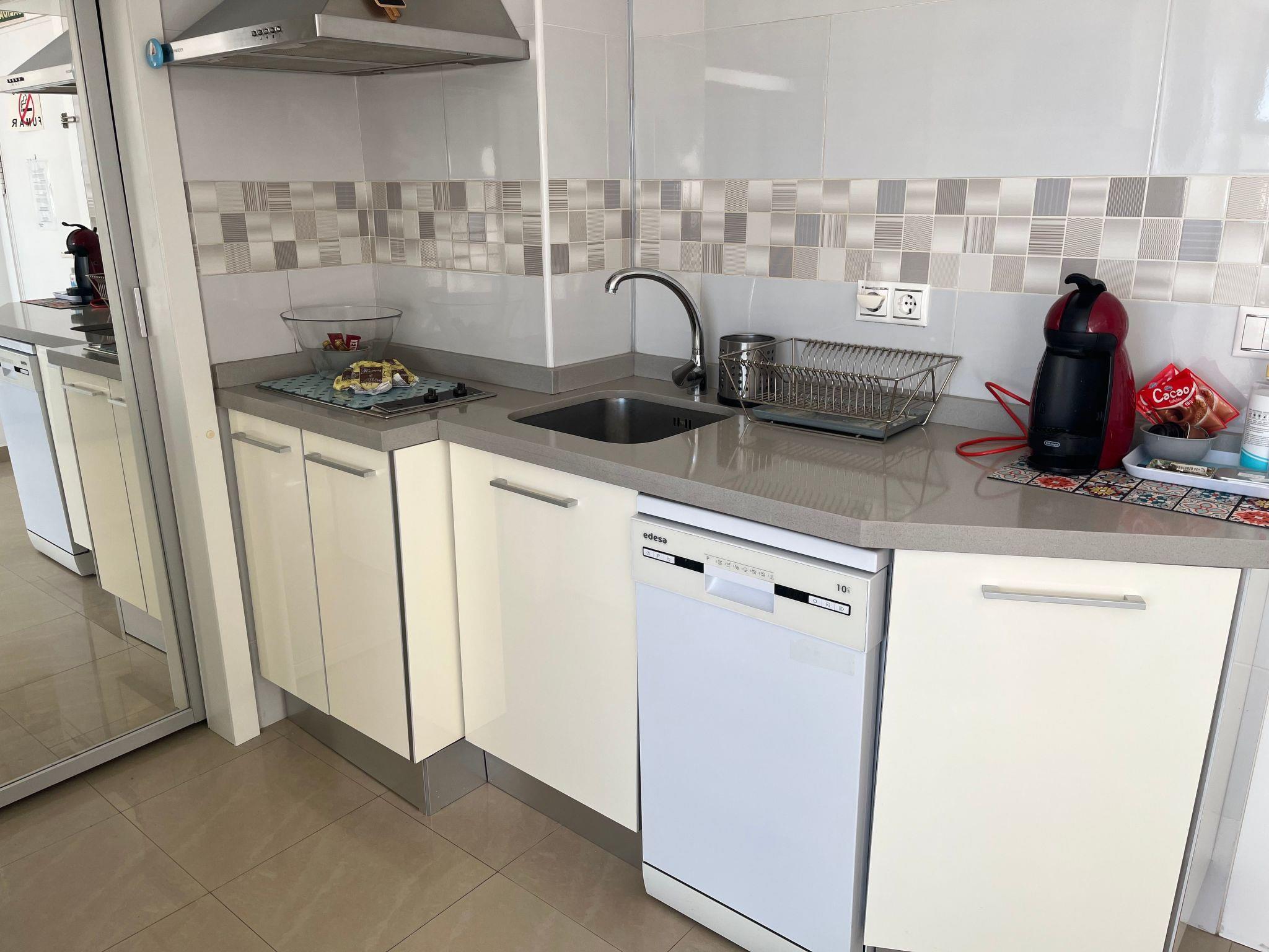 It is an 8th floor with clear views of the Mediterranean. 200m from the beach, with bus stops, supermarkets, pharmacies and restaurants. 3 swimming pools of various sizes and solarium with green areas of natural grass.