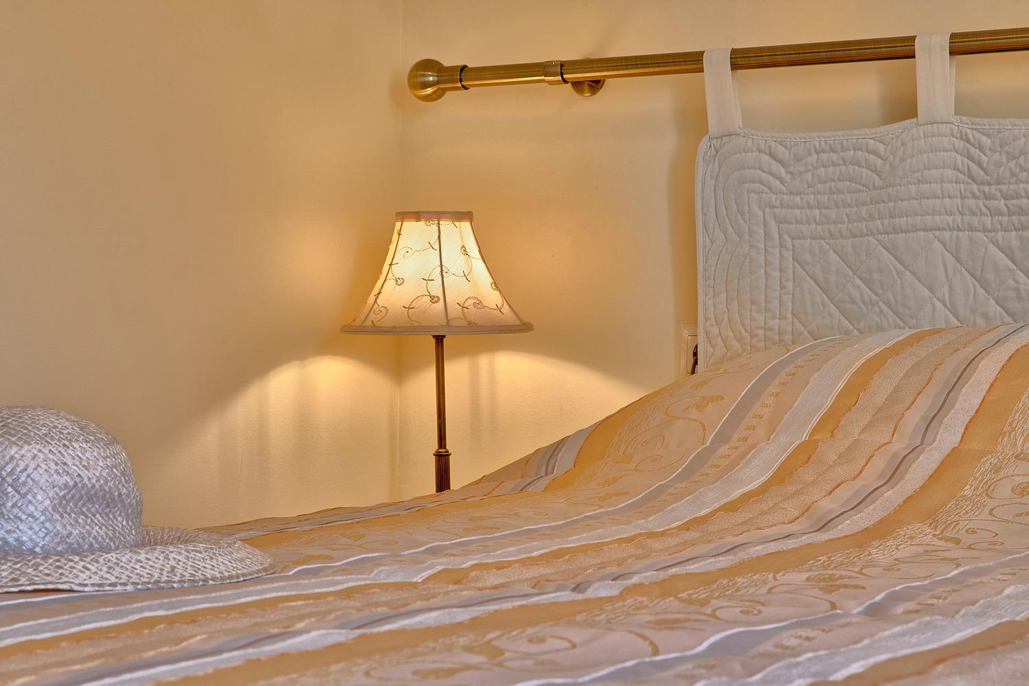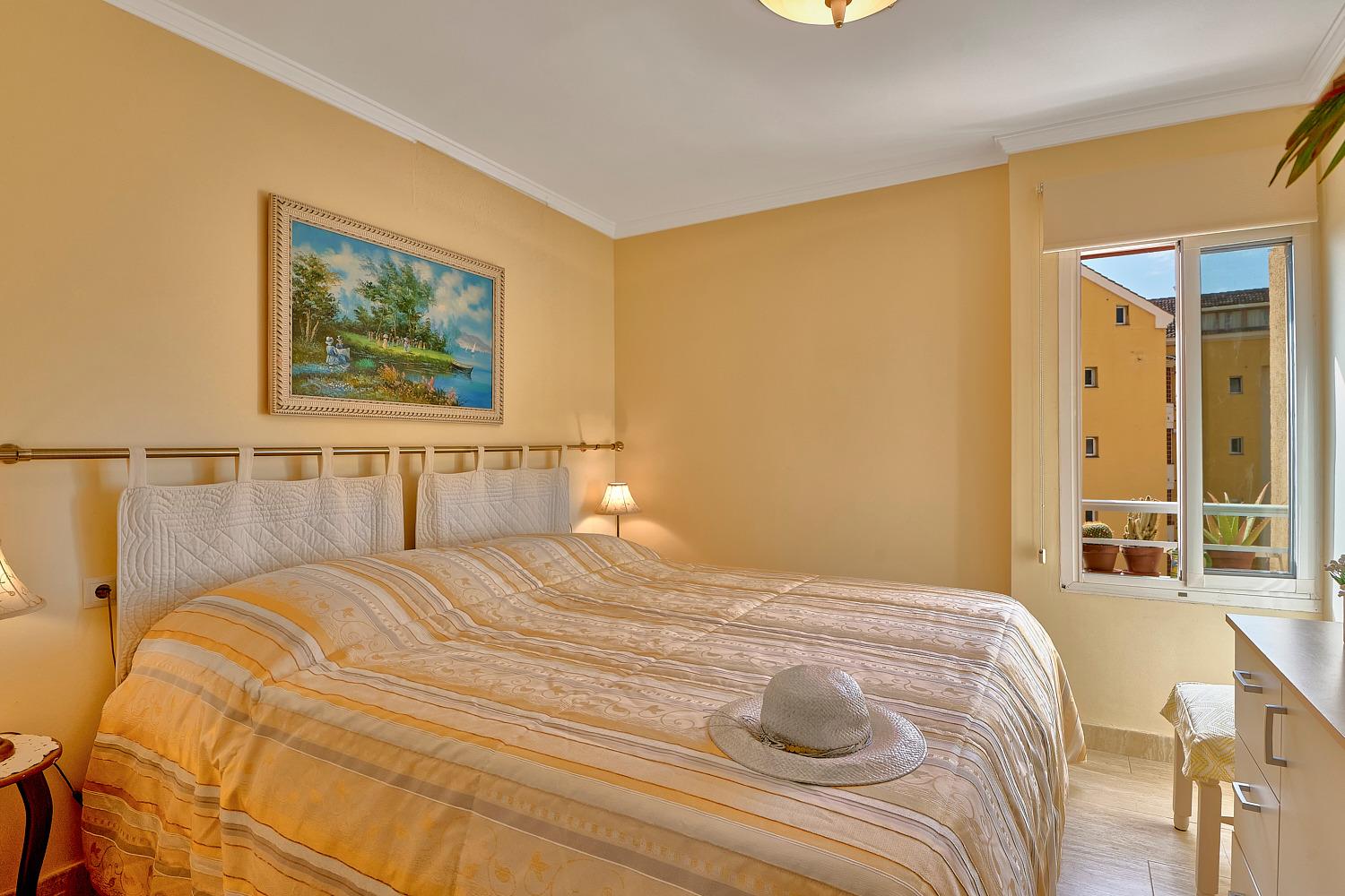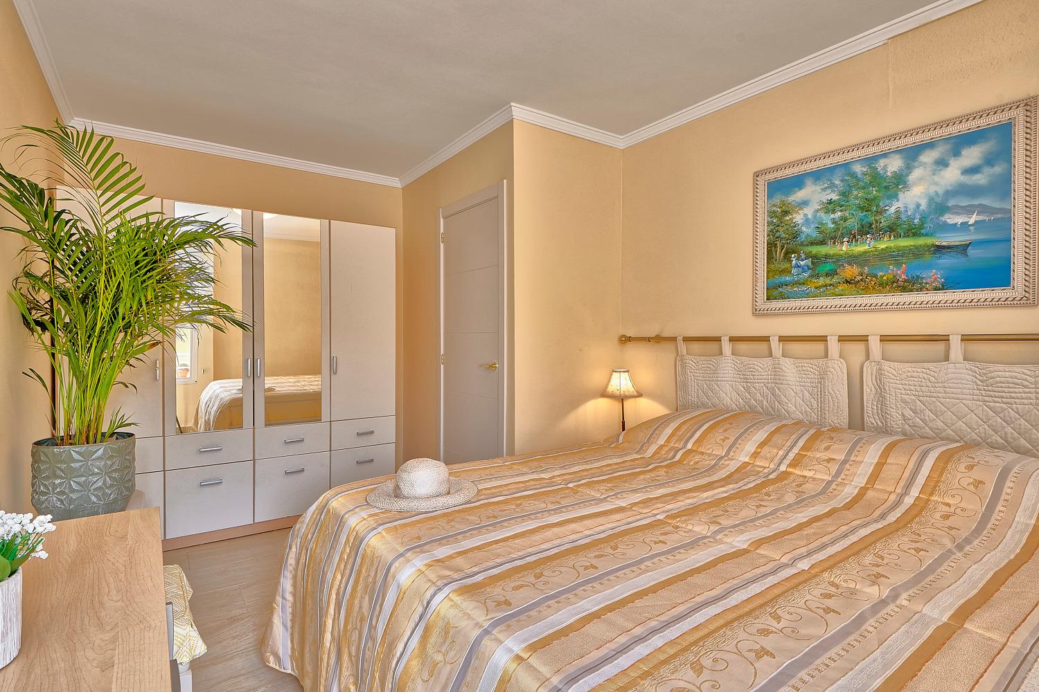Das freundlich eingerichtete helle Schlafzimmer mit Meerblick Richtung Süden bietet zwei Erwachsenen Platz auf einem Doppelbett mit zwei separaten Matratzen guter Qualität und Massen von je 90x200 cm. Ferner befinden sich hier ein viertüriger Spiegel-Kleiderschrank mit ausreichend Kleiderbügeln, Bügelbrett und Bügeleisen sowie eine Schubladenkommode. Auch hier im Schlafzimmer gibt es Flachbildschirm-TV.