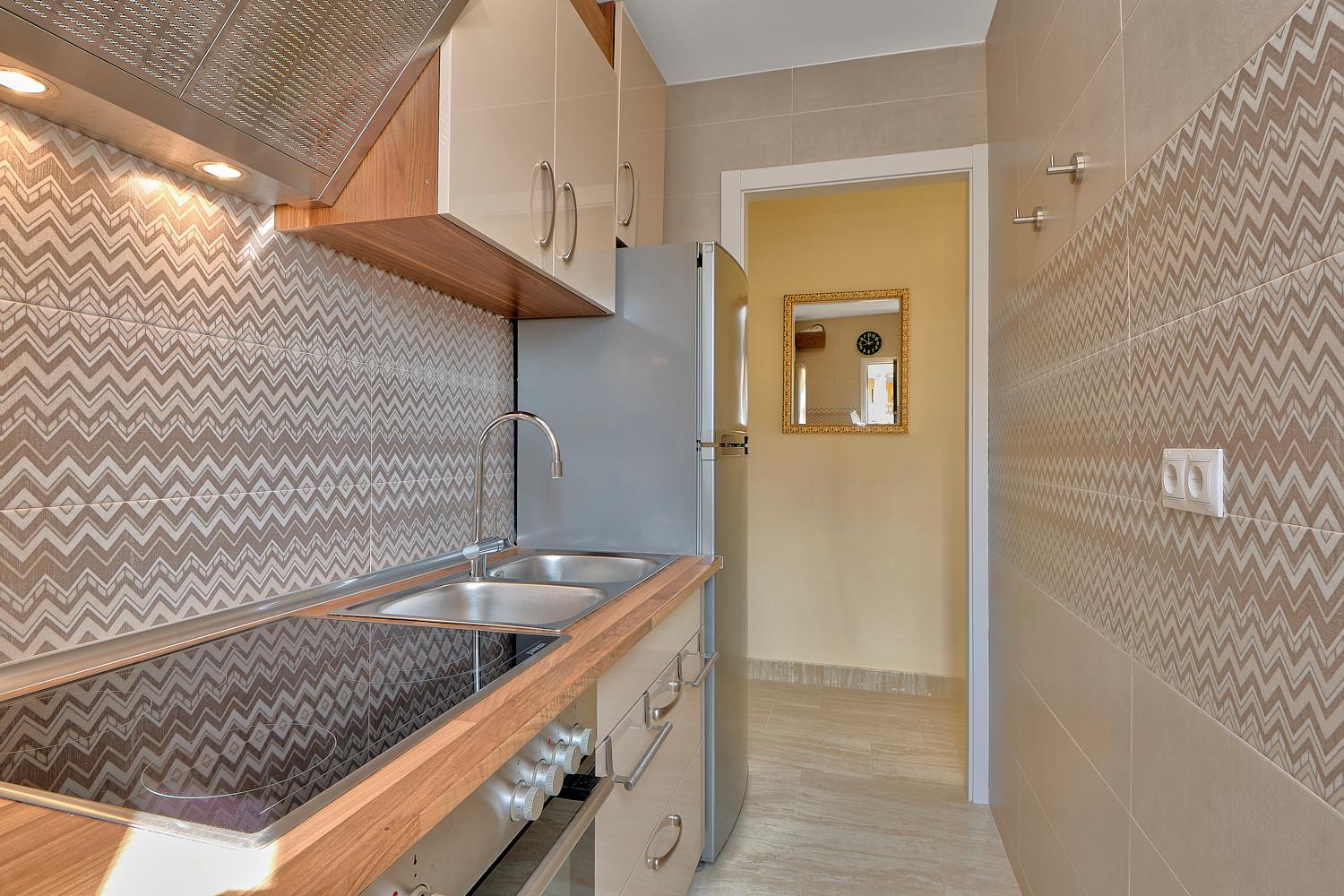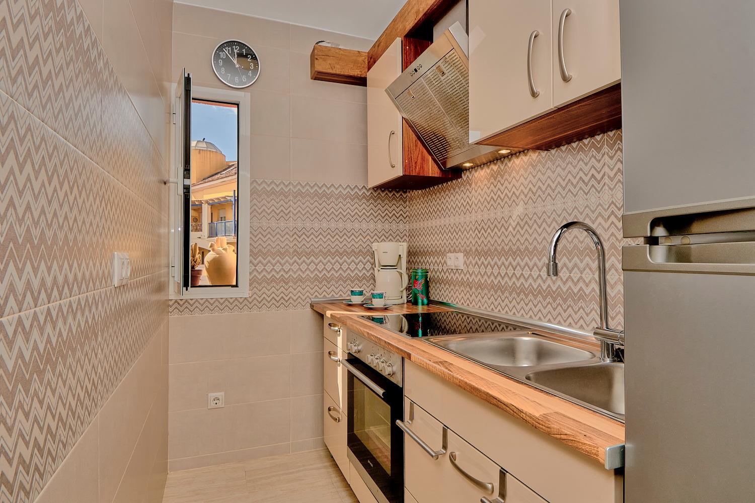 In der Küche mit Südfenster und Meerblick findet der Gast alles vor, um sich uneingeschränkt selbst versorgen zu können, wie Ceranherd mit Dunstabzugshaube, Backofen mit Backutensilien, Kühlschrank mit separatem Gefrierfach und selbstverständlich Kaffeemaschine (Filter), spanische Espressokanne, Wasserkocher, elektrischer Eierkocher, elektrische Saftpresse, Handmixgerät und Pürierstab. Es versteht sich von selbst, dass auch Kochtöpfe, Bratpfannen , Besteck, Eierbecher und sonstiges Küchenzubehör vorhanden sind.