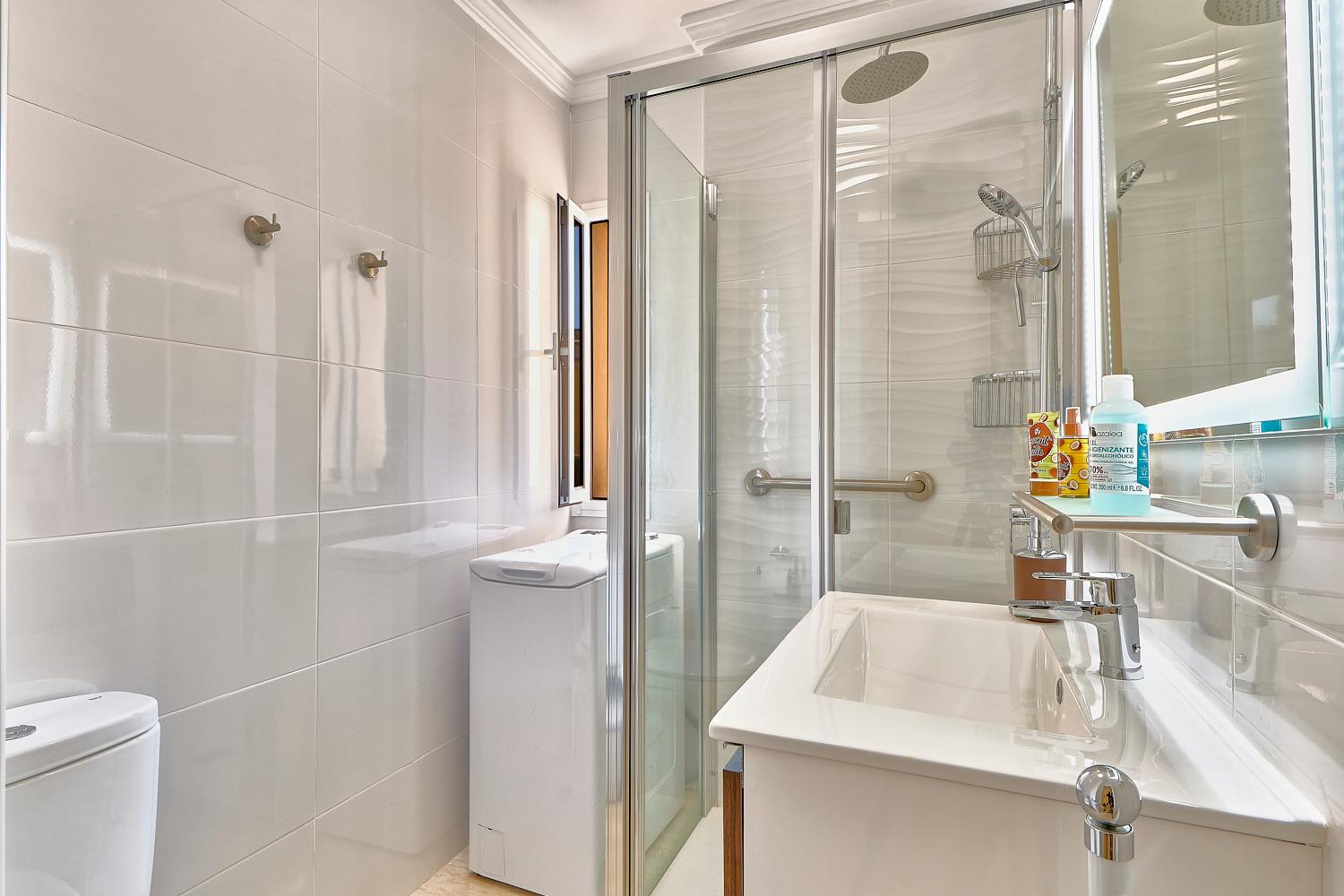 Im hellen Badezimmer mit Südfenster und Blick aufs Meer kann der Gast sich unter einer Regendusche erfrischen und entspannen. Es stehen auch Bademäntel, Haarfön und Waschmaschine (Toplader) zur Verfügung.